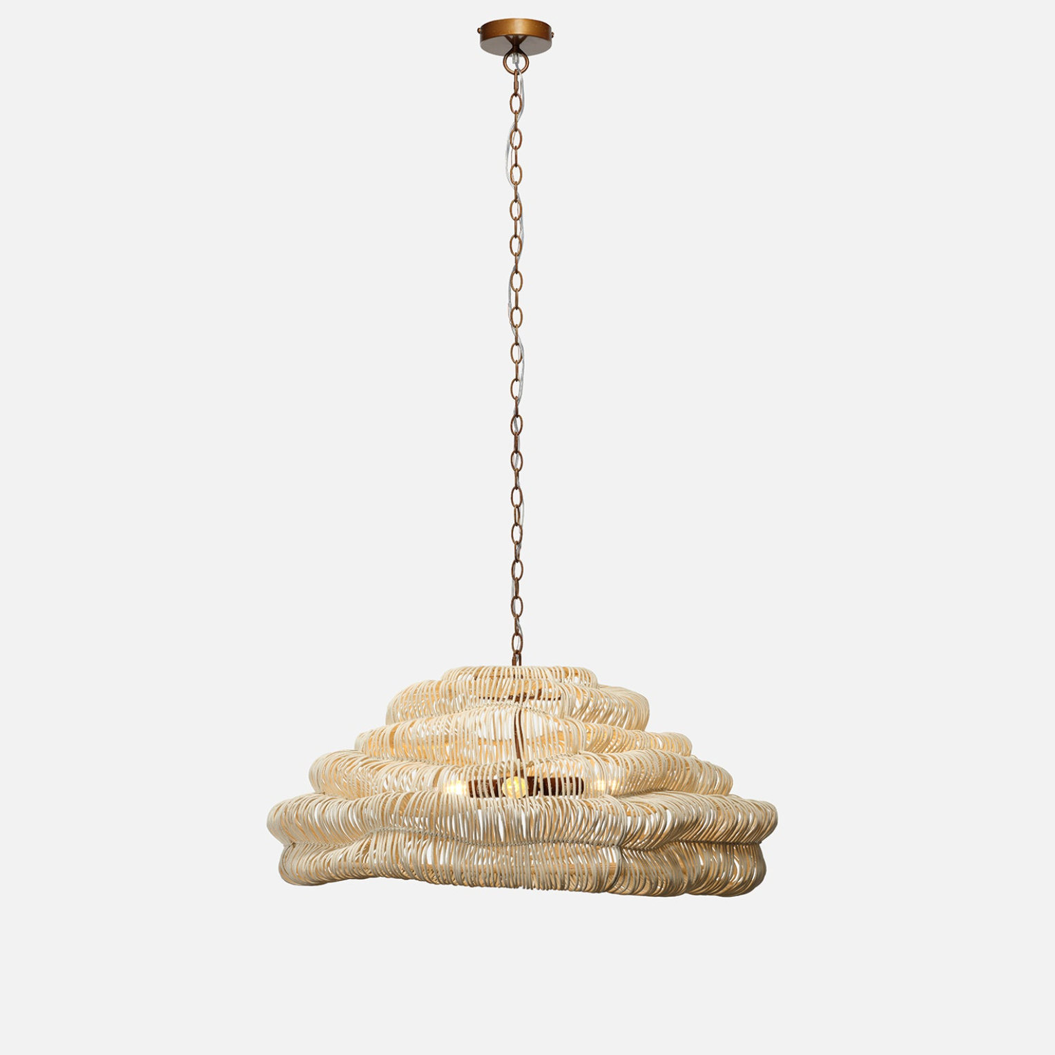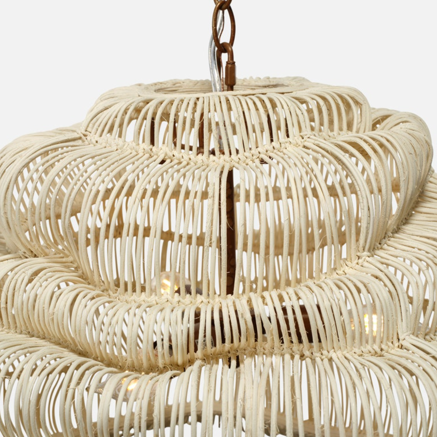 The Bettina chandelier features layer upon rippling layer of rattan, arranged in billowing strips to allow light to peak through and cast artful shadows around the room. Natural variation to be expected.