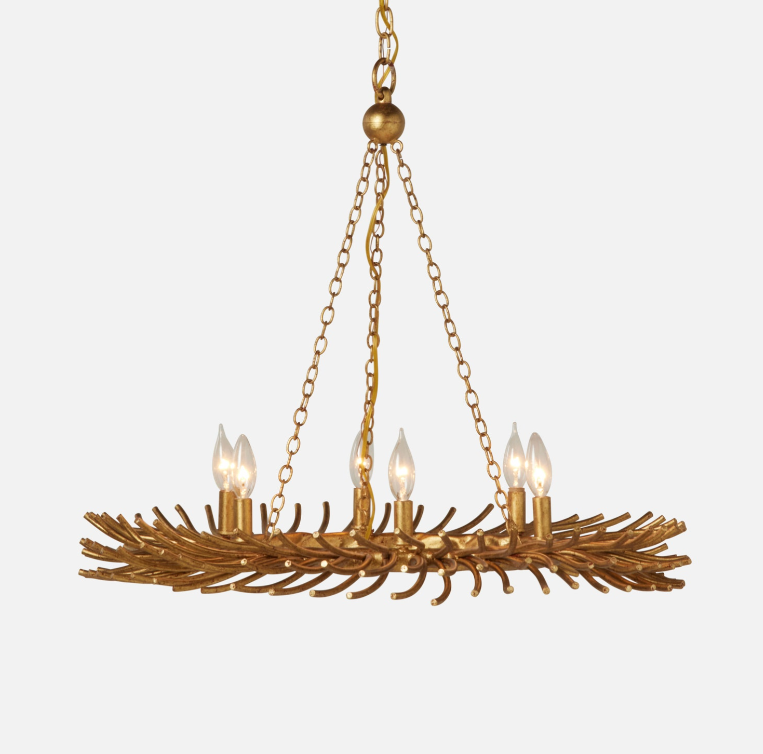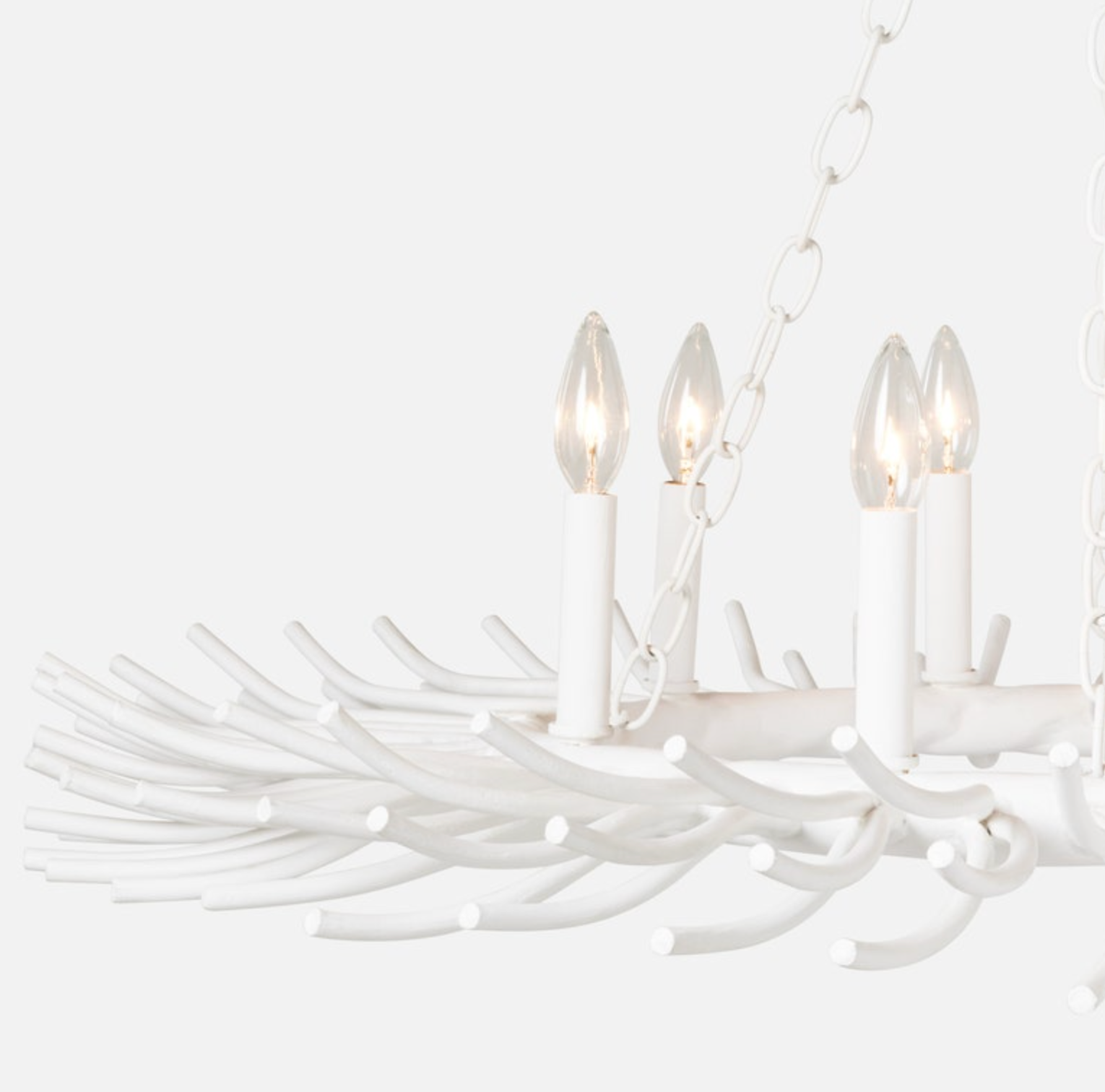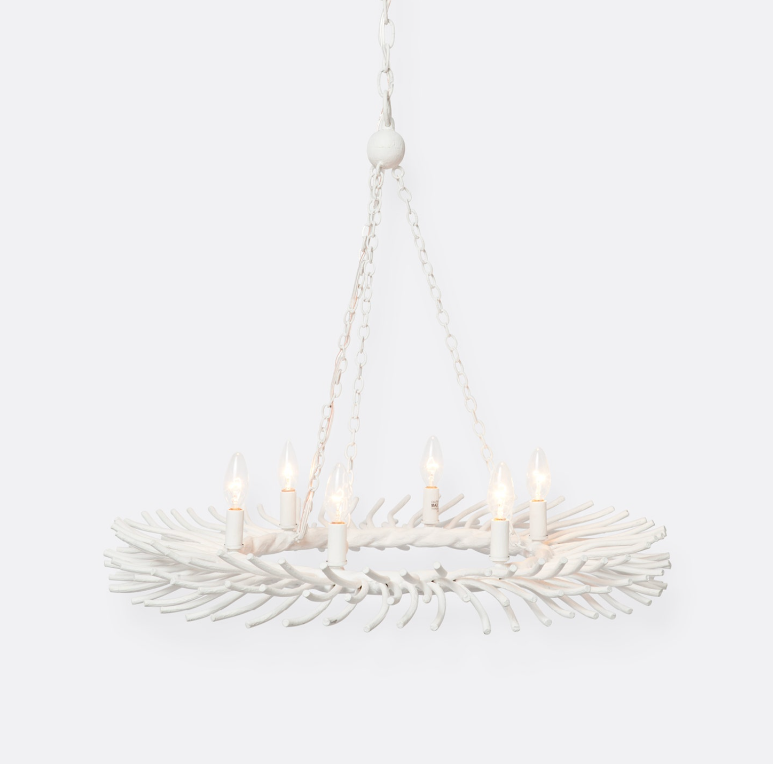 Inspired by nature but so much more. Pairs of gently curved gesso spires radiate outward from a center ring. Topped with six delicate lights, the Bruna truly represents Made Goods' distinct point of view and is a customer favorite!