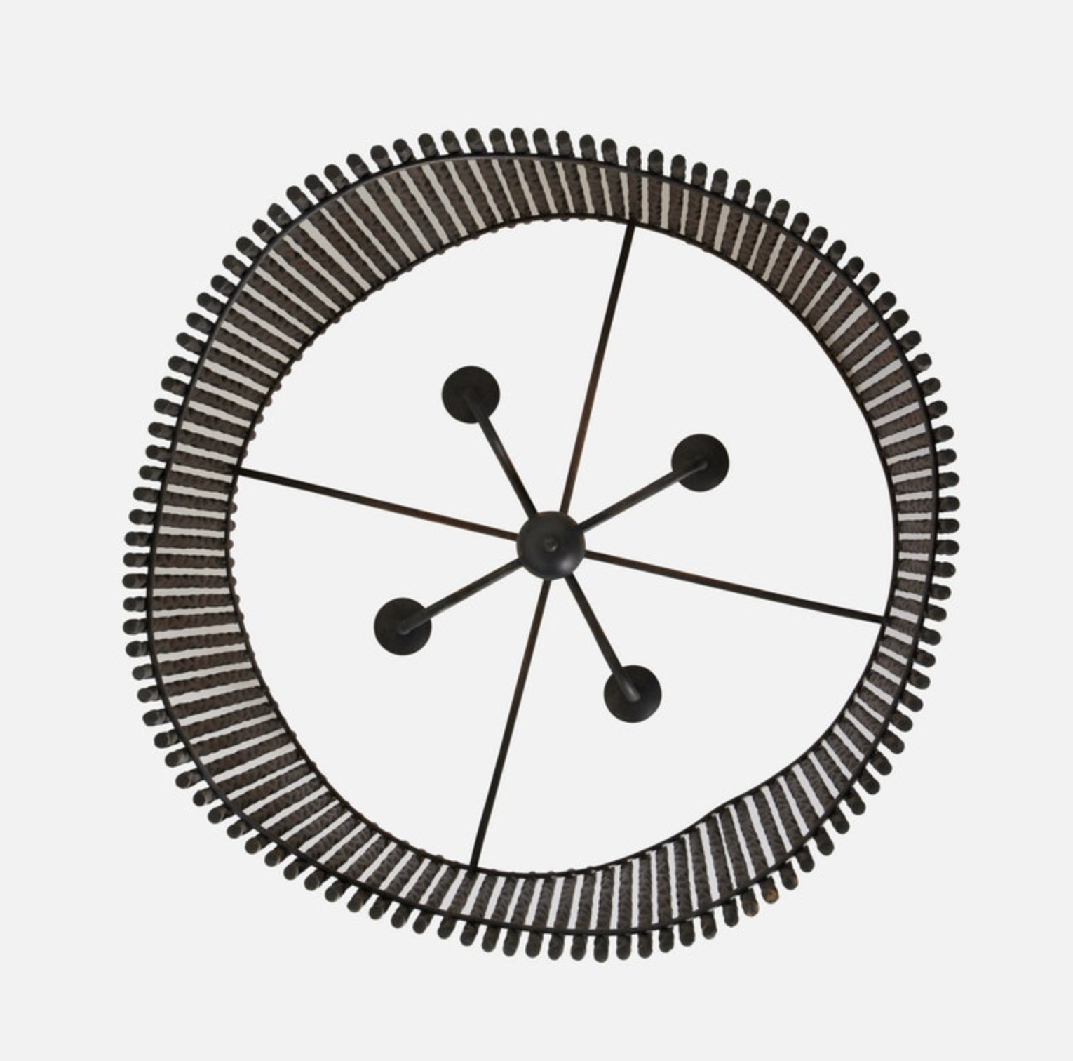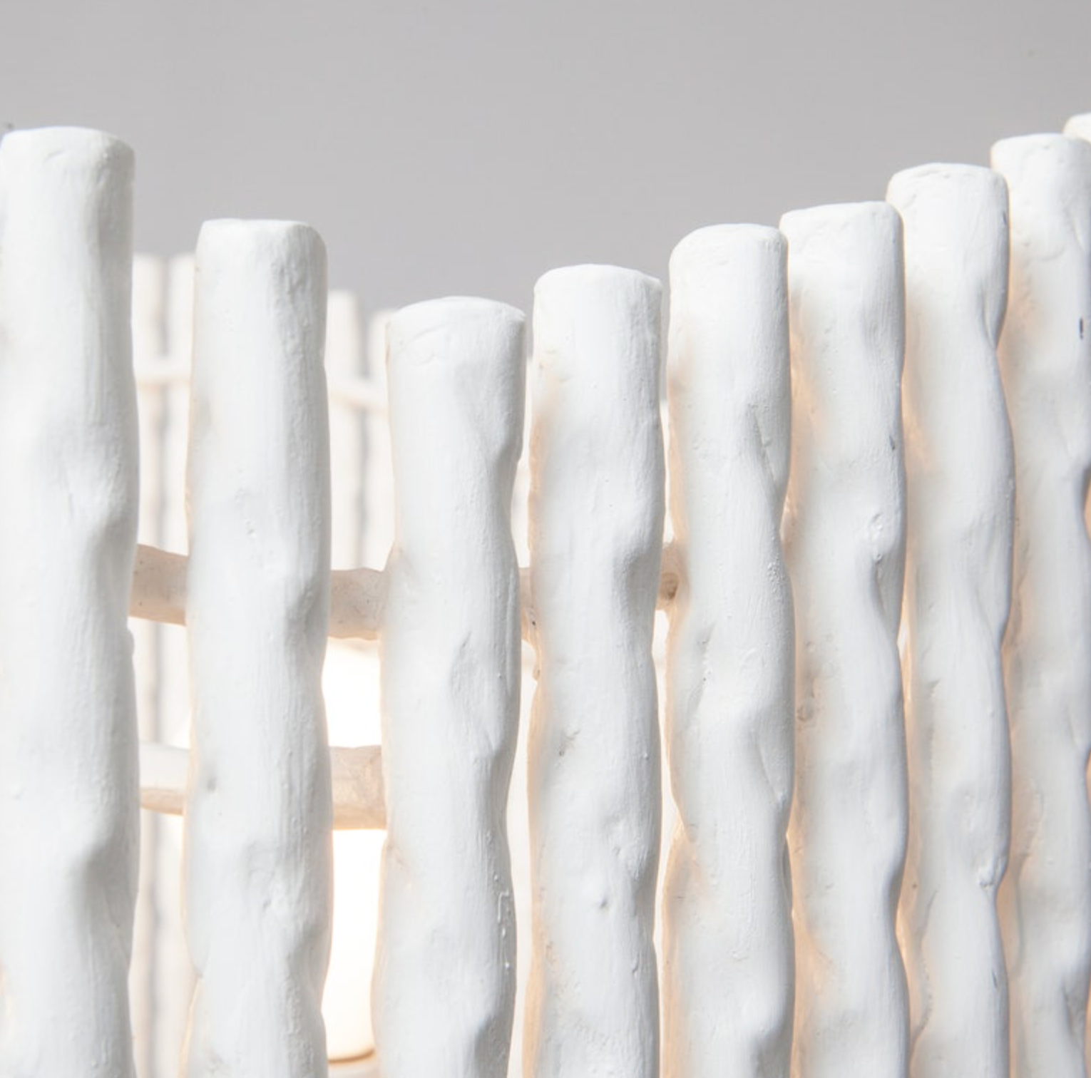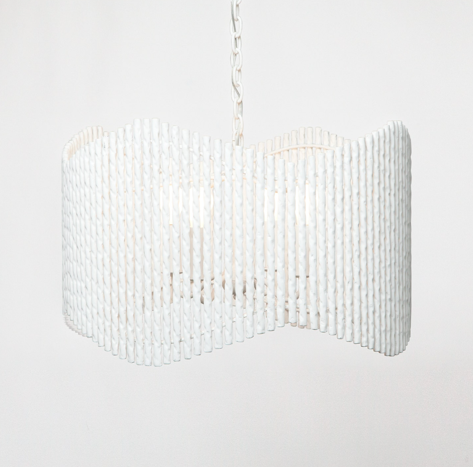 A modern shape with a beachy vibe, the Camille is a piece that catches the eye without taking over a room. The twisted plaster bars are wonderfully detailed, alternating dimensions with the flow of the chandelier.
