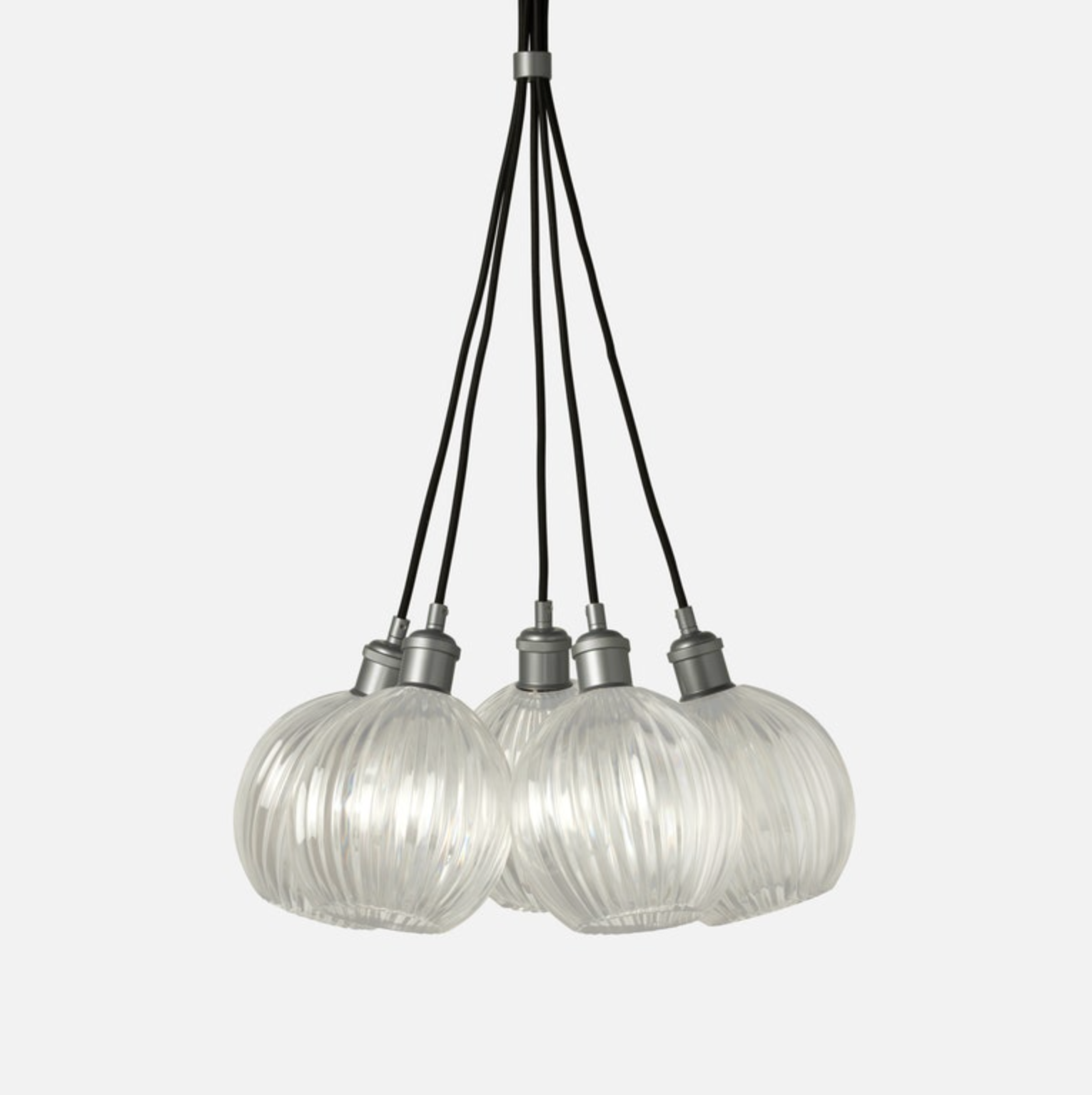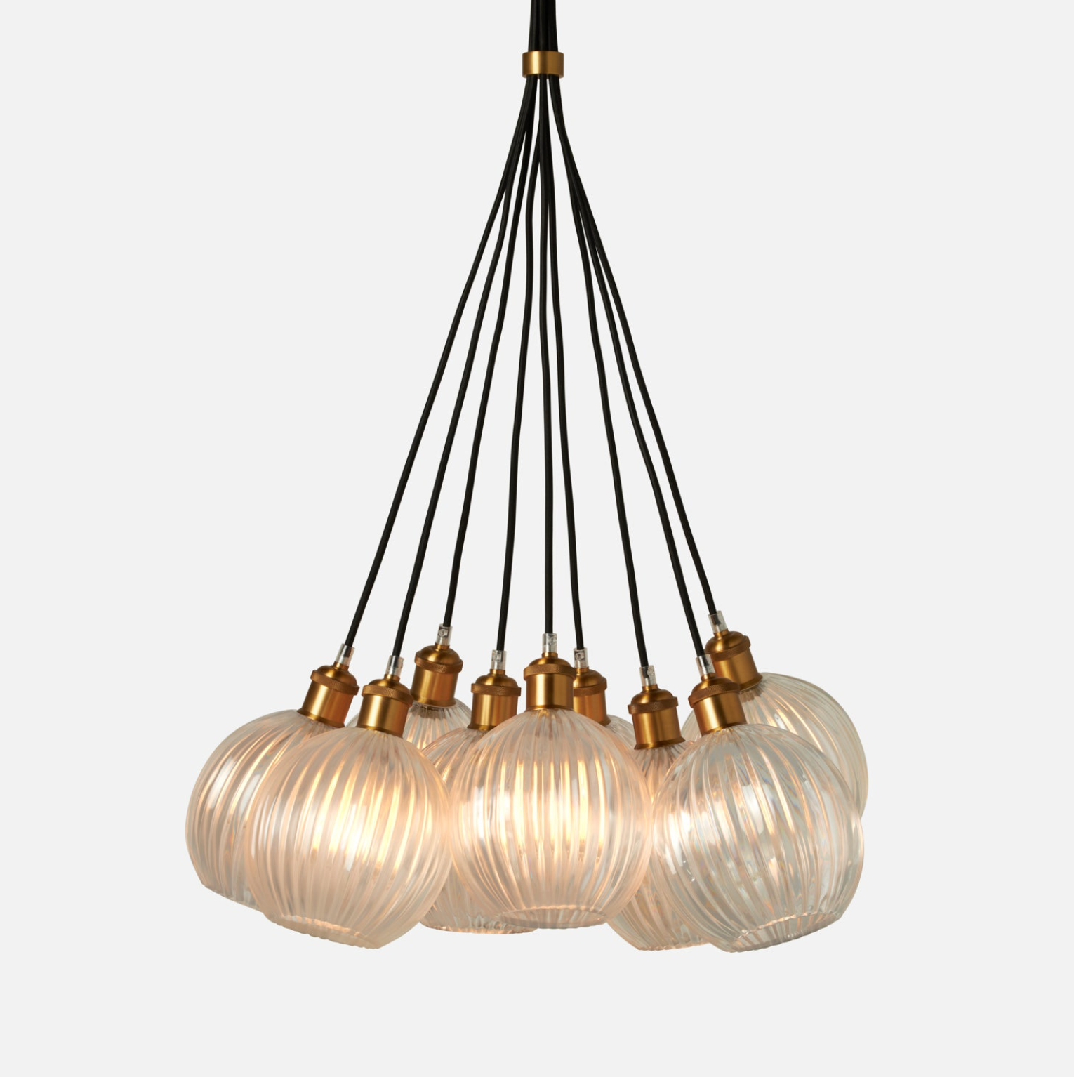 The more the merrier with Dax, a pendant that is available as a stand-alone piece or in groupings of five or nine. Round, grooved resin shades- in clear or white - and metallic hardware make for a classic combination.