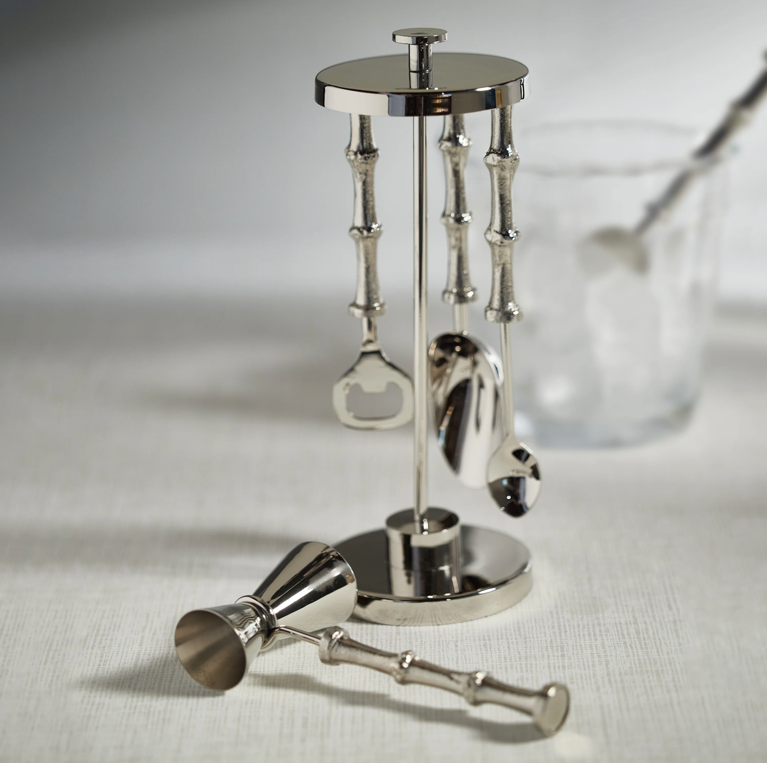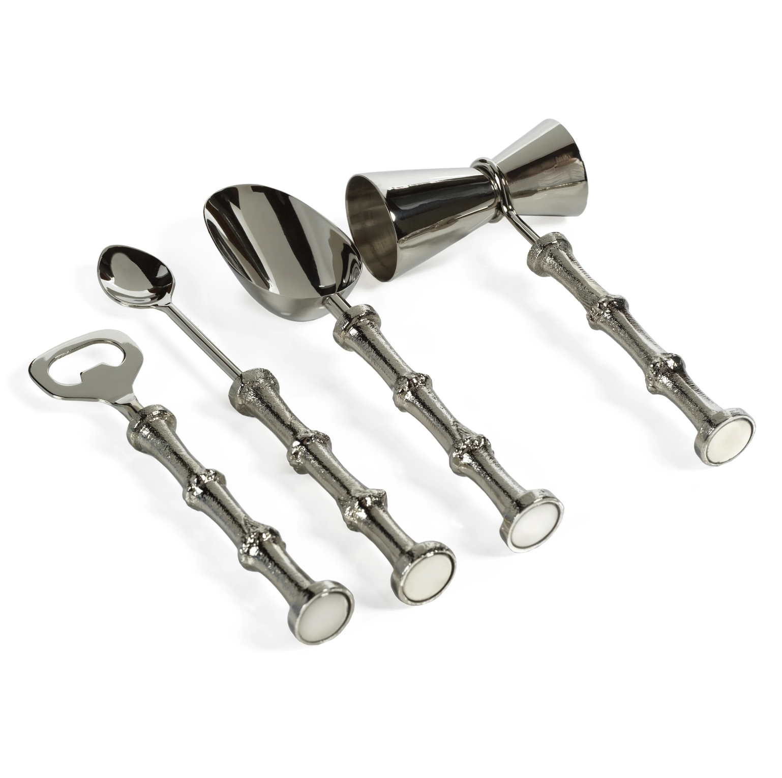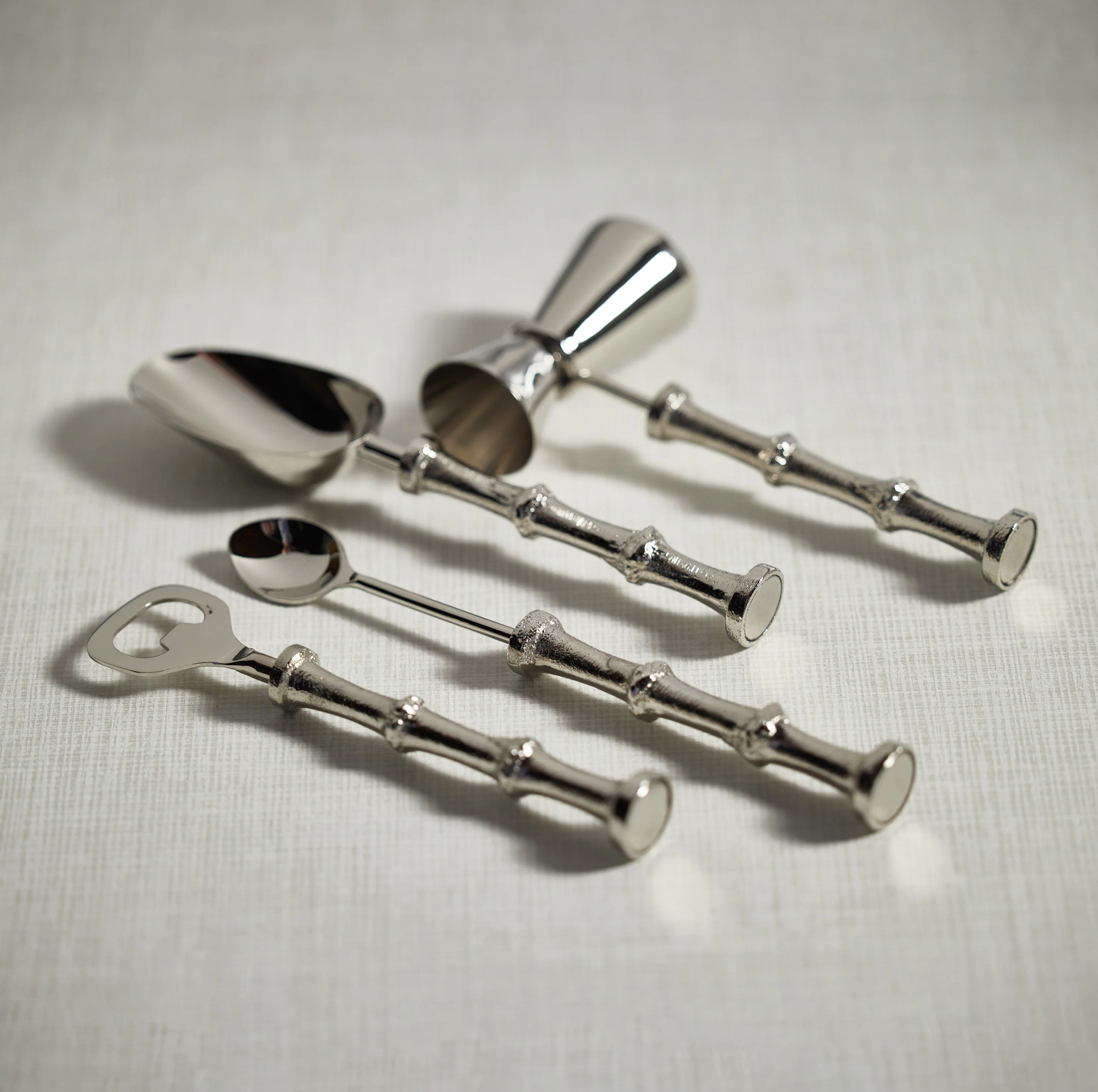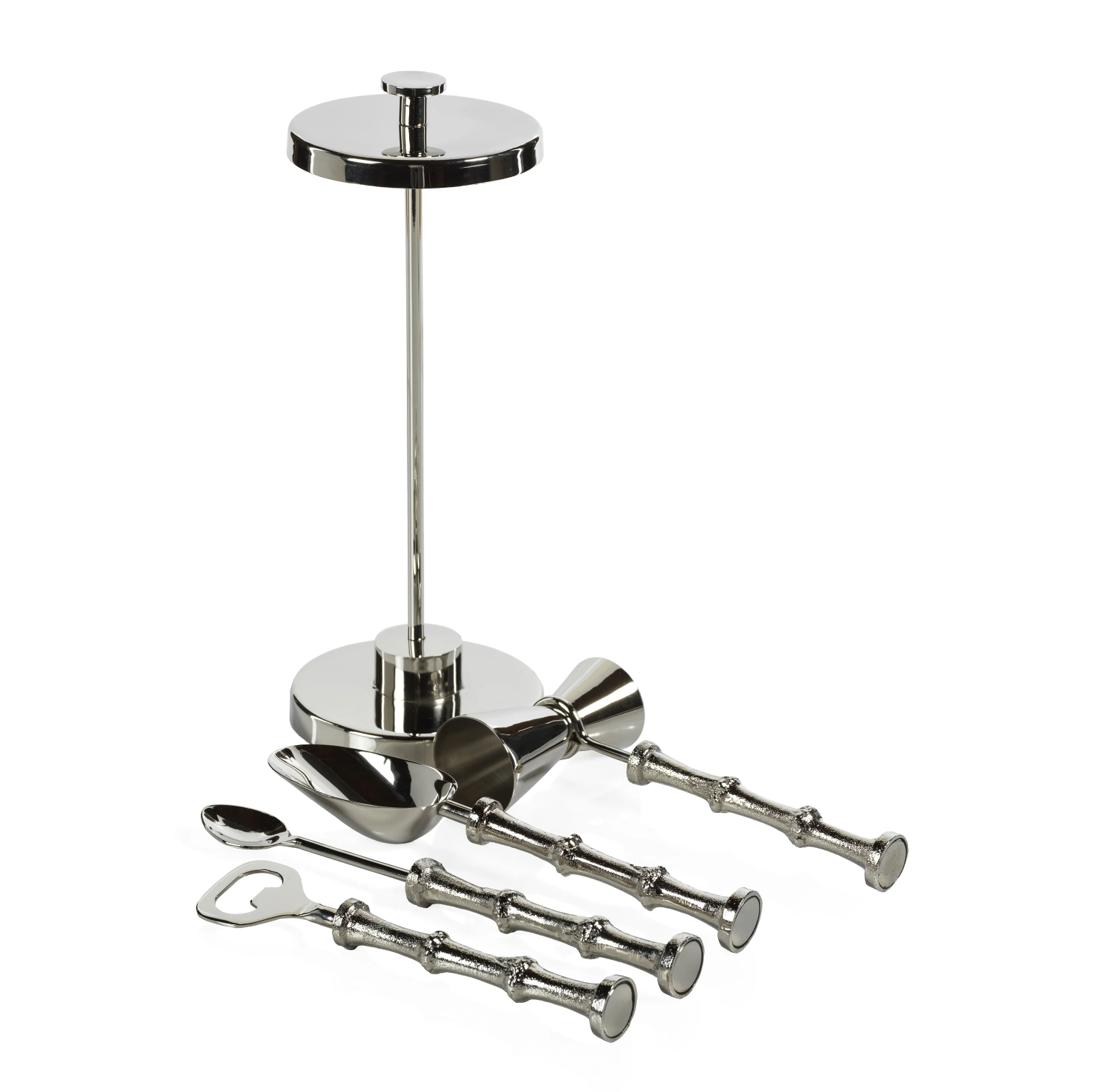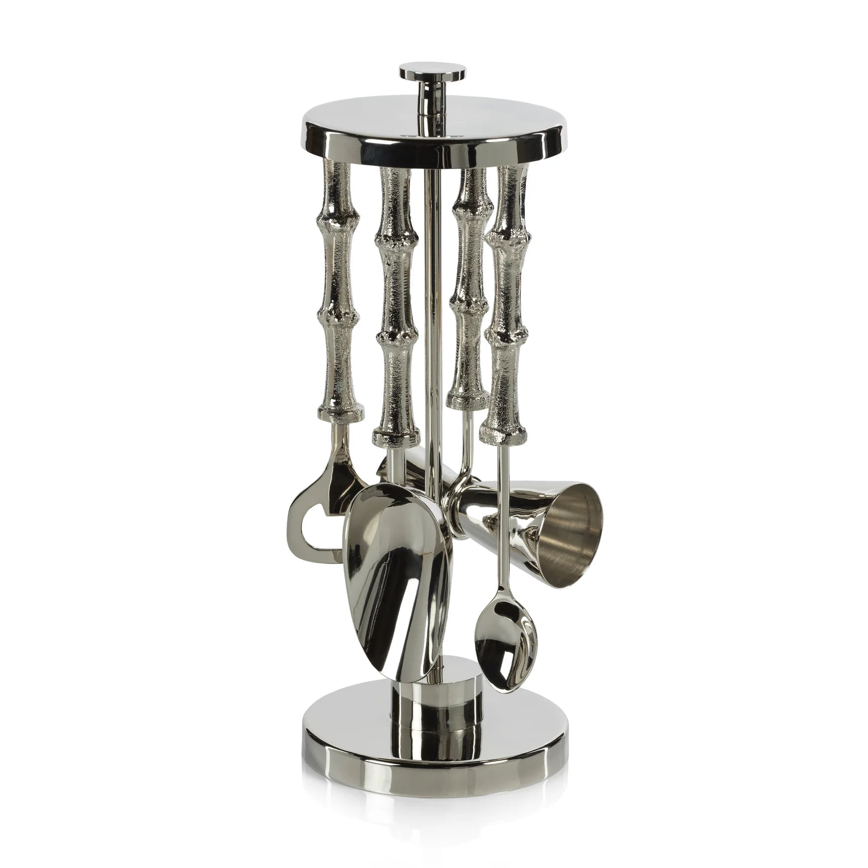 Set Includes: Bottle Opener, Jigger, Ice Scoop, Spoon & Stand