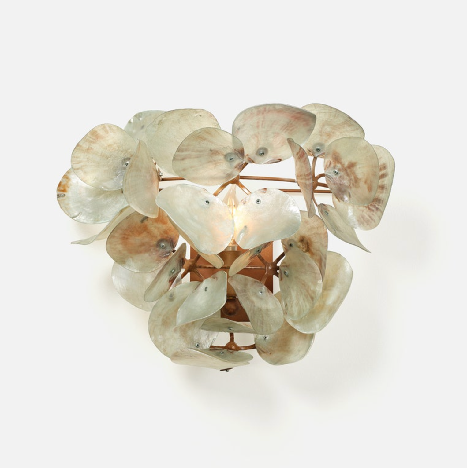 This statement sconce is a true work of art. Saddle oyster shells are hand-placed in florets, creating a highly crafted effect that makes each organic-looking Venus one of a kind.