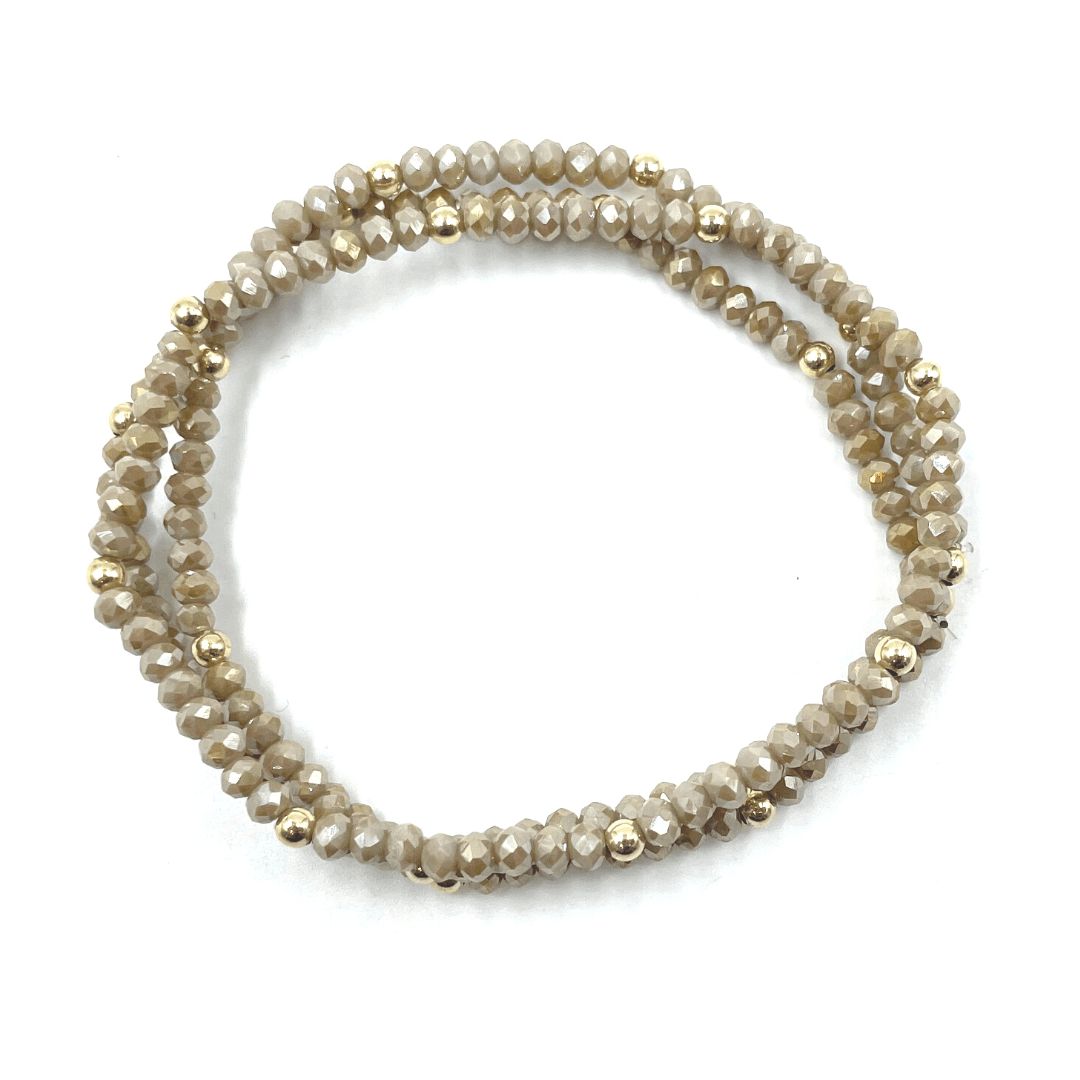 Our classic shimmer 3-stack bracelets in champagne sparkle, dotted with 14k gold-filled 3mm beads. A classic favorite that stacks well with others.