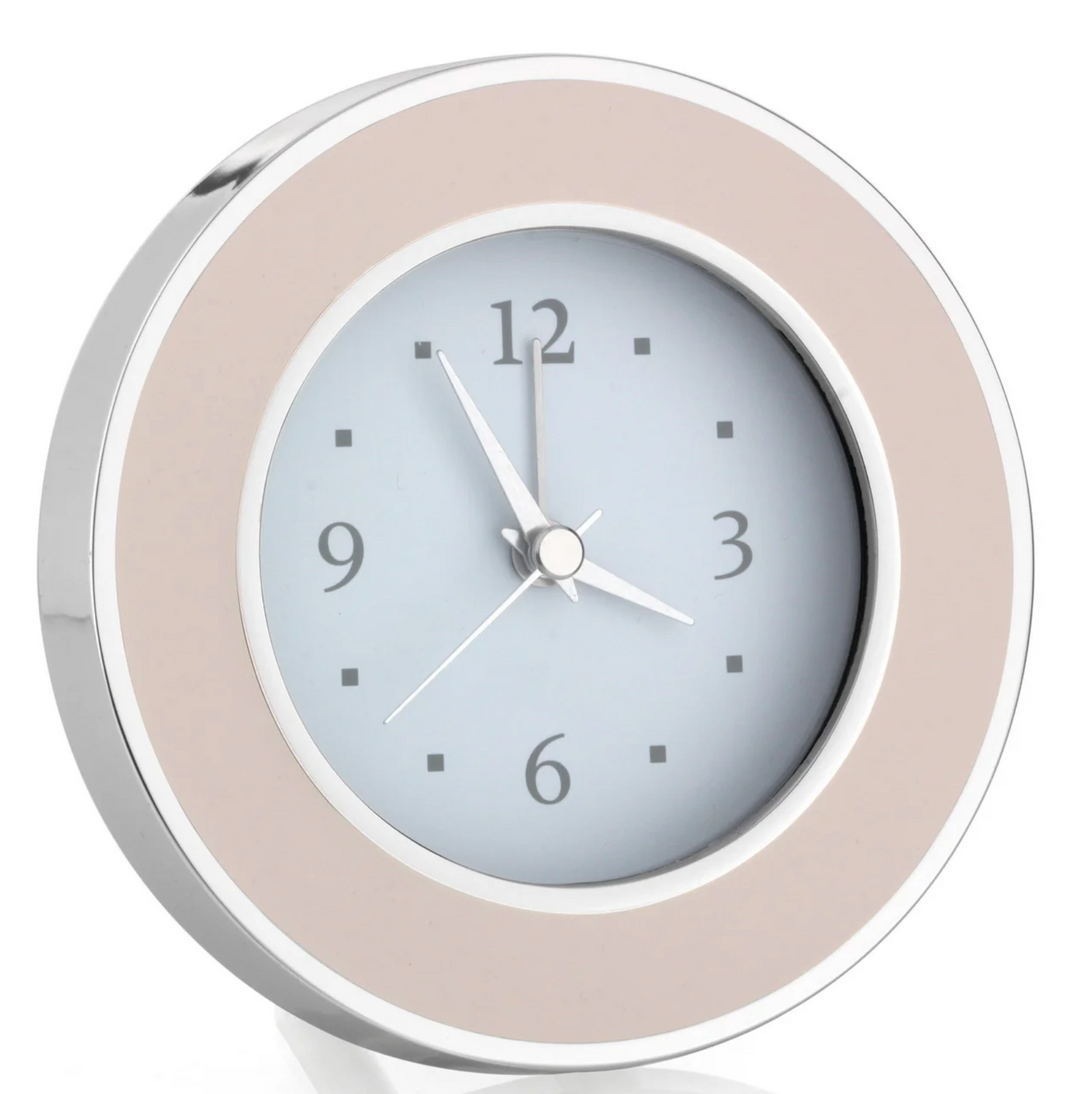 ALARM CLOCK TAUPE ENAMEL & SILVER ROUND #40770