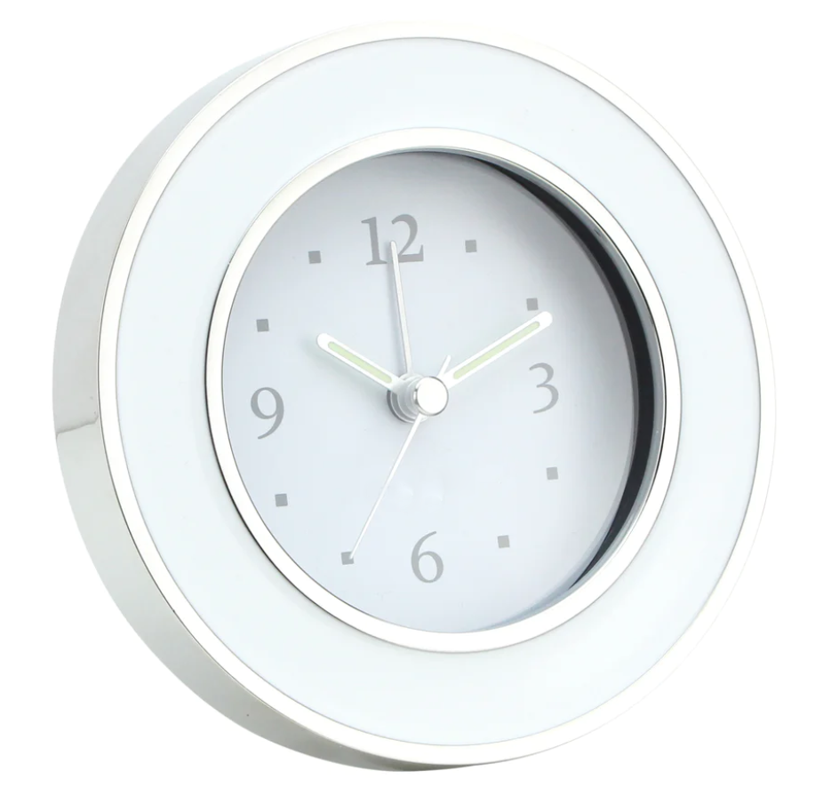 ALARM CLOCK WHITE ENAMEL & SILVER ROUND #40771
