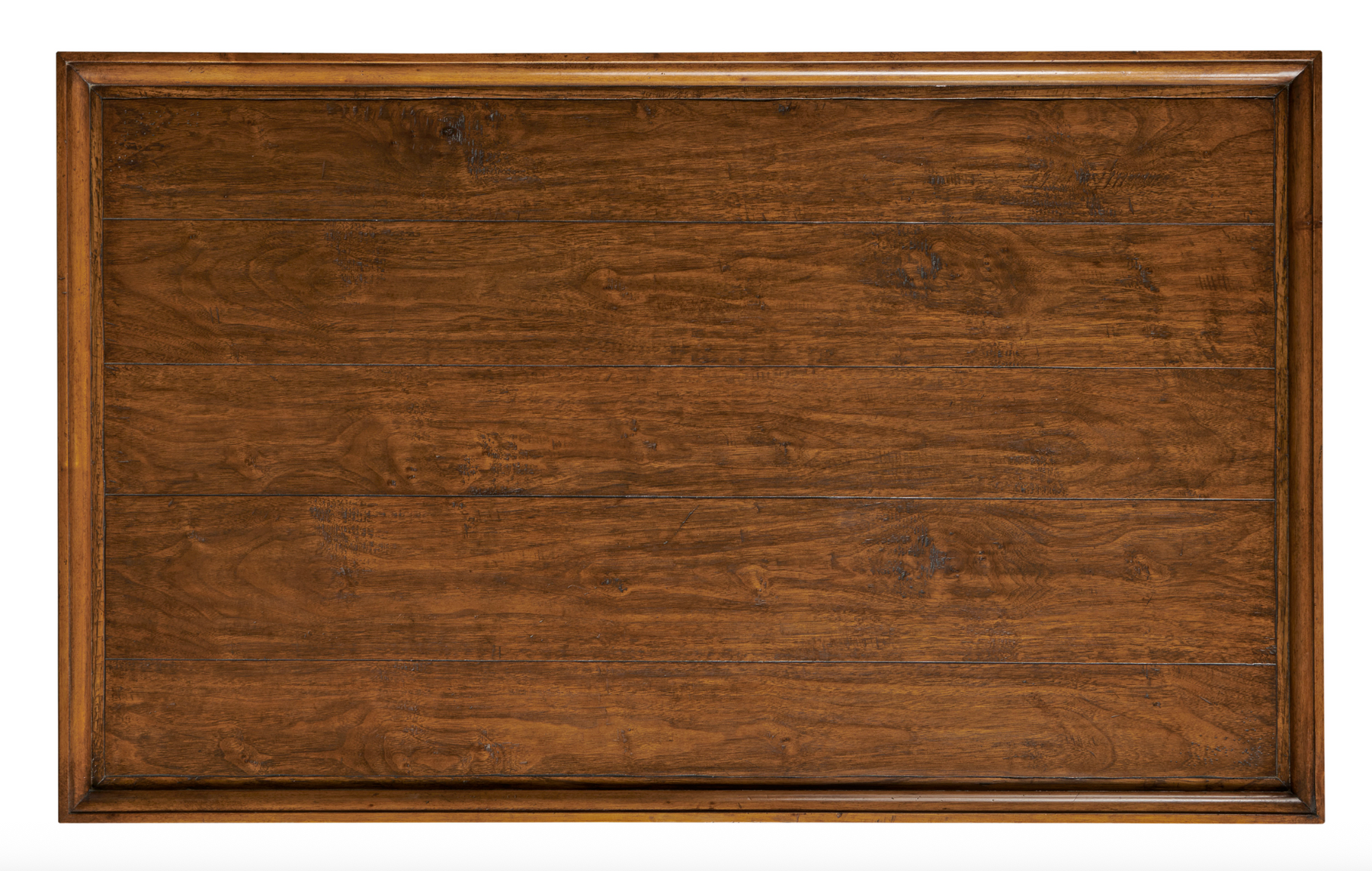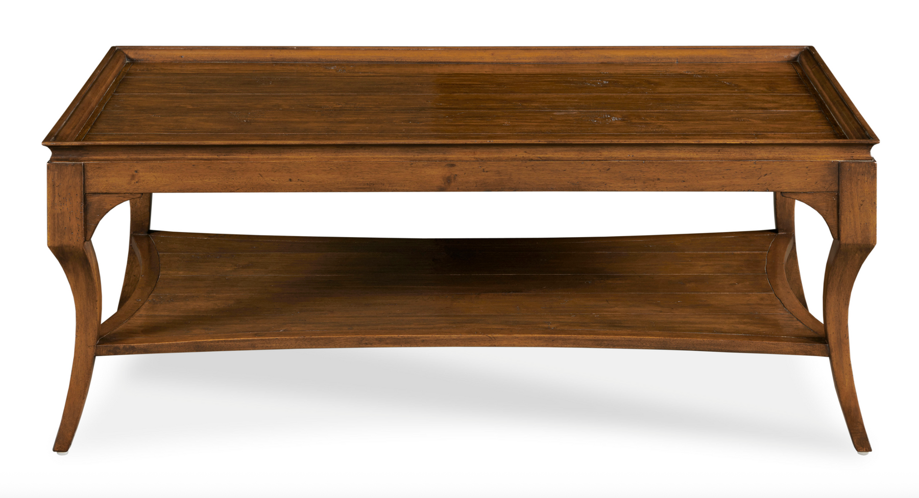 A slightly cleaner approach to a classic traditional form, the Hamilton Cocktail table features a saber leg, curved ends on the lower shelf and a flared tray top. Mahogany Solids with Walnut Placage planked infield on the top all finished in a warm Mahogany finish.