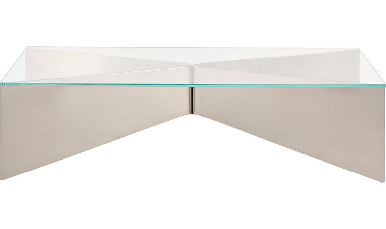 The Lila Cocktail Table is an artful take on the design of an envelope. Two geometric sections of Nickel Plated Brass join to form its base, supporting a tabletop of beautiful Starphire glass.