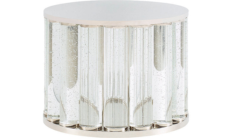 Crafted in nickel plated brass and crystal, the Menlo Cocktail Table is inspired by baguette diamond bracelets. Its cylindrical shape fractures the light, creating a 360-degree showcase of luminous crystal detailing.
