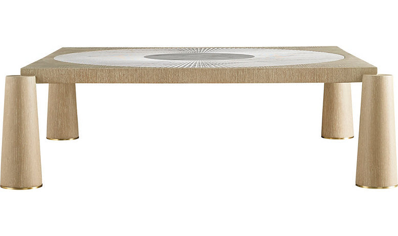 The Cirque Cocktail Table is a piece like no other, with an inset carved marble disc radiating from the center of its surface. Four tapered columns lead the eye to the large square top.