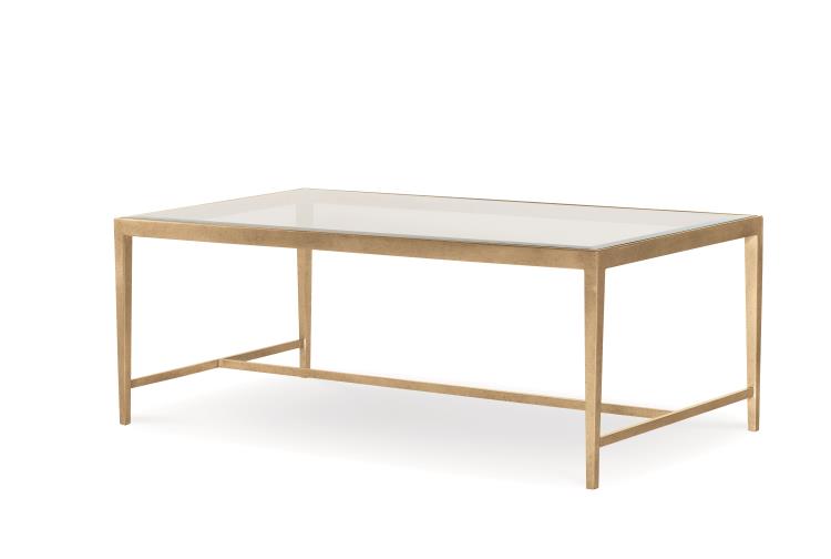 The Century Details Occasional Wynwood Cocktail Table features a champagne finish metal frame with a beveled tempered glass insert. Its 48-inch by 26-inch size makes it an elegant and functional addition to any transitional living space.