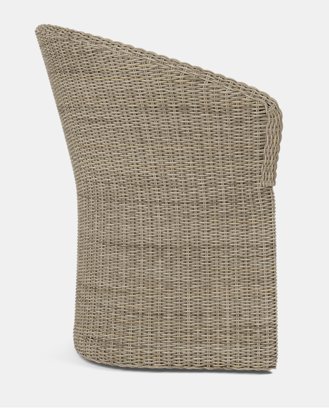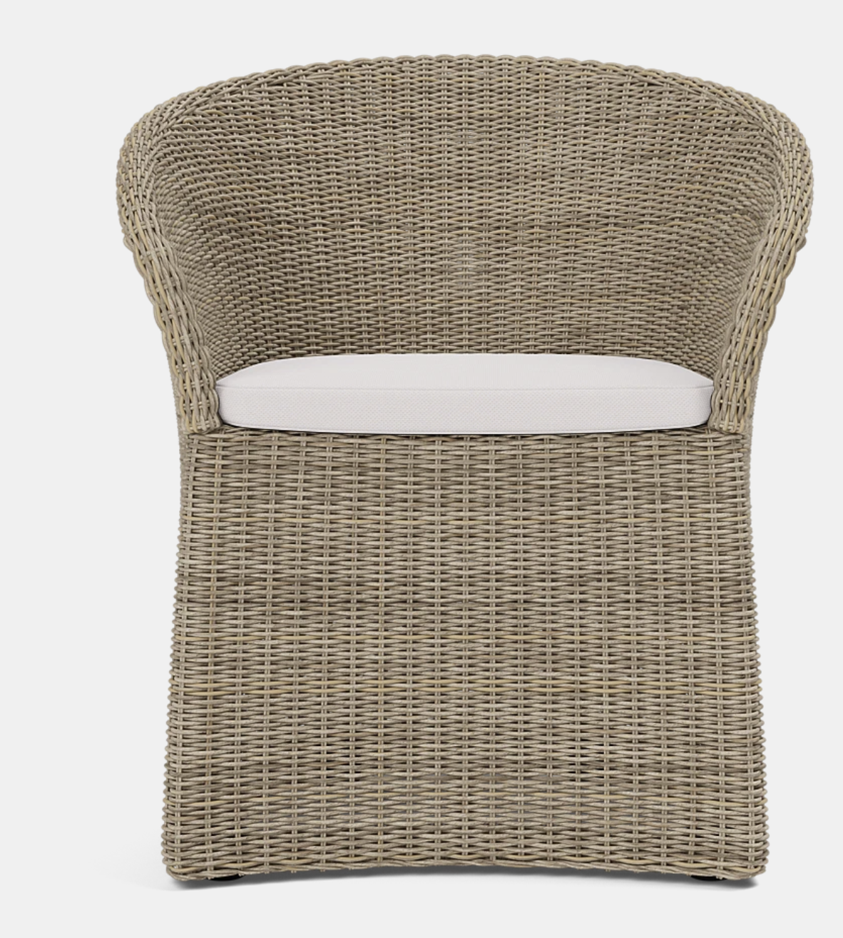 Our Deborah is made from weathered faux rattan with smooth and alluring curves and a swivel. Cushion comes upholstered in our base fabric, Alsek White, or can be upholstered with one of our luxe upholstery fabrics.