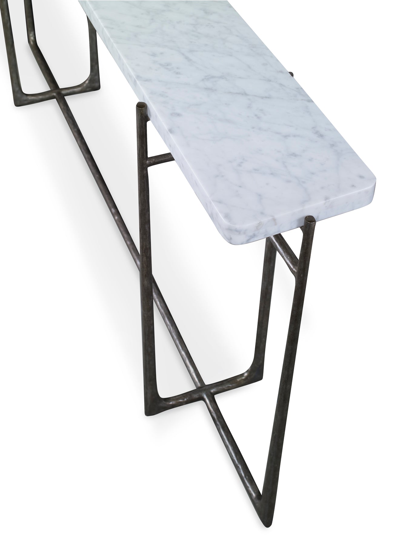 The Calore console table with honed white carrara marble top on textured pewter metal base.