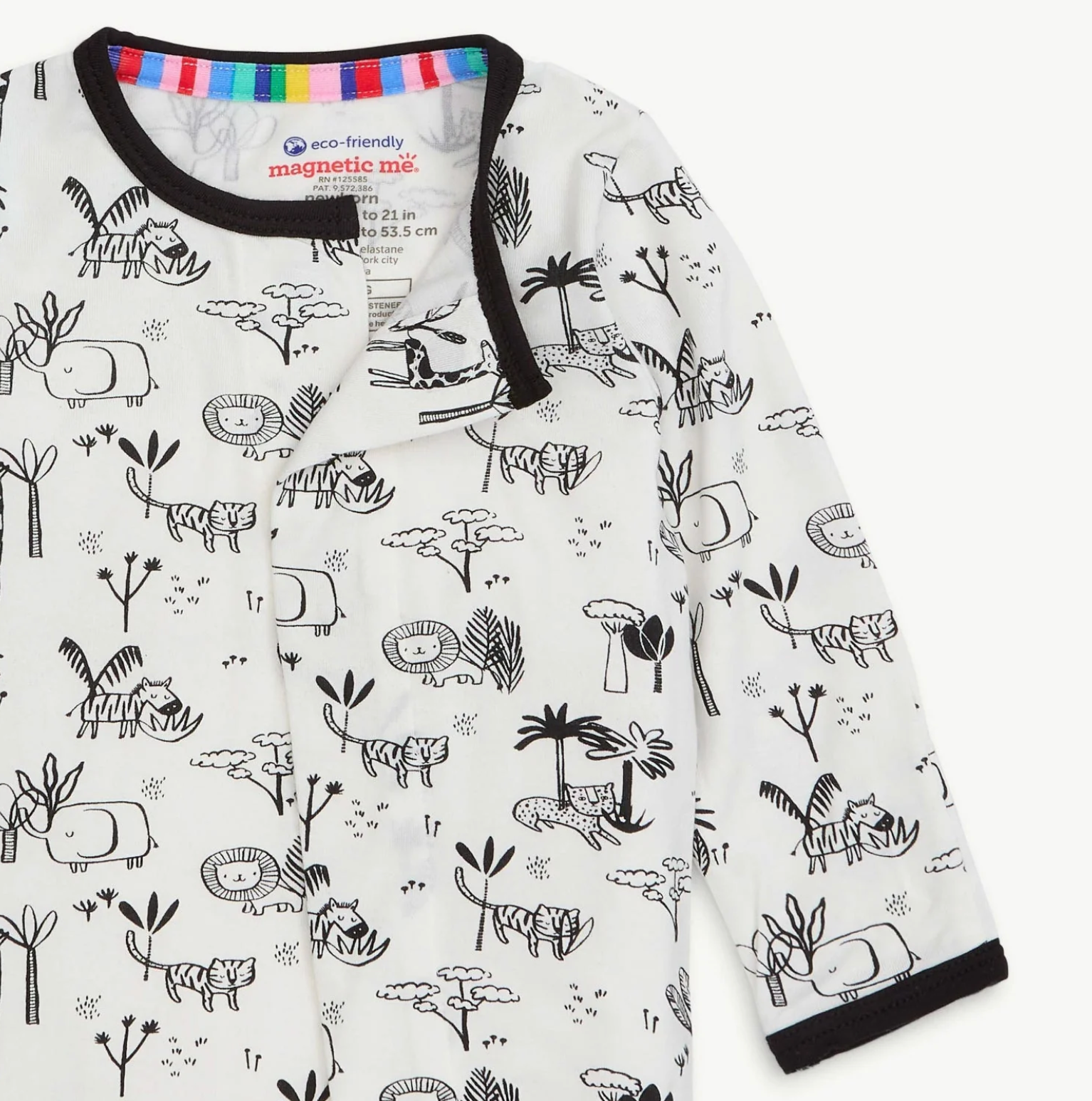 - Magnetic closures: magnets line the seam from the neck to upper thigh for sizes up to 0-3m & from neck to crotch for sizes 3-6m and up.