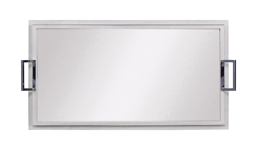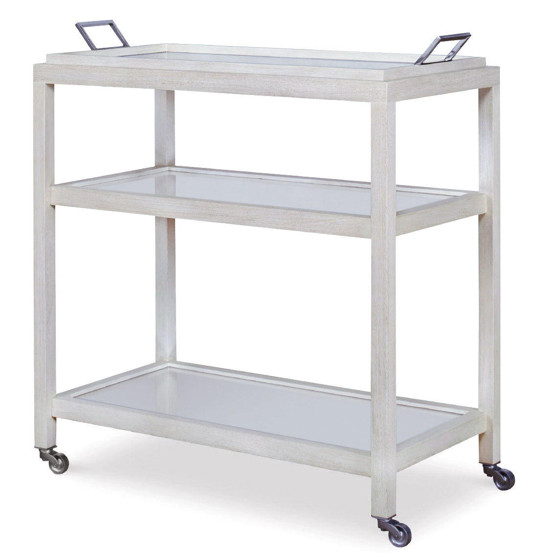 This bar cart is a clean, functional entertainment piece. Polished nickel casters give this bar cart movability while two fixed shelves featuring mirrored insets and one removable top mirrored tray with nickel handles give it plenty of storage capacity for all of your barware and serving pieces.