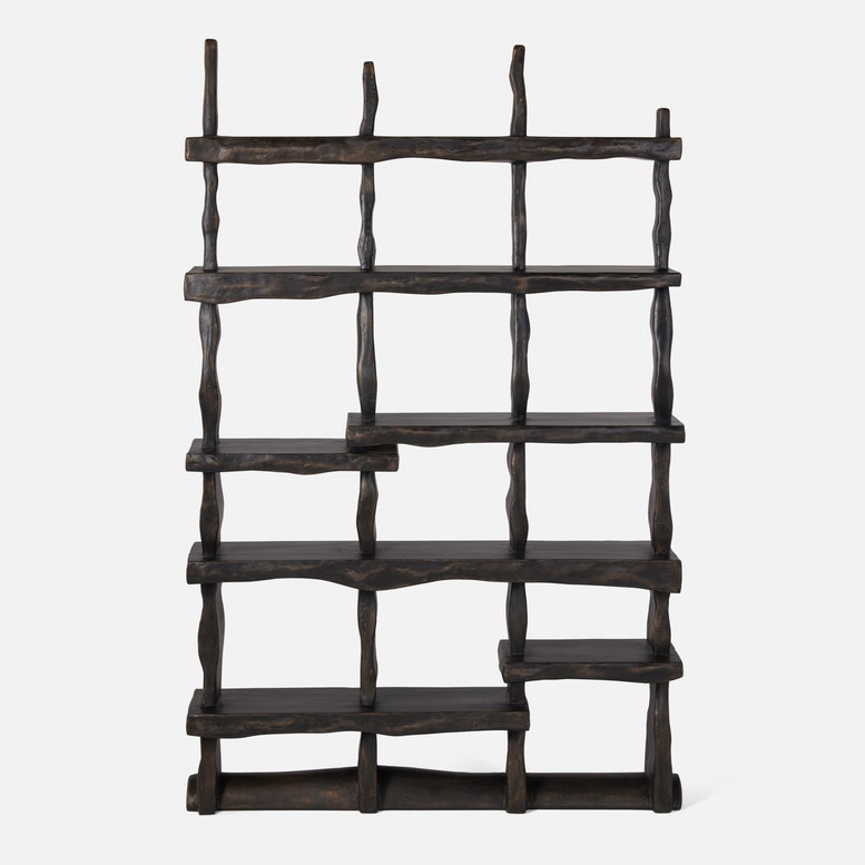 Powerful and primitive, our Artemis bookcase captures the raw beauty of driftwood in its cast-resin frame. Seven stepped shelves separate and overlap at focal points, creating opportunities for more intriguing displays of books and objects. An antique bronze finish casts a subtle glow.