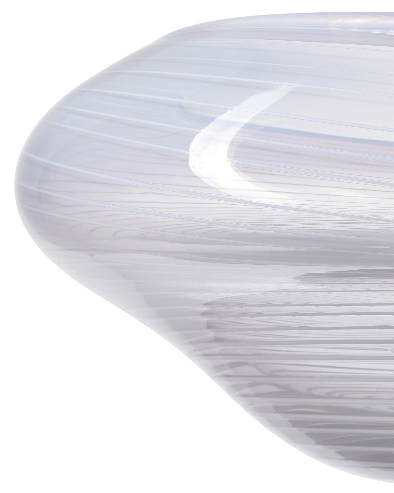 With its ethereal glow, this Bowl is crafted from pale gray mouthblown glass with swirling lines that create delicate textural striations across its surface. The effect is achieved when it is swirled while thin white glass rods are adhered to it as it is blown. The shape is realized when molten glass is allowed to drop from the blowing pipe into an orb and is carefully shaped by hand before being cut at the top with scissors to form its final silhouette. This makes each bowl one-of-a-kind.