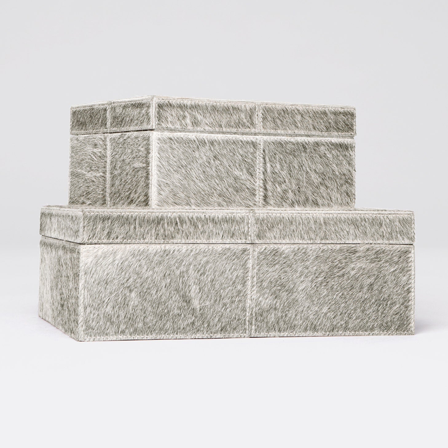 Patched gray cowhide box set. Natural variations in this material may occur. Slight differences in color and texture are characteristics of this collection's aged full-grain leather. This durable, high quality leather may show inherent markings, distressed appearance, and variations in pattern.