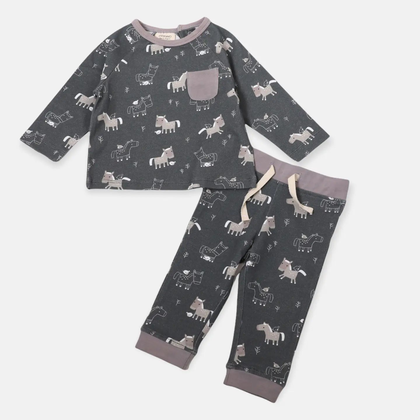 Adorable long sleeve shirt and jogger pants set made from organic cotton for babies. Tee: Diagonal snap button closure detail in the back, front pocket. Jogger Pants: Features drawstring waist & back pocket. Diagonal snap button closure detail in the back, super cute and unique. ULTRA SOFT, lightweight, breathable, cozy, and comfy. Chemical free & non-toxic formulation, eco-friendly & sustainable. Machine wash and dry, durable and long lasting. Ethically produced in India from small farmer sourced cotton.