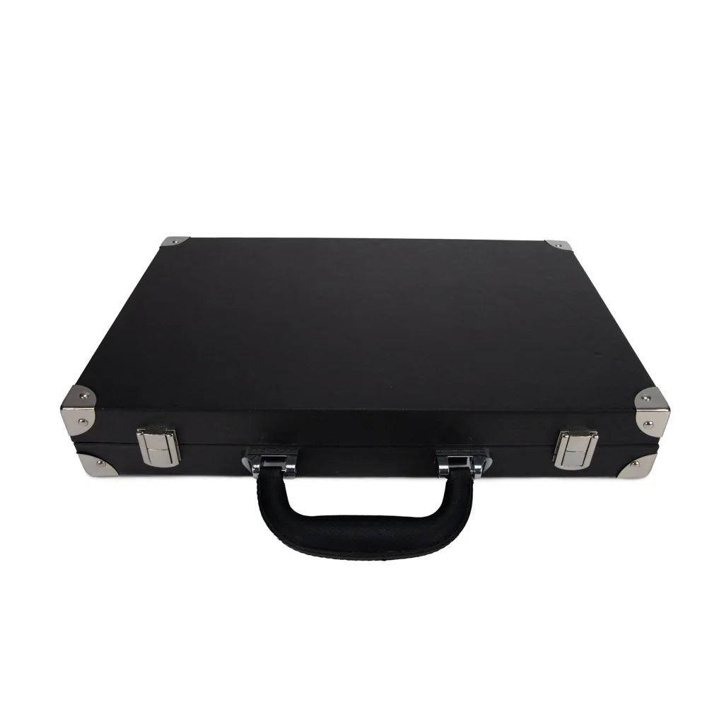 Backgammon Set is presented in a vegan leather case with carrying handle and accented with metal corners. Features felt interior with painted triangles, dice cup, black and ivory chips and dice. Perfect for game nights with family and friends!