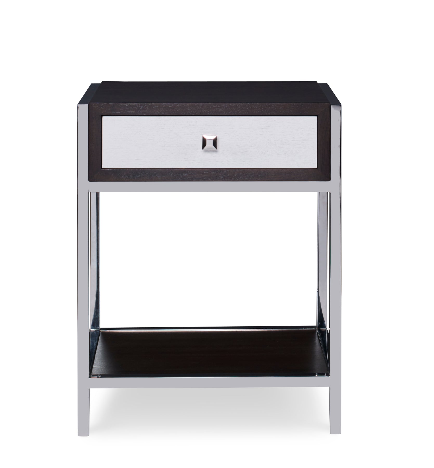 The Aria Nightstand is crafted from walnut veneers, metal, and beech solids in a special combo finish. It features a soft-close drawer with polished nickel hardware, an open shelf for additional storage, and a polished stainless steel frame, blending contemporary and transitional elegance.