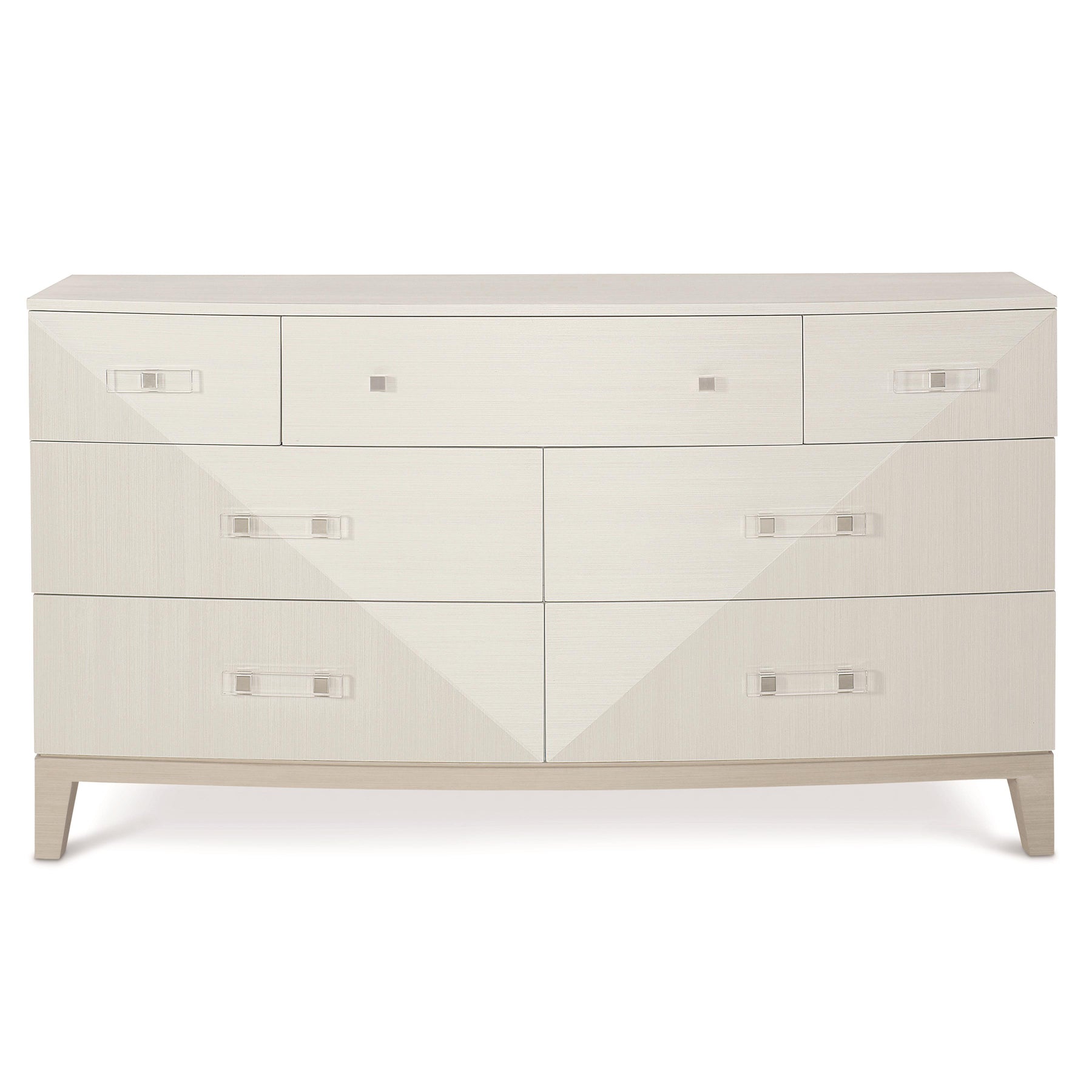 Crafted from poplar solids and engineered faux anigre veneers, the Axiom dresser features a softly curved front with a unique inverted pyramid design. Three silky yet low-sheen finishes form a subtle, sophisticated palette. Clear acrylic is combined with metal for hardware with a fresh and unique feel. With clean lines and a sleek form, this seven-drawer dresser remains a warm and inviting staple for the bedroom.