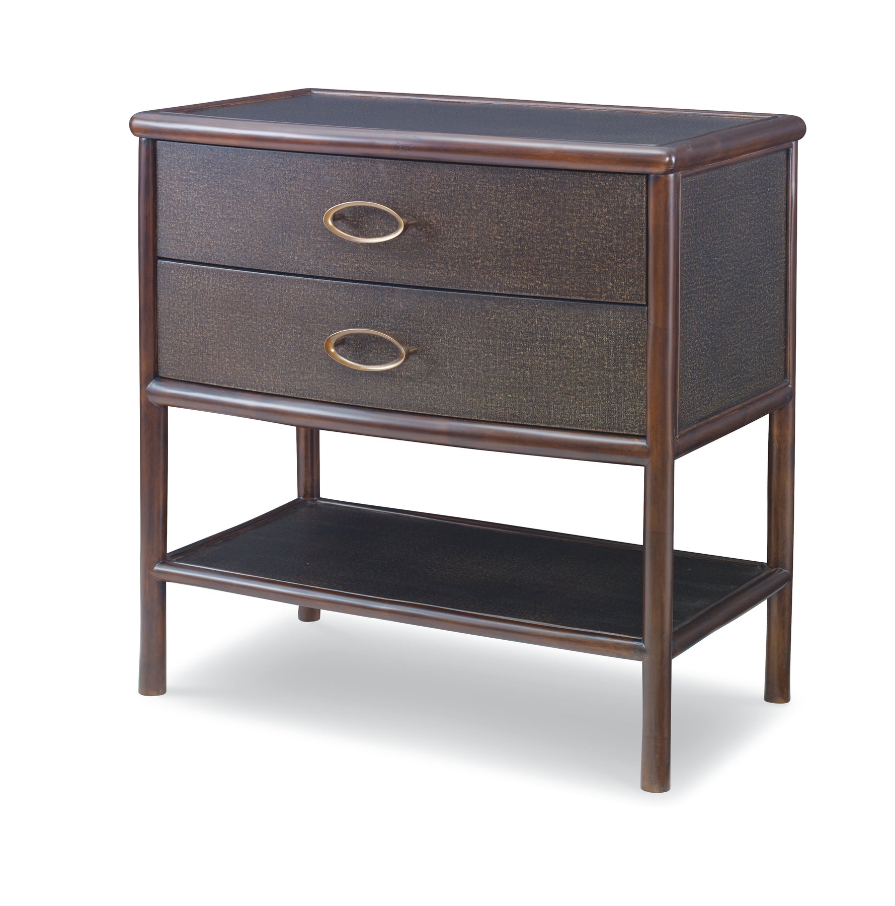 This nightstand features Gmelina framing with veneered canvas on the faces and tops. Canvas is finished in a rubbed black and lacquered with a moderate sheen with solid Gmelina framing finished in a rich chestnut creating a beautiful contrast effect. Two drawers with soft close mechanisms sit above one open shelf giving ample space for storage bedside.