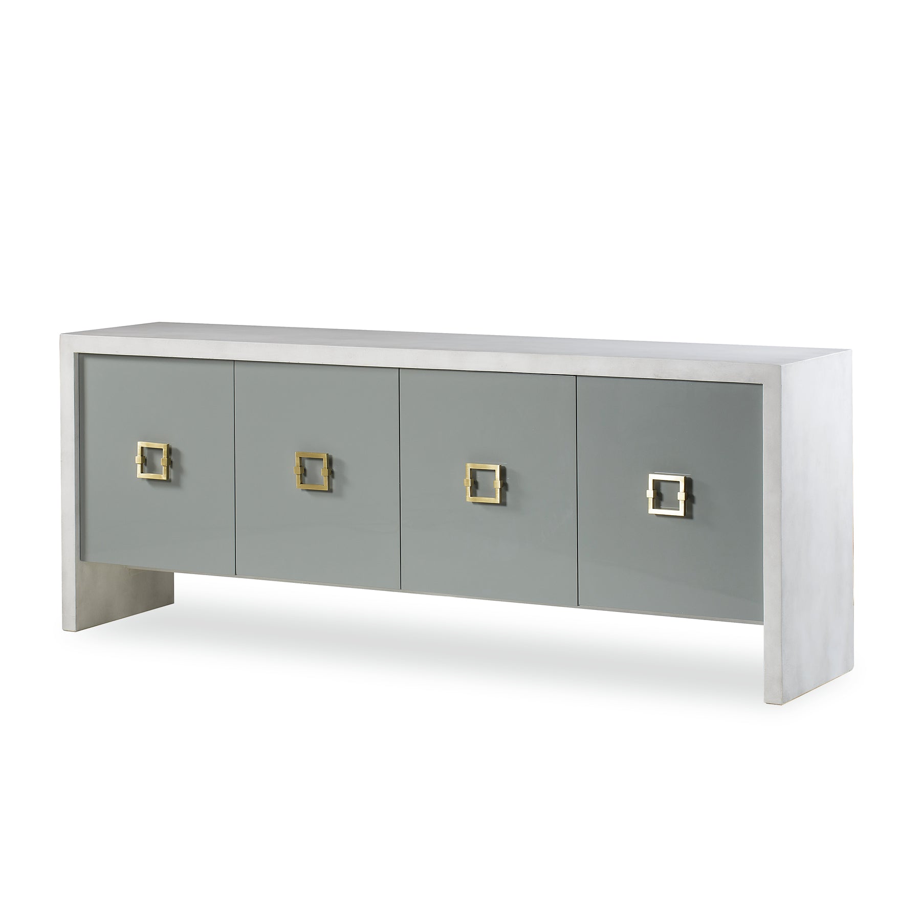 Liza credenza is a modernized Parson form finished in an off-white textured concrete contrasted with a sleek gloss lacquer finish on the doors featuring brushed-brass hardware. Behind each set of two doors is one adjustable shelf, making it a wonderful storage piece.