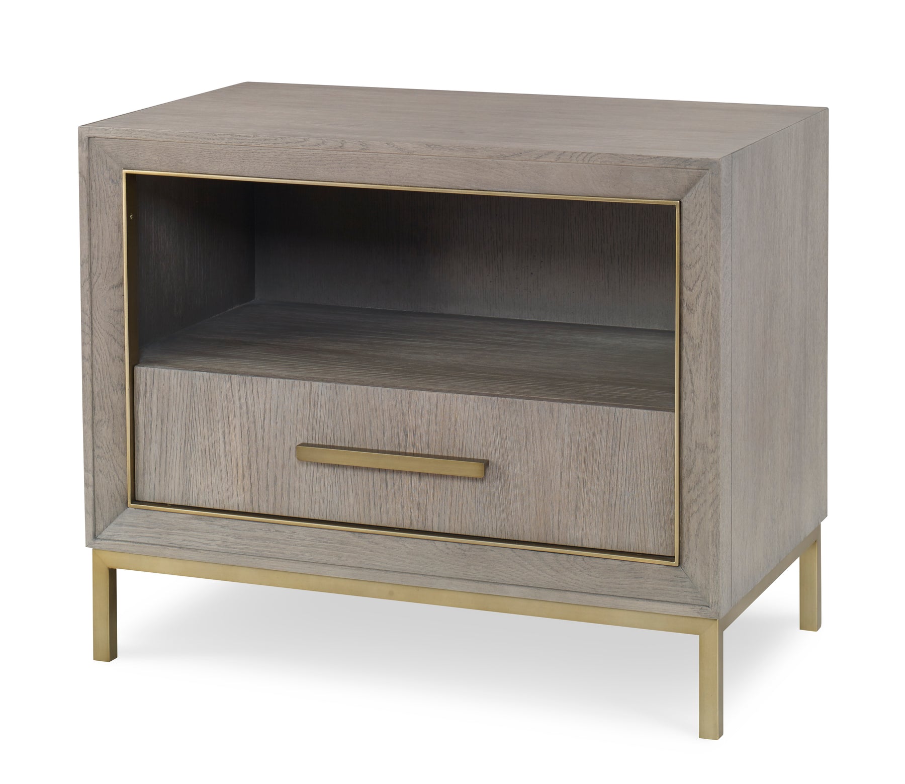 The Kendall series reflects today’s casual contemporary lifestyle. Its understated, clean line forms, linear oak grain and soft gray finish offer a calming and welcoming vibe. Design features include straight grain oak doors and drawers, deep beveled picture framed cases, satin brass finished metal trim and decorative hardware and a plinth base. Each item is crafted of lightly wire brushed oak solids and veneers finished in a warm Camino gray stain. One drawer rests below an open space and rests on a satin gold finished metal base.