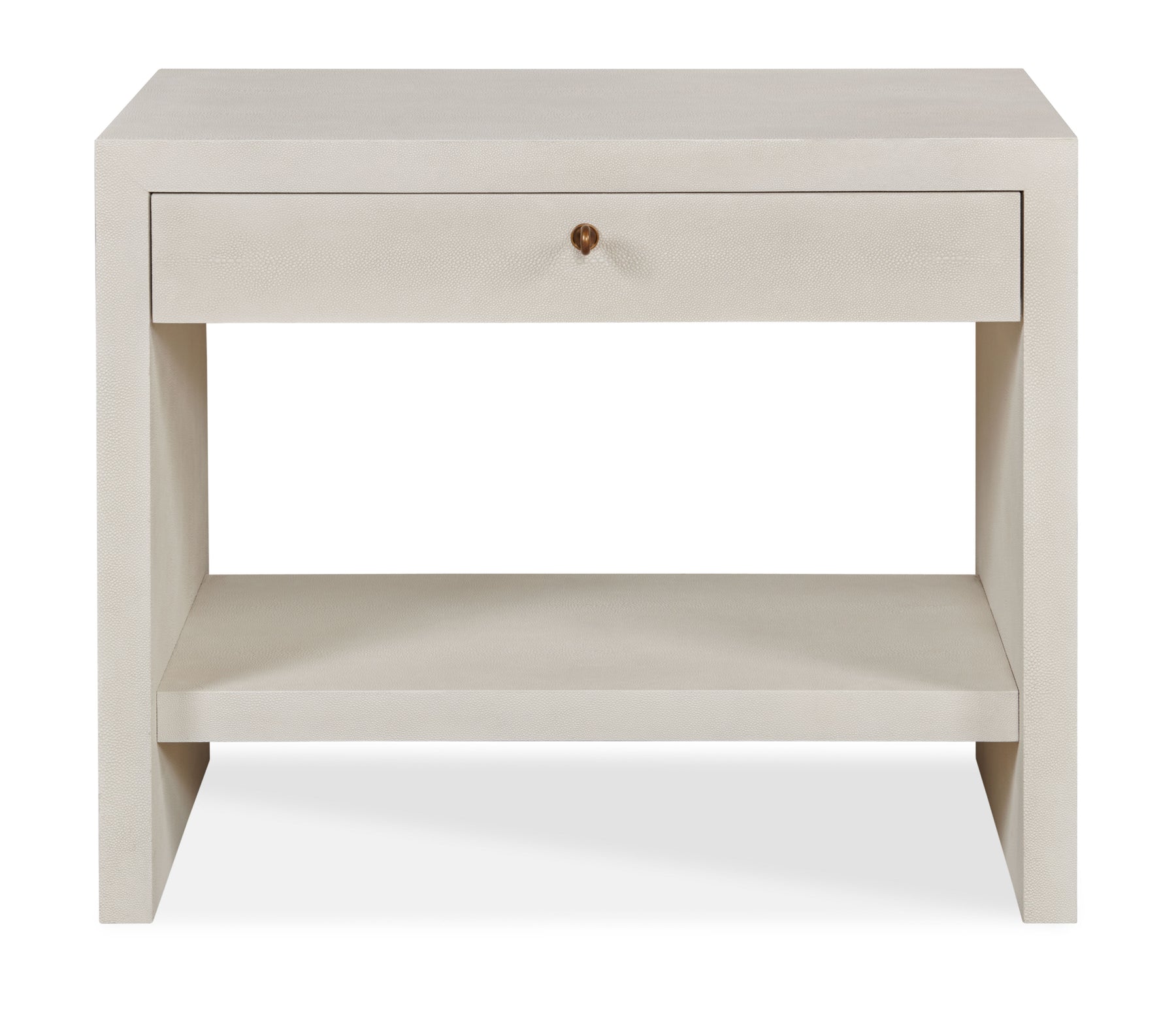 The Vienna Amsterdam Nightstand features a dove white faux shagreen finish with a single drawer and antique brass finish fixed key hardware. Its open shelf adds practicality, while the contemporary, continental, and transitional design complements various bedroom styles.