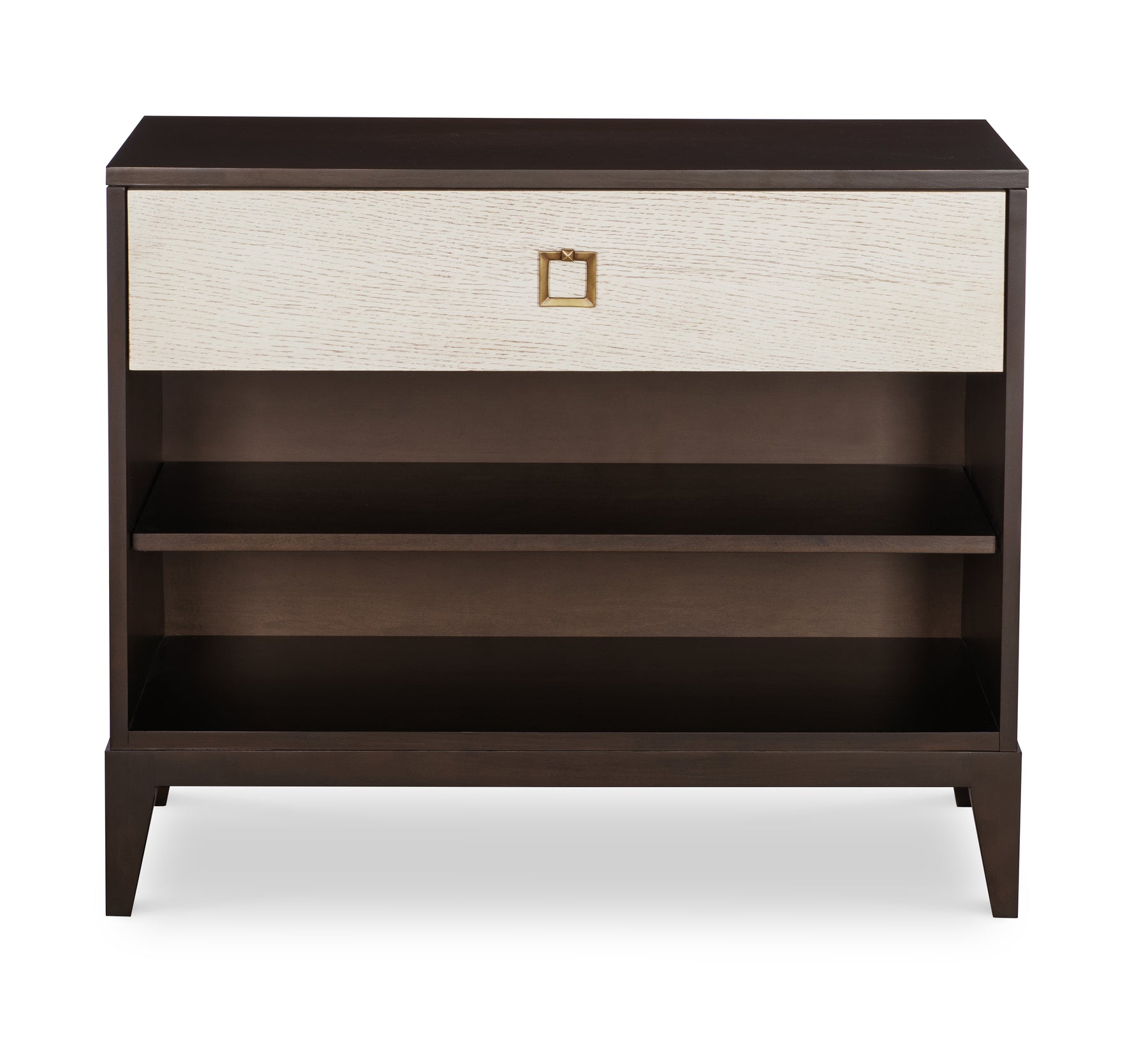 The Details Case Stocked Single Drawer Large Nightstand combines modern style and functionality. Featuring a Charbrown wood finish, textured oak detailing, and a sleek antique brass ring pull, this nightstand offers ample storage with a sophisticated design.