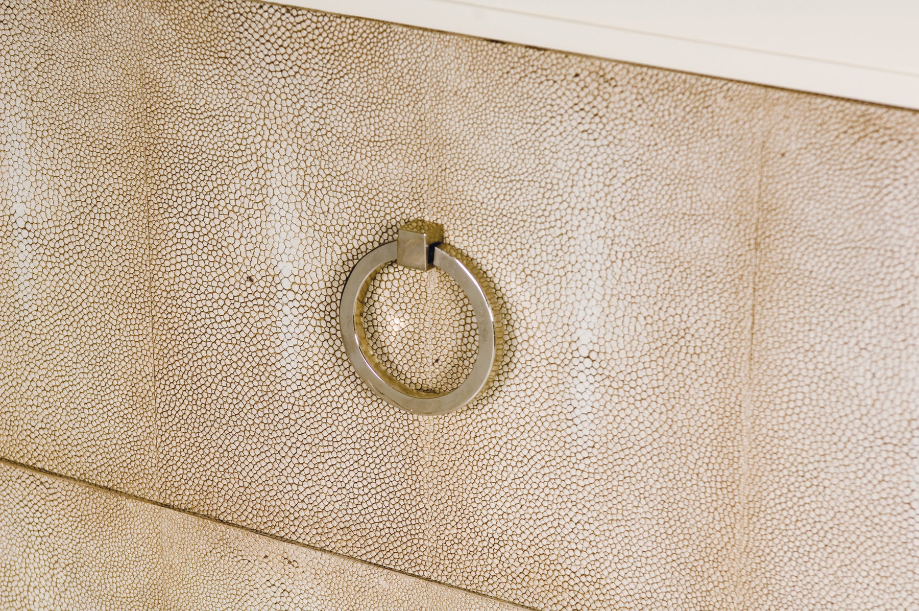 - Ivory finish Acacia solids and faux Shagreen drawer fronts