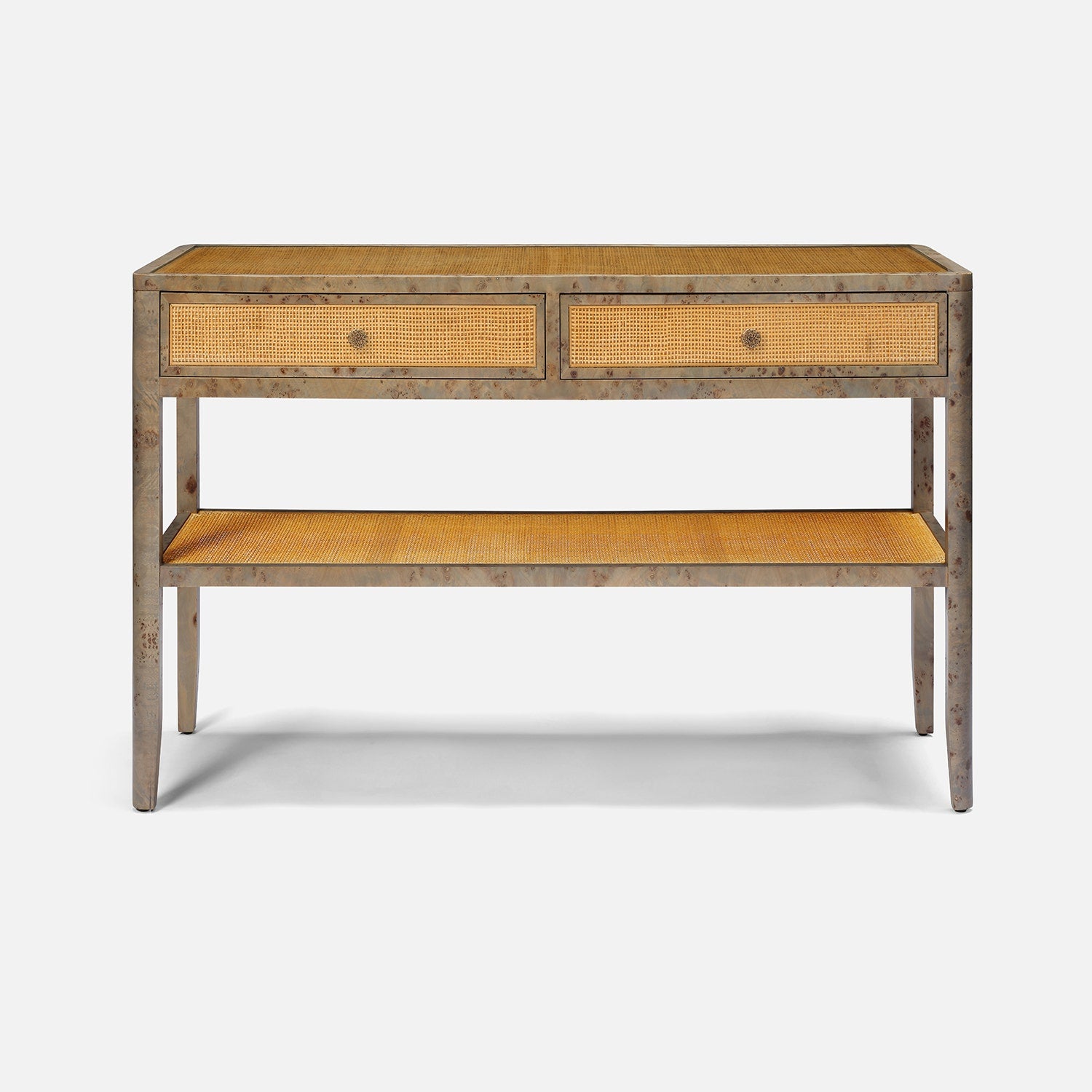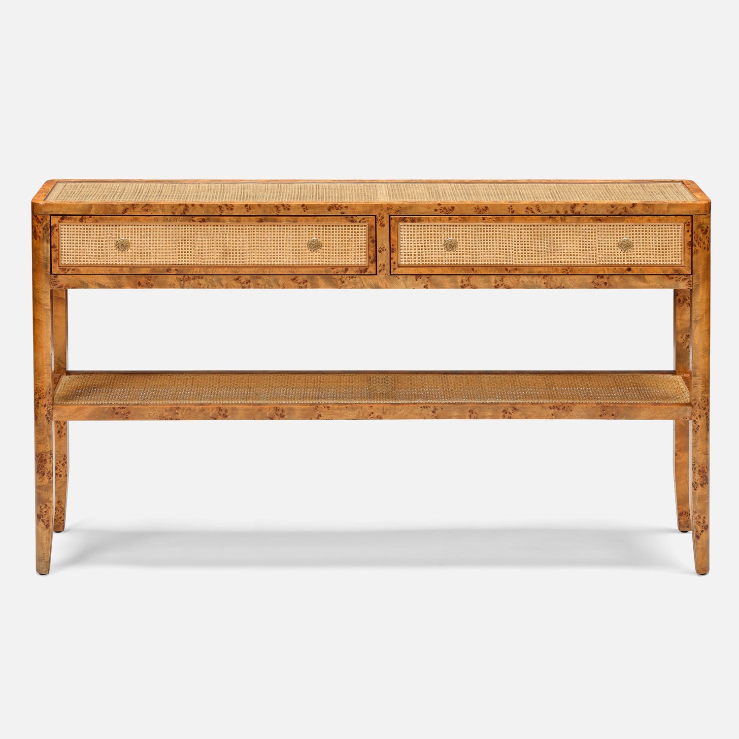 Standing atop tapered legs with elegant rounded corners, our Amara console exudes a refined touch. Naturally occurring irregular grain patterns of popular burl add character and its glass top reveals stunning caned panels.