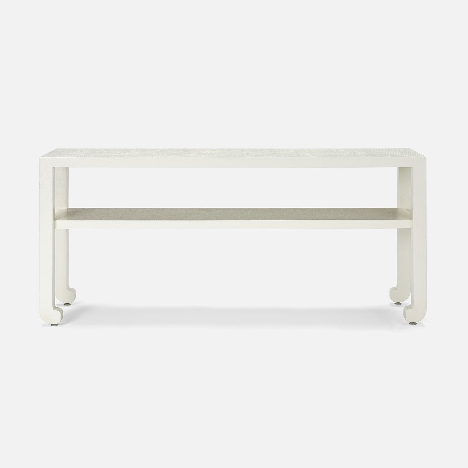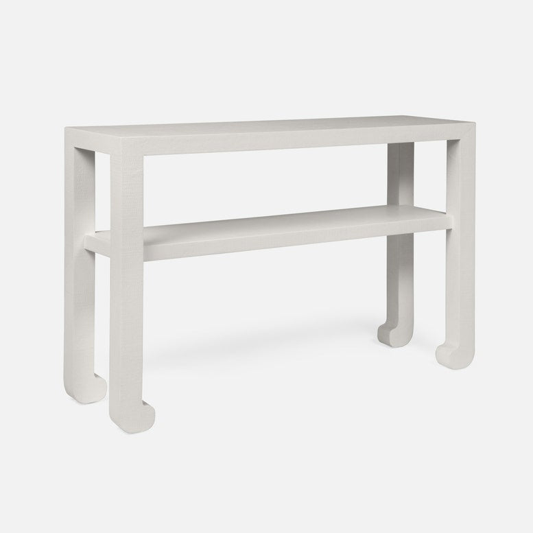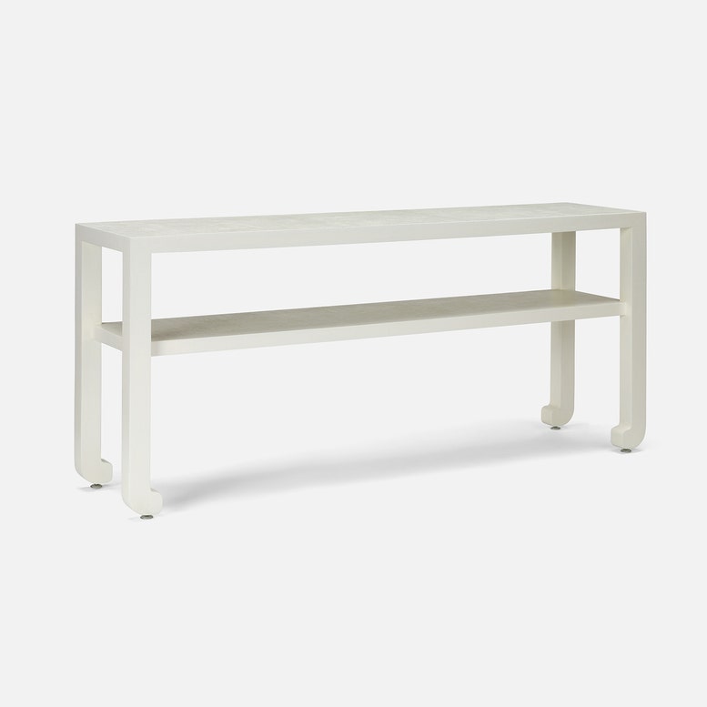 Inspired by a traditional Chinese console, we've created a simplified version. Rounded edges, straight legs, and wrapped feet make up this faux raffia piece. This console features a brand new depth, 14 inches, which hits the sweet middle spot and will work in a wide variety of spaces.