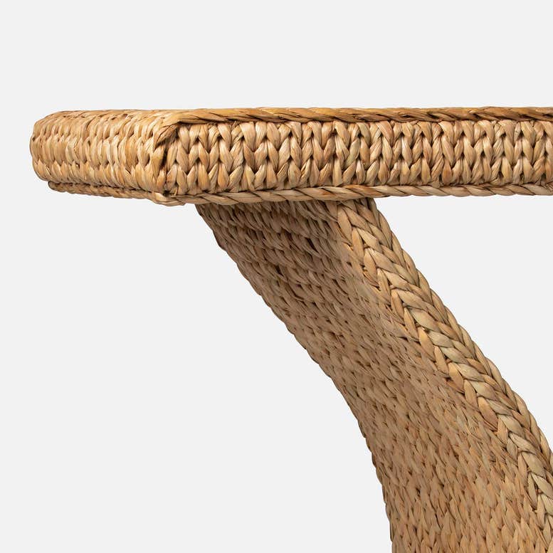 Seagrass is woven into a one-of-a-kind console. A large oversized top is supported by gracefully curving legs that terminate into a small floor platform.