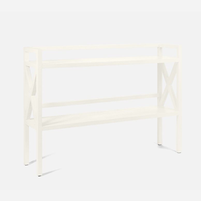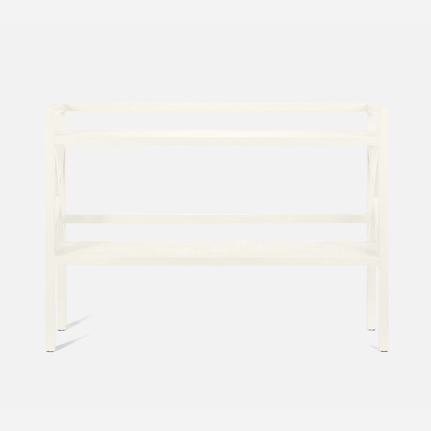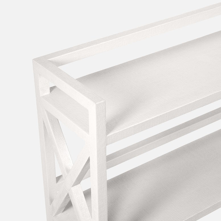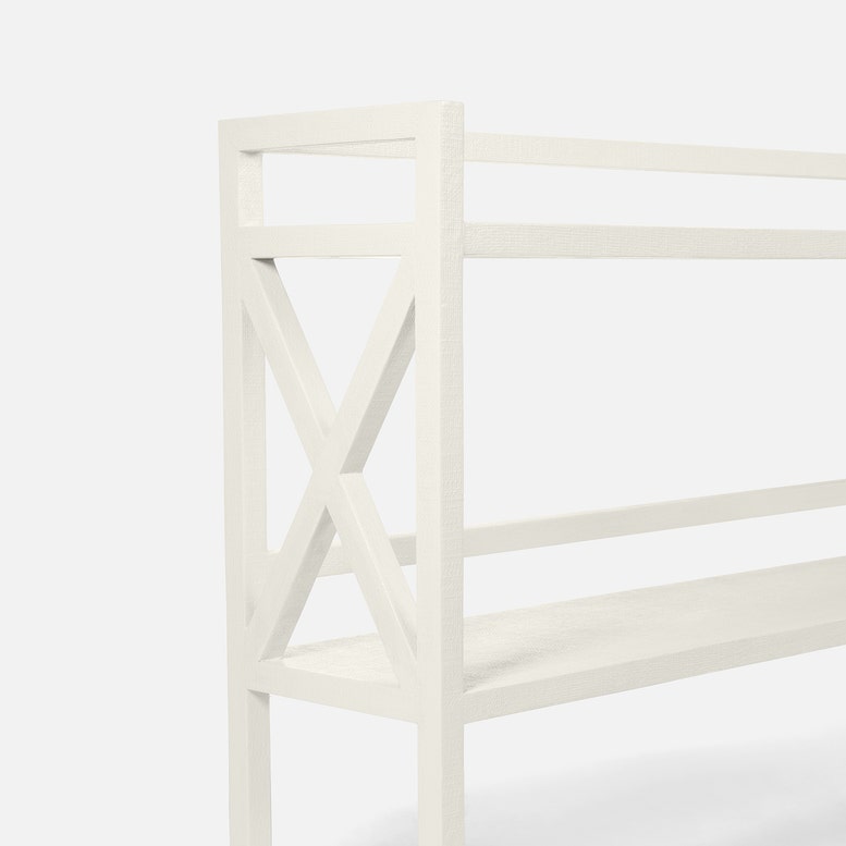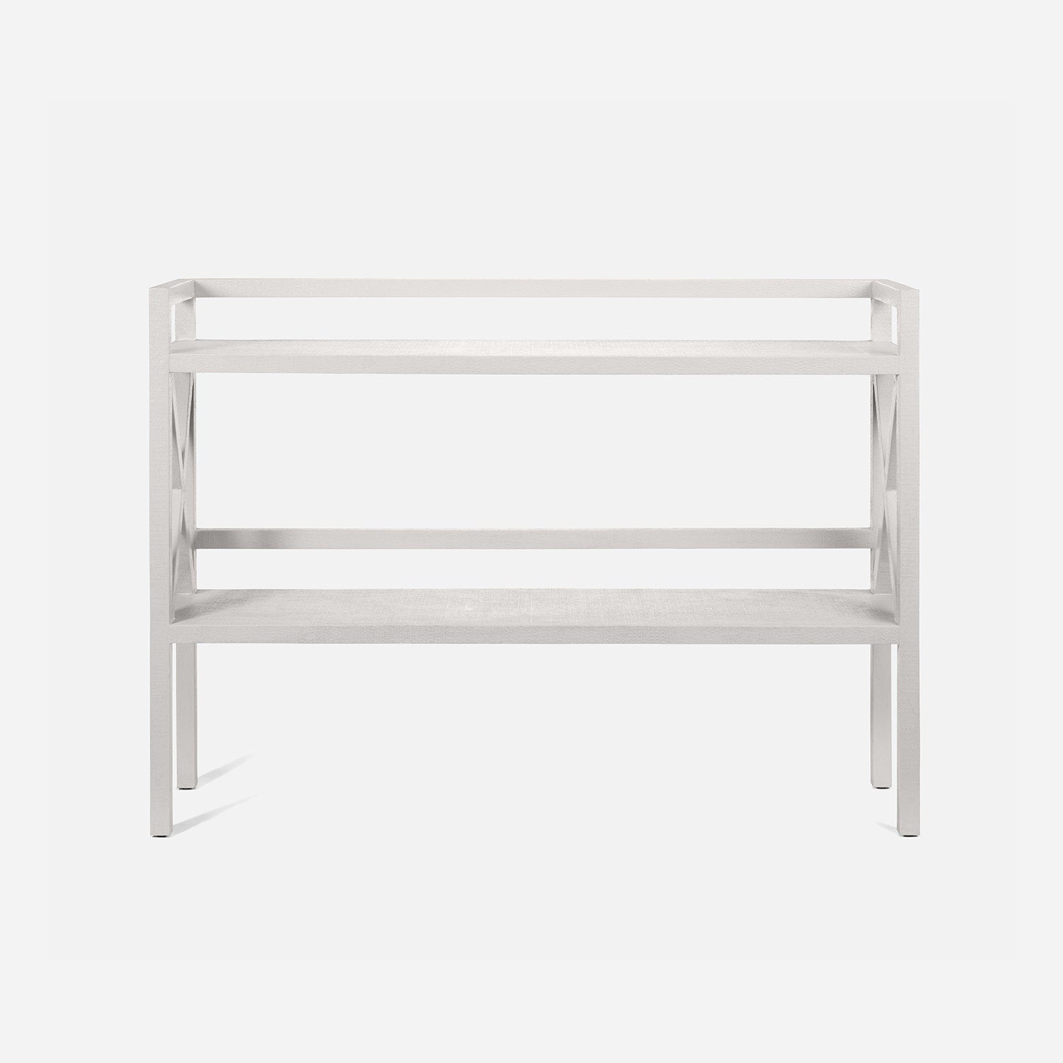 Crafted from sturdy faux raffia and finished with intersecting diagonal side details, the Juno console is where a farmhouse aesthetic gets a luxe, creative upgrade. Both shelves are bordered by high sides and backs for secure storage or display.