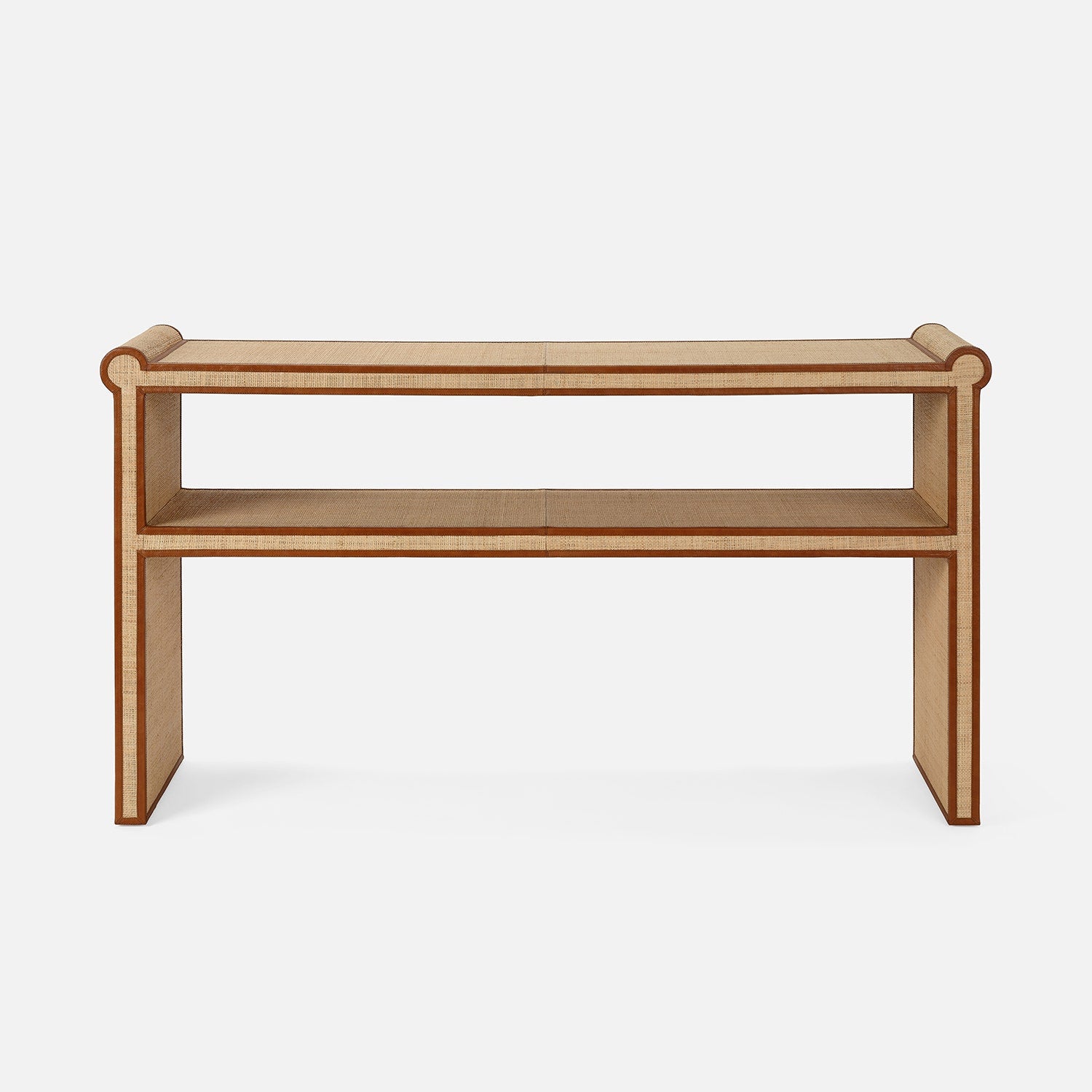 Our Matthew is crafted from raffia and instills a stately presence. A full-grain leather trim outlines the unique shape of the console. Given the nature of the material, variations and slight irregularities in color, fraying, patterns, and weaves may occur.