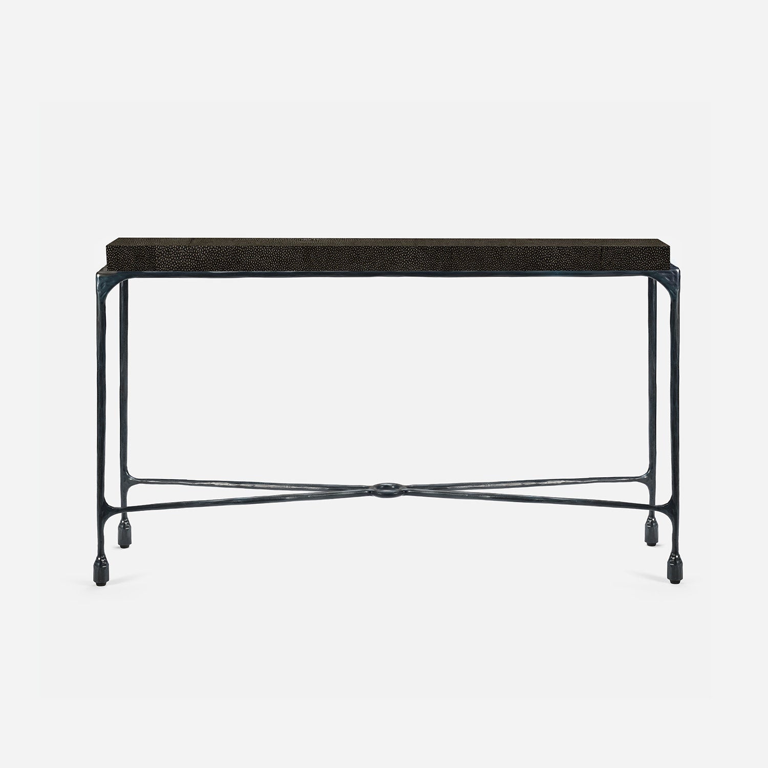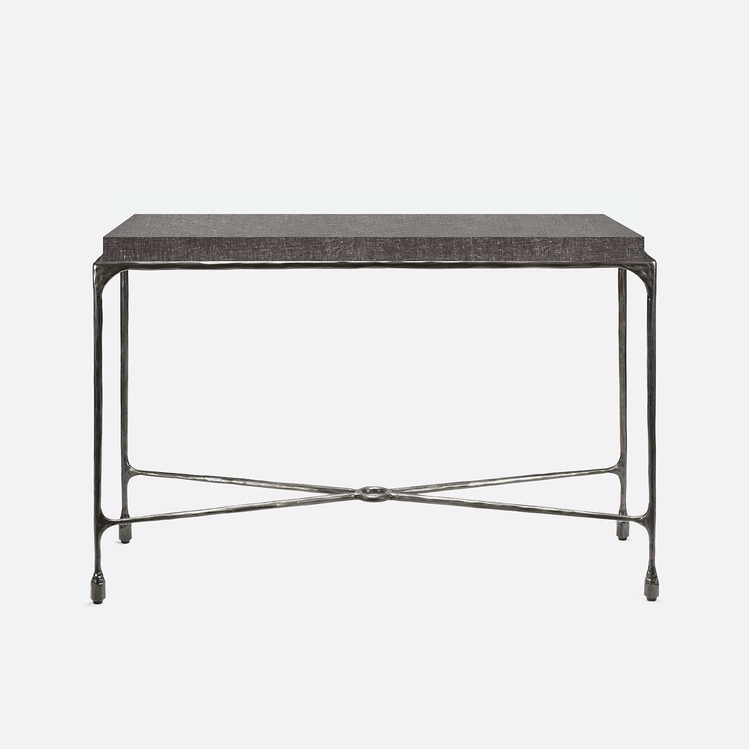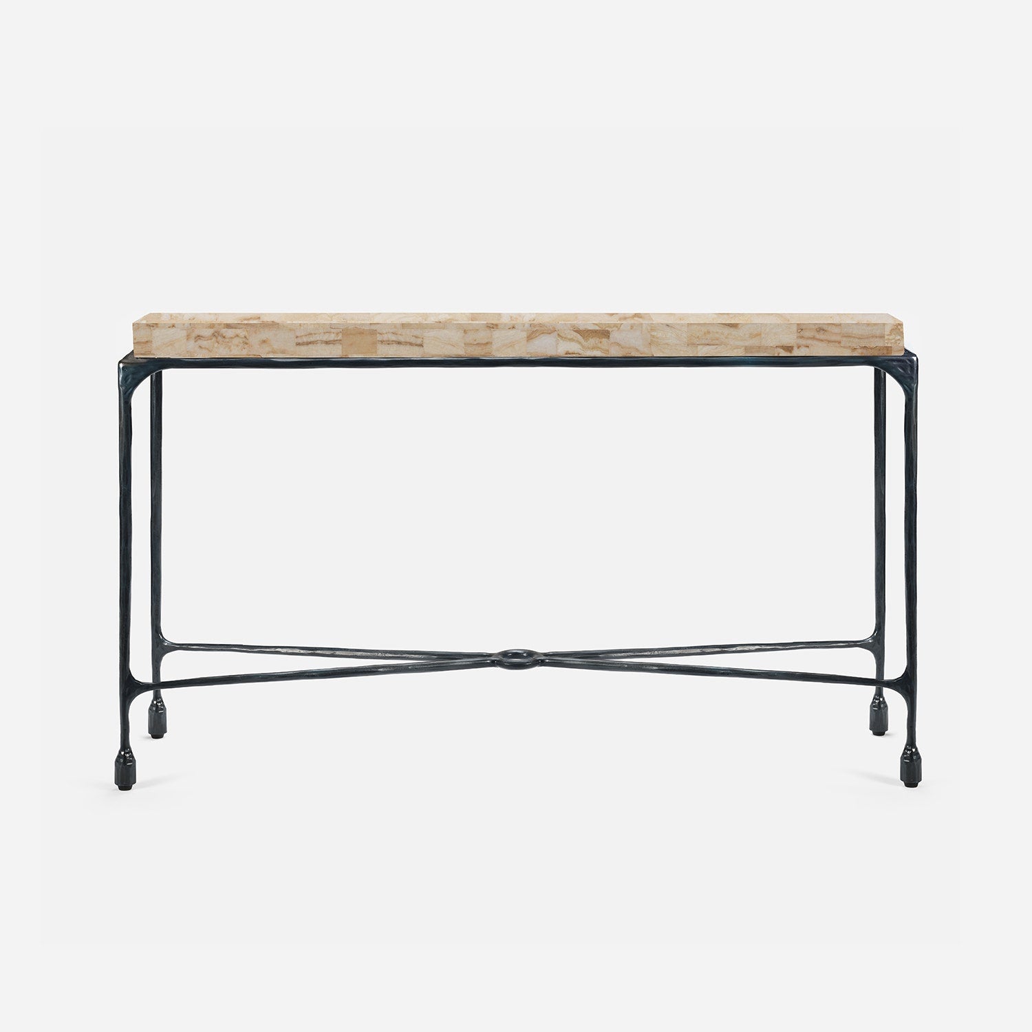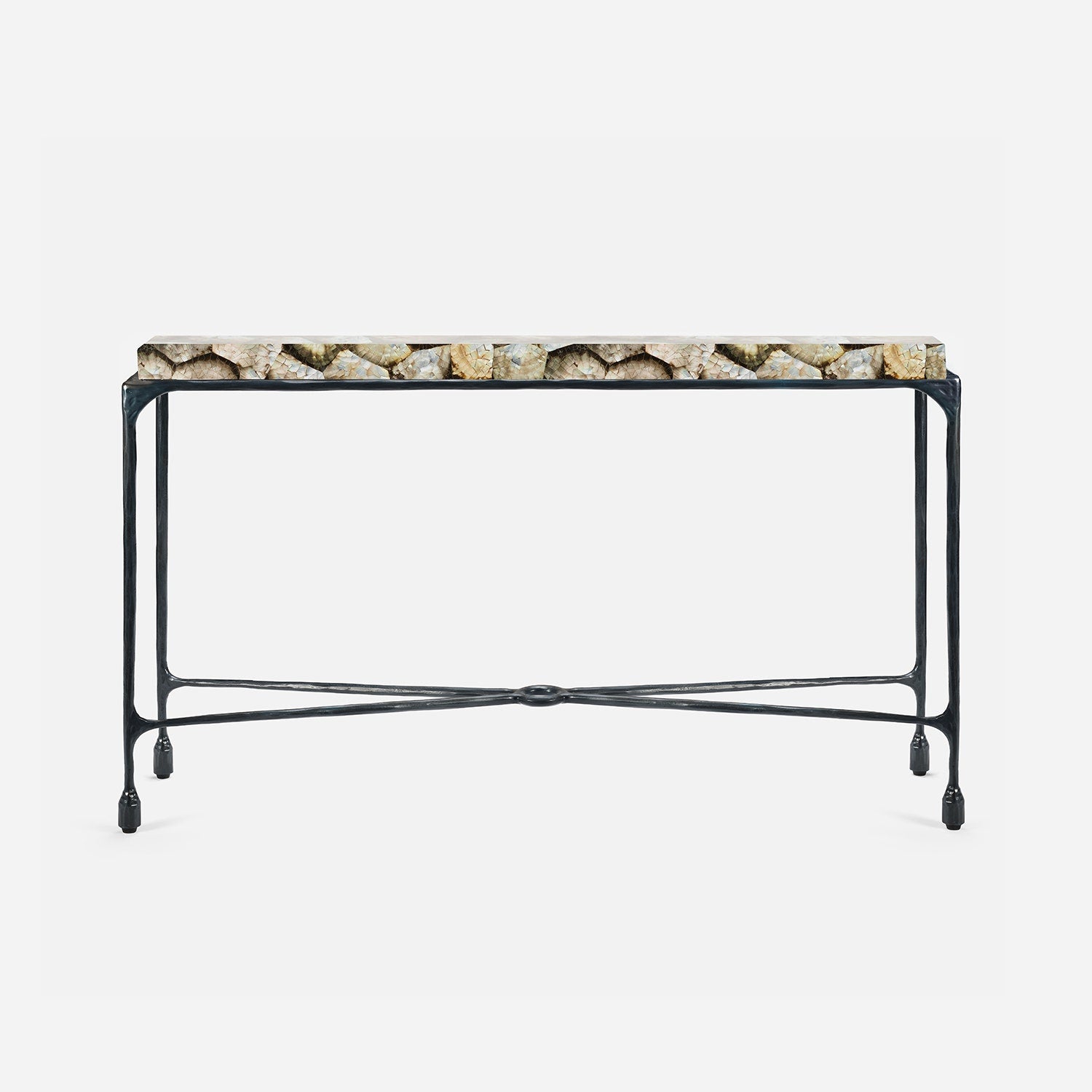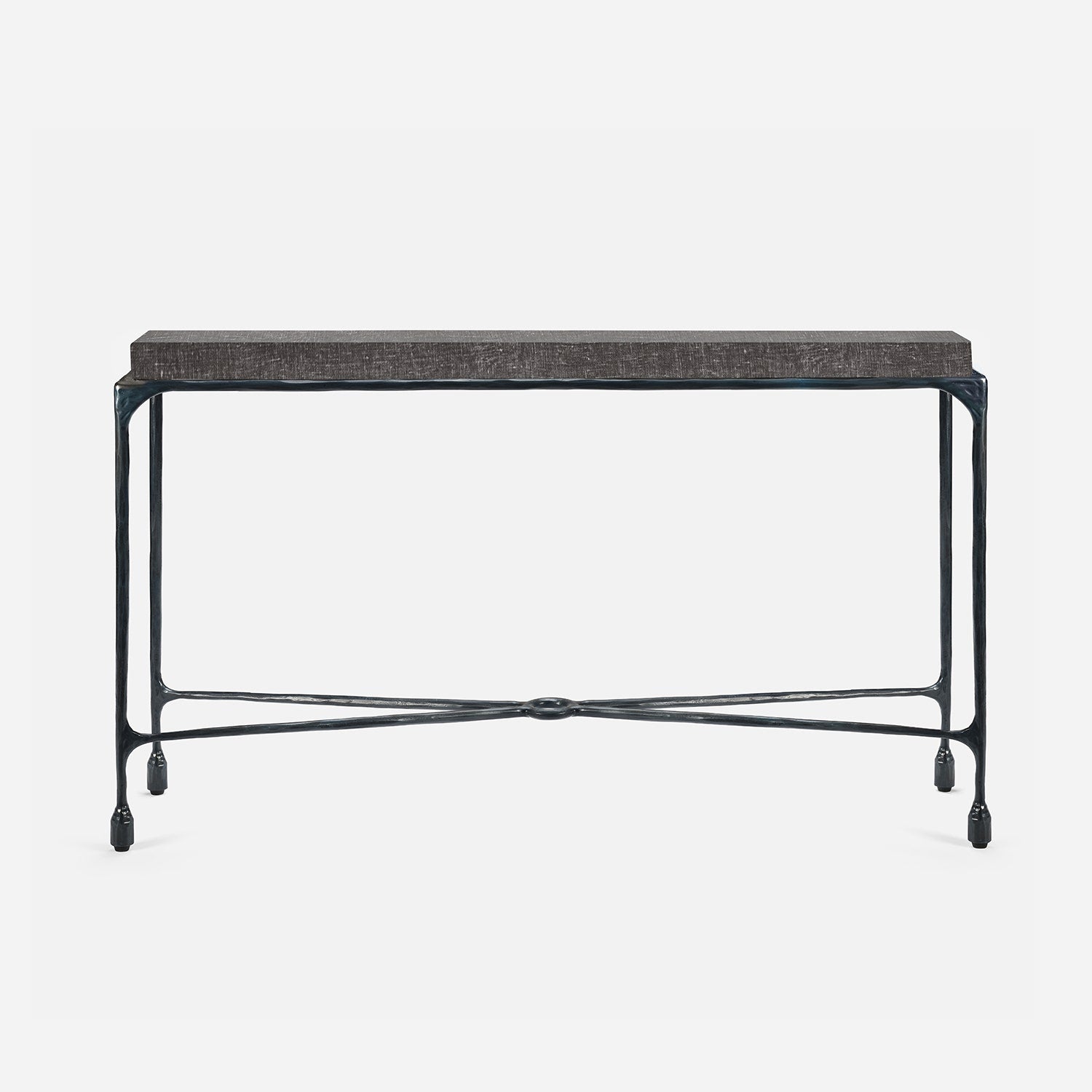 Chiseled from iron in a sleek sheen, the Owen console adds a subtle gleam to a room. An X-shaped structure and exposed ring support the adjacent legs adding an artistic touch. The consoles and tables are interchangeable, with a variety of top options available.