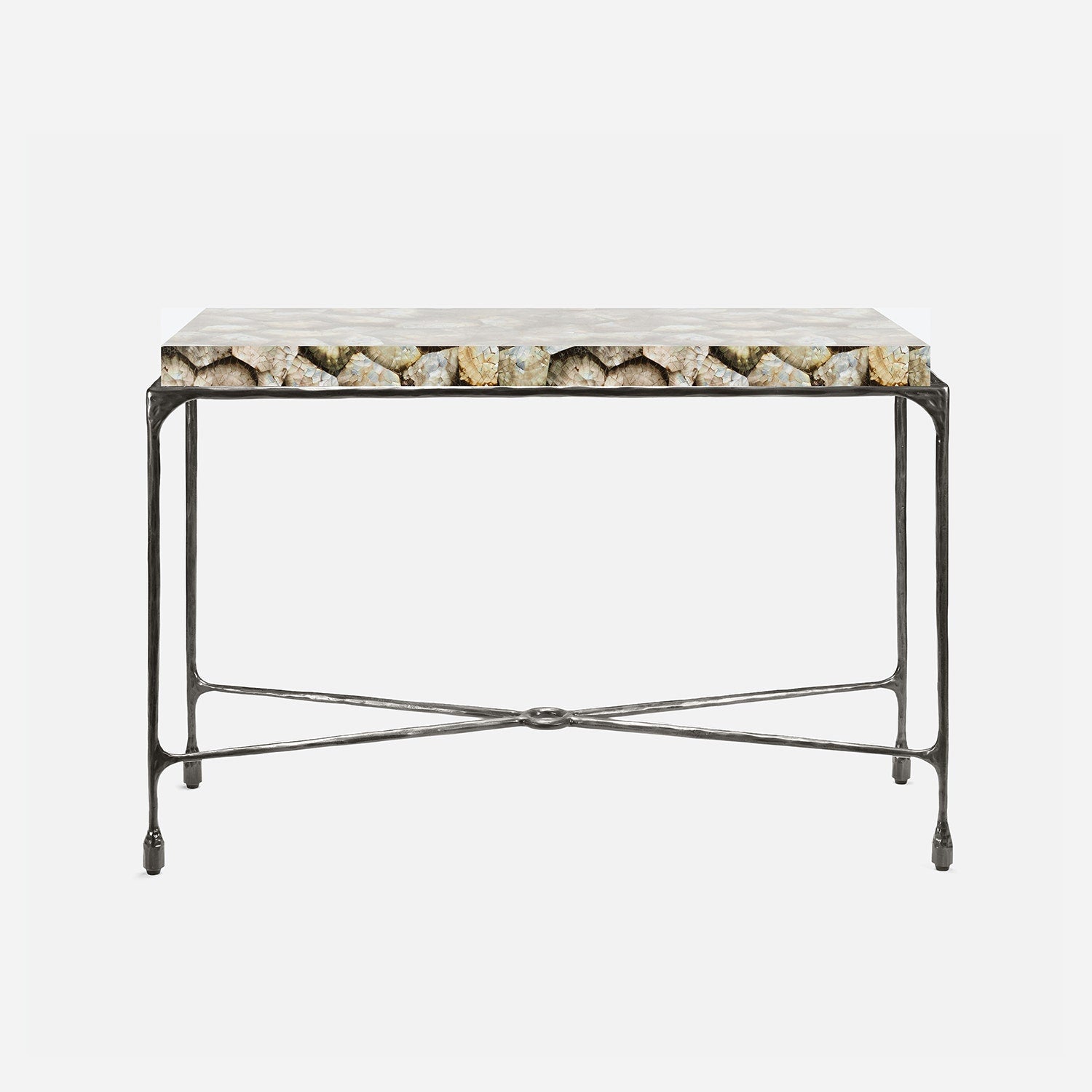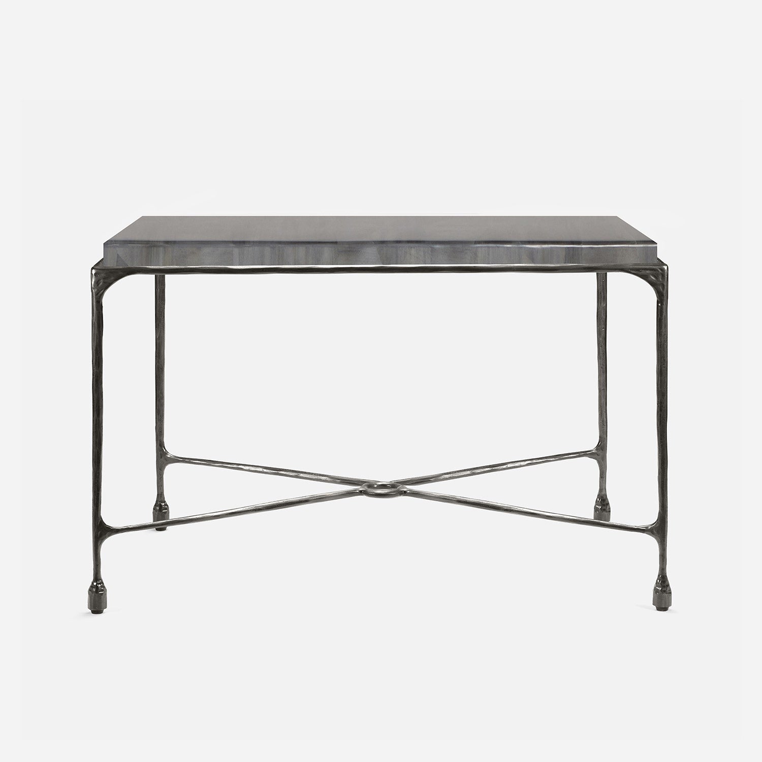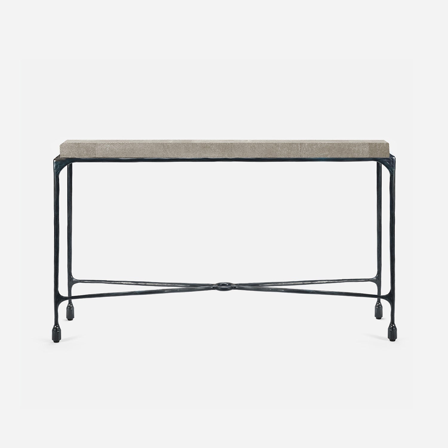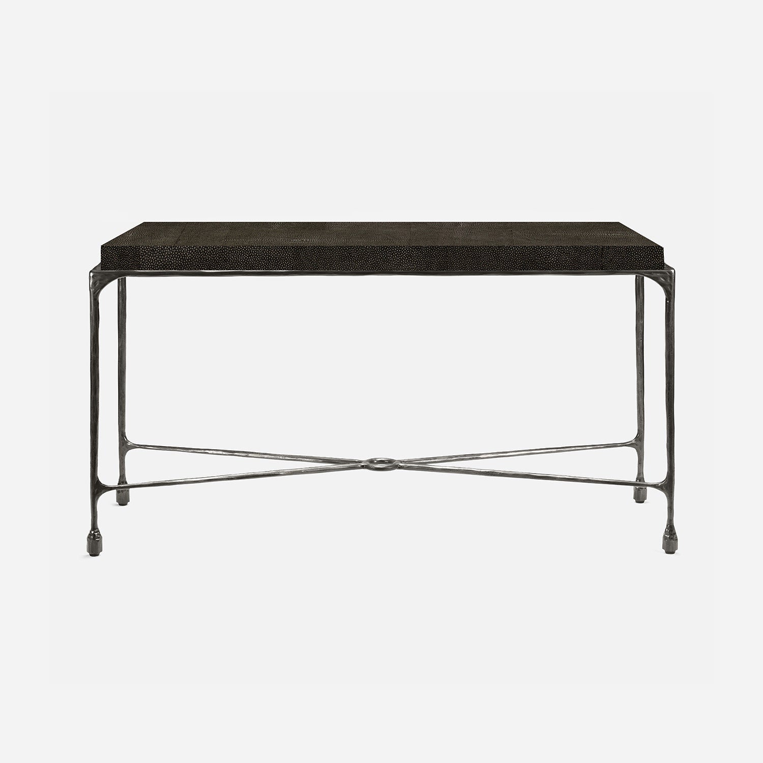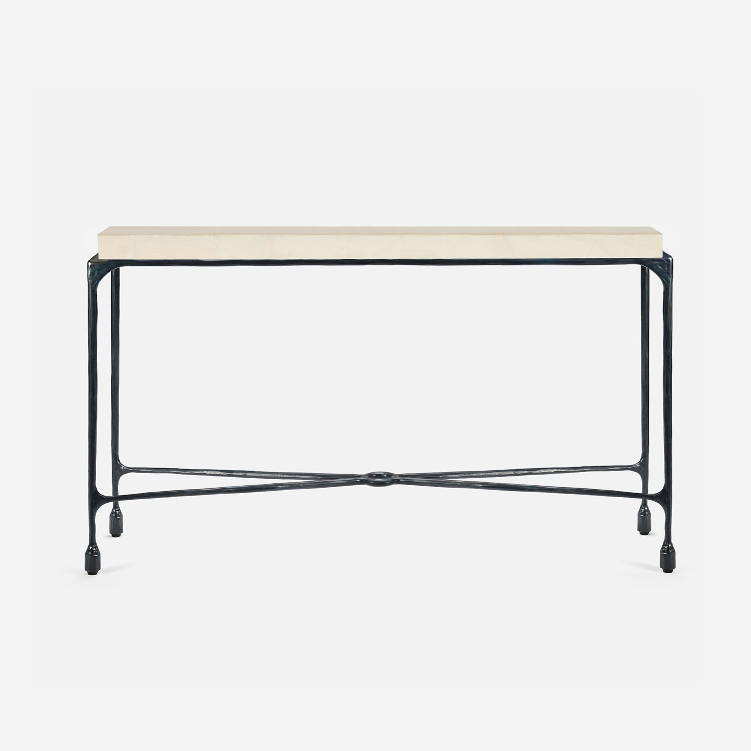 Chiseled from iron in a sleek sheen, the Owen console adds a subtle gleam to a room. An X-shaped structure and exposed ring support the adjacent legs adding an artistic touch. The consoles and tables are interchangeable, with a variety of top options available.