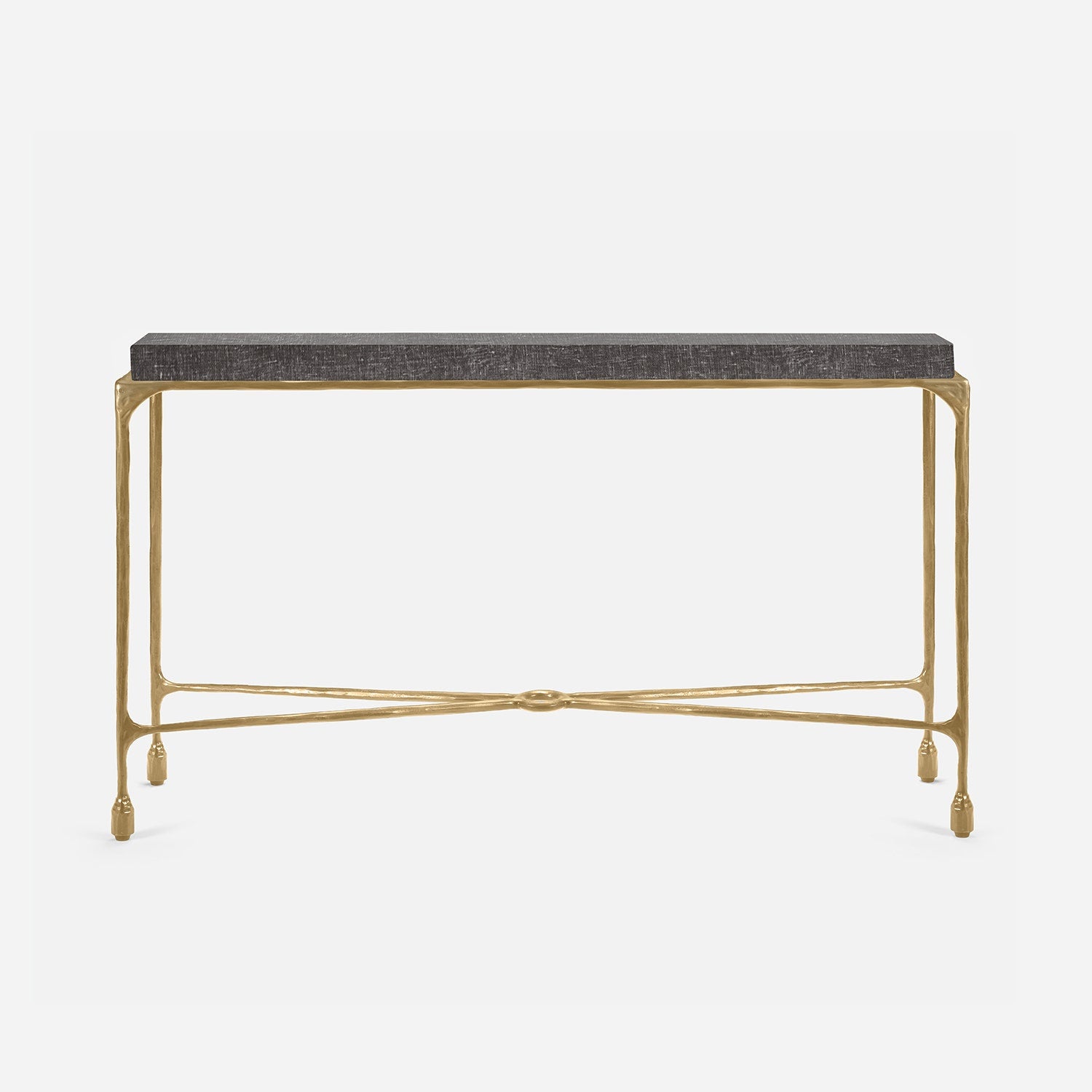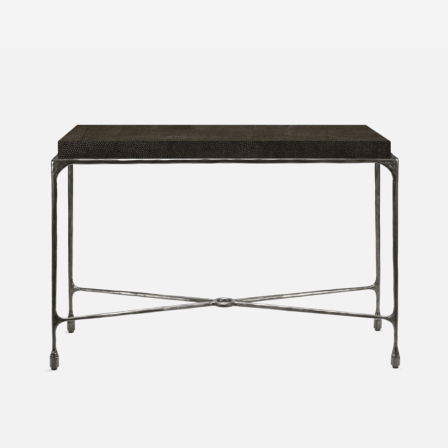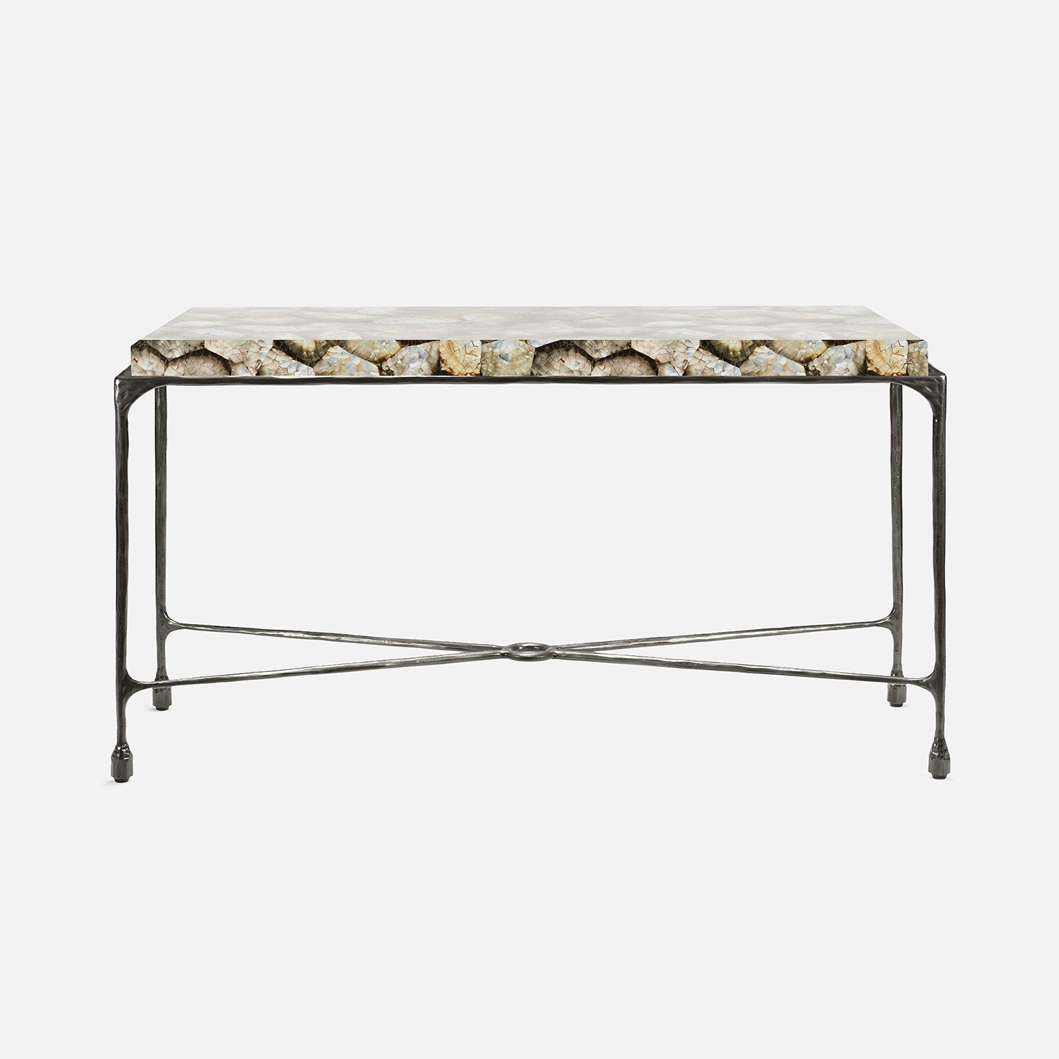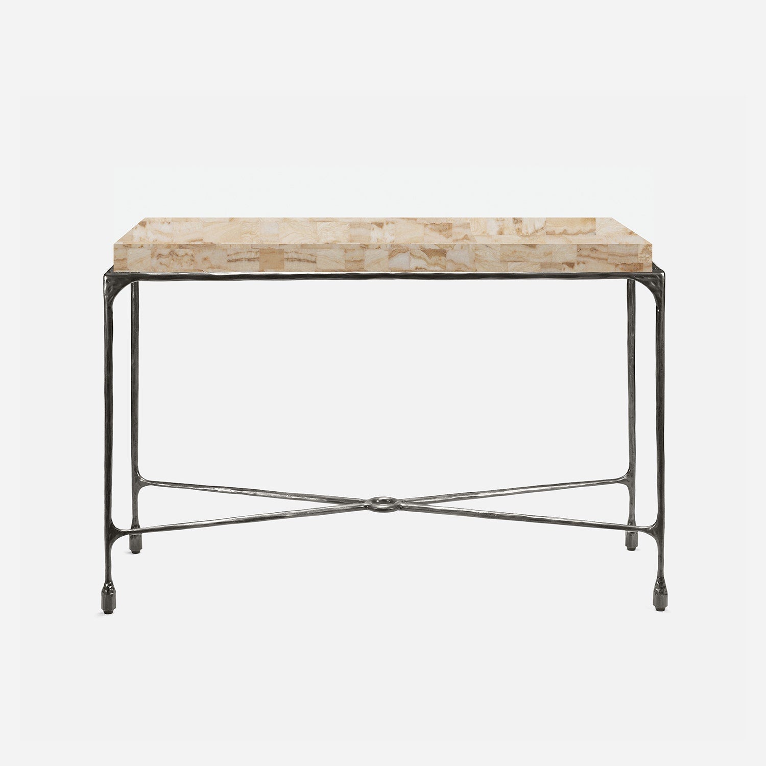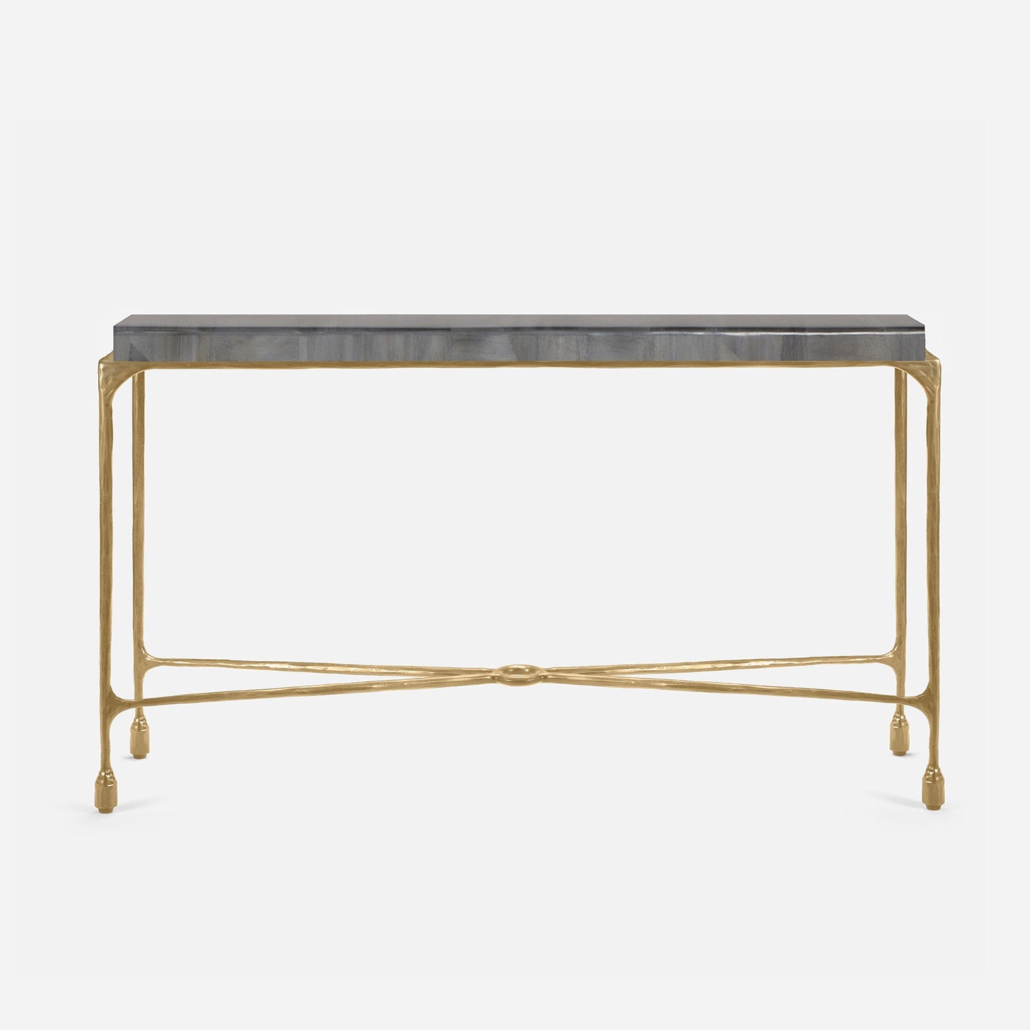 Chiseled from iron in a sleek sheen, the Owen console adds a subtle gleam to a room. An X-shaped structure and exposed ring support the adjacent legs adding an artistic touch. The consoles and tables are interchangeable, with a variety of top options available.