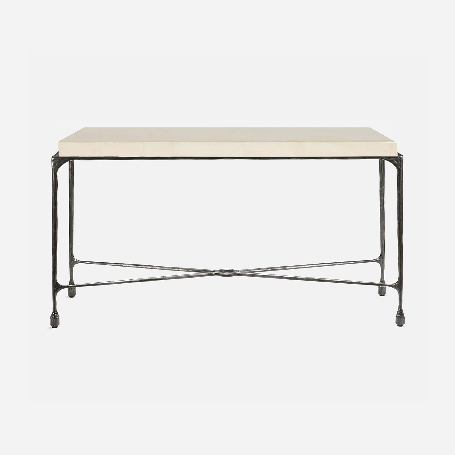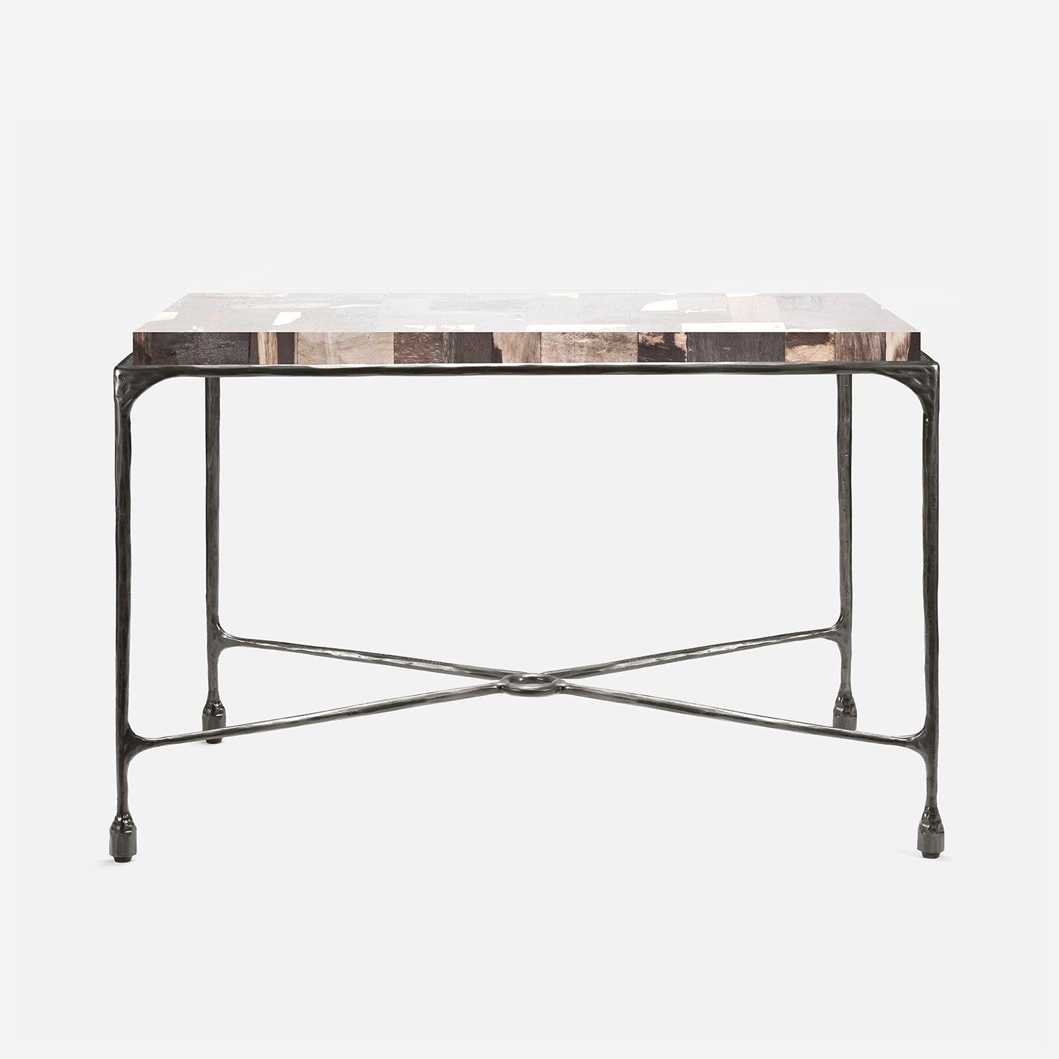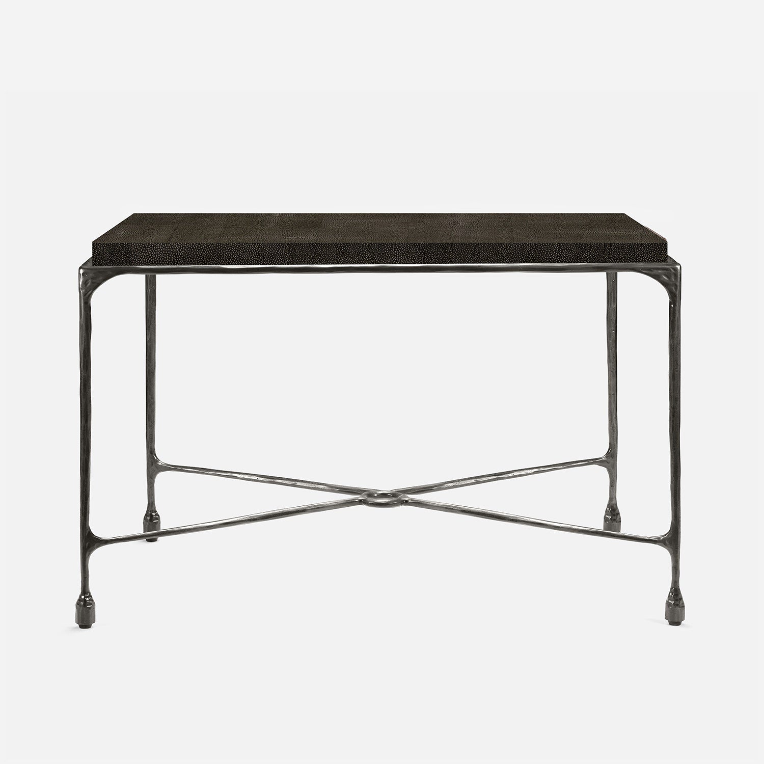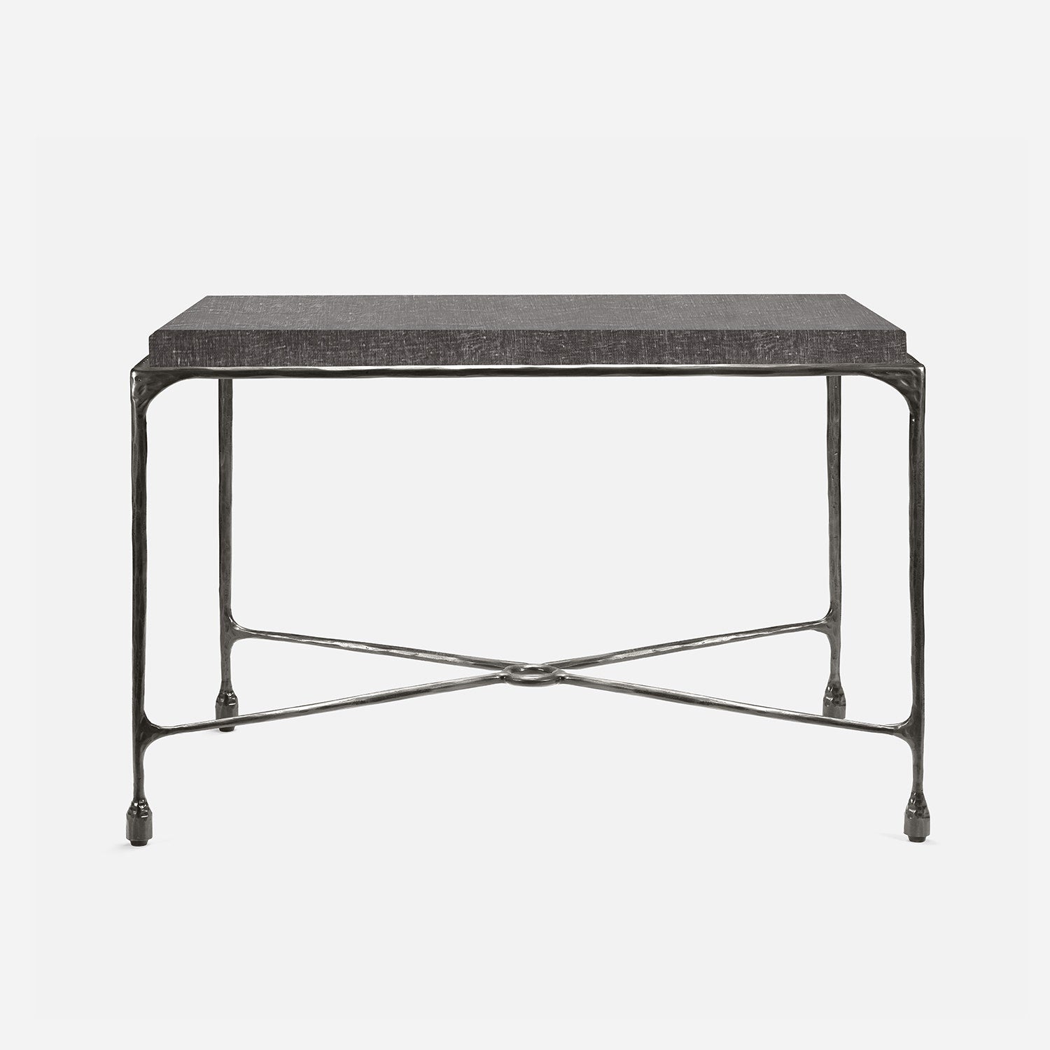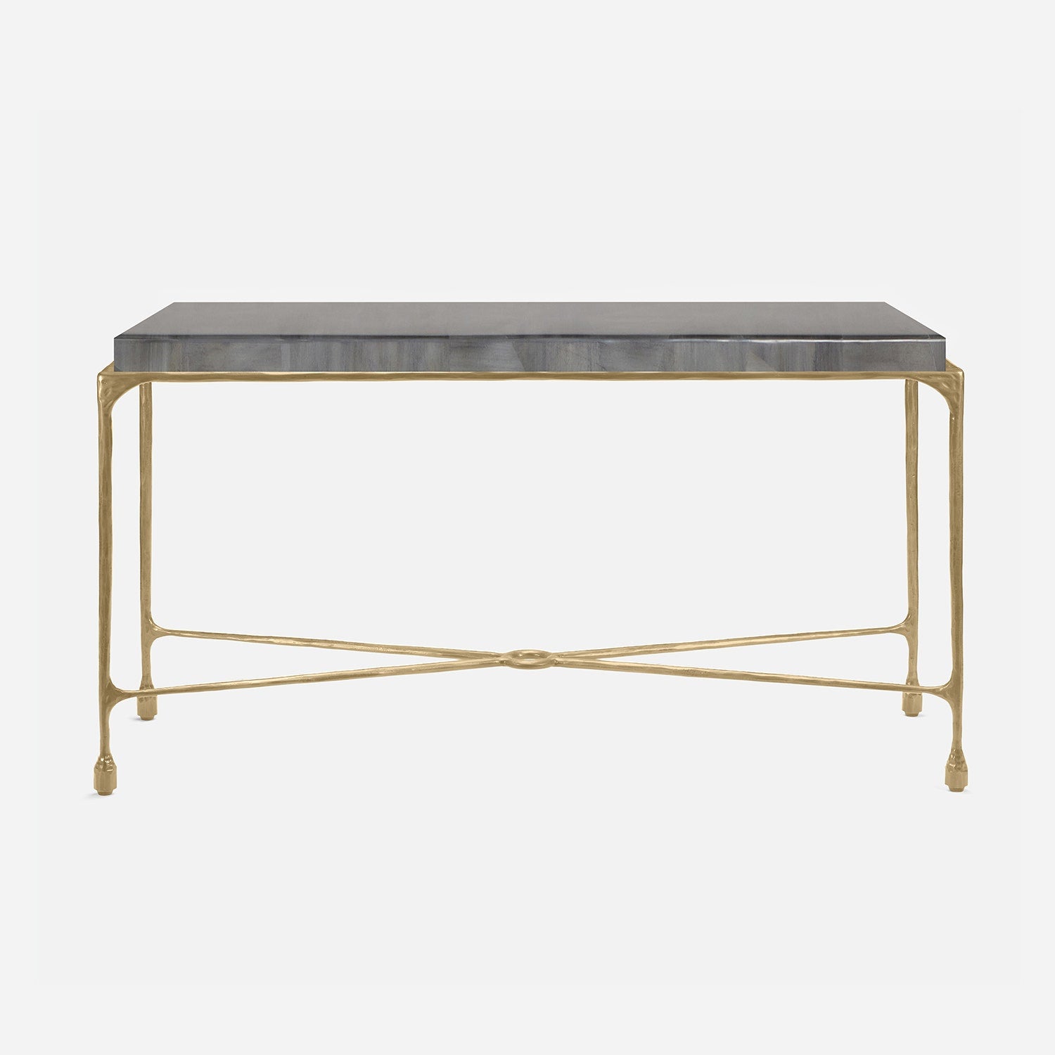 Chiseled from iron in a sleek sheen, the Owen console adds a subtle gleam to a room. An X-shaped structure and exposed ring support the adjacent legs adding an artistic touch. The consoles and tables are interchangeable, with a variety of top options available.