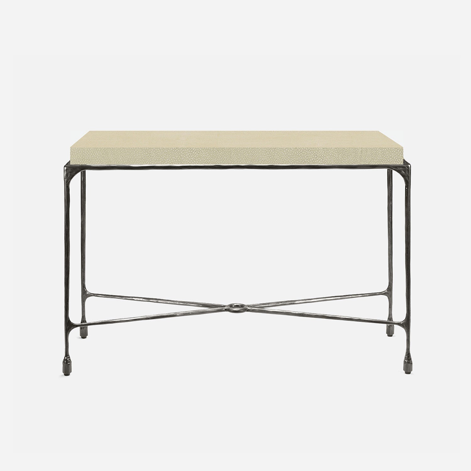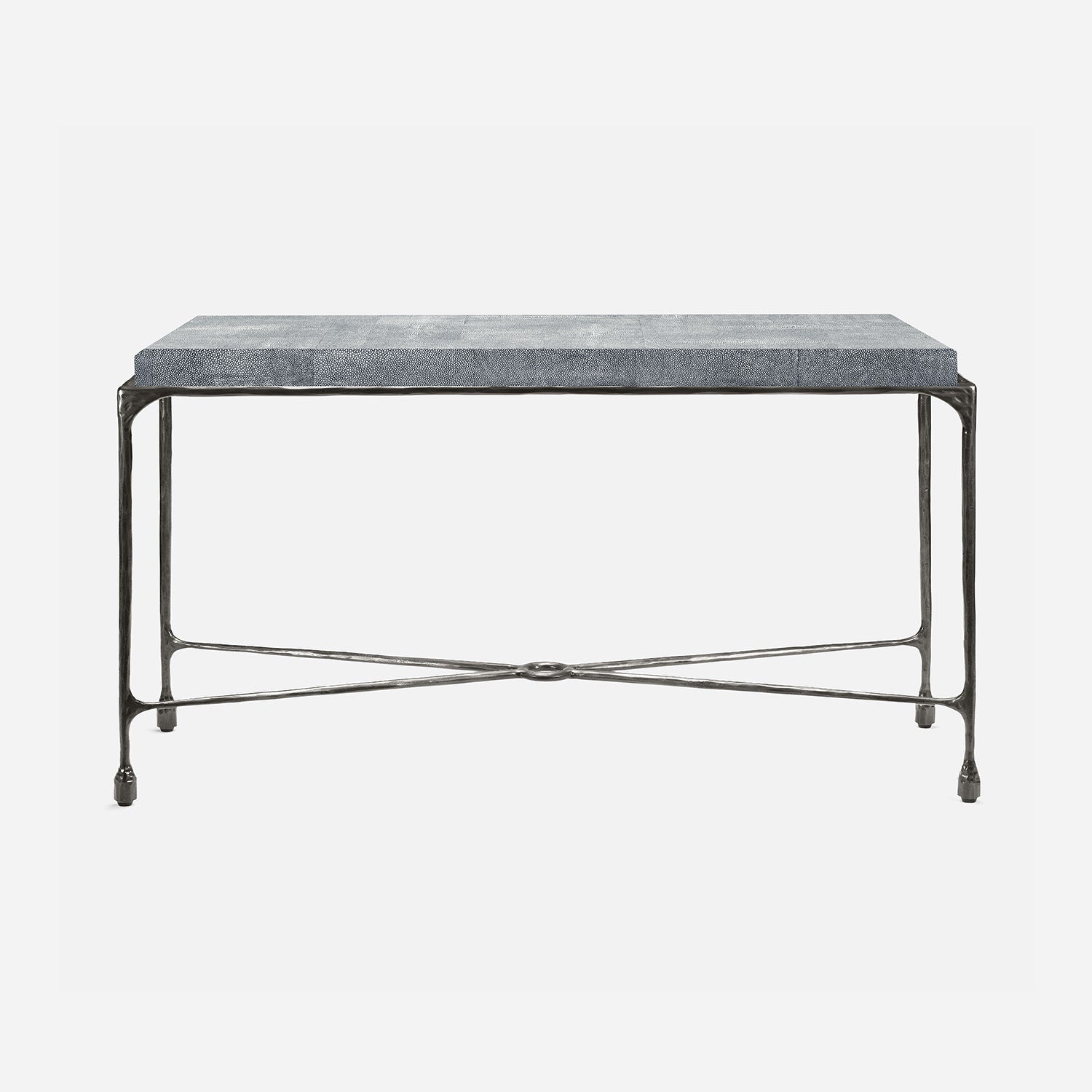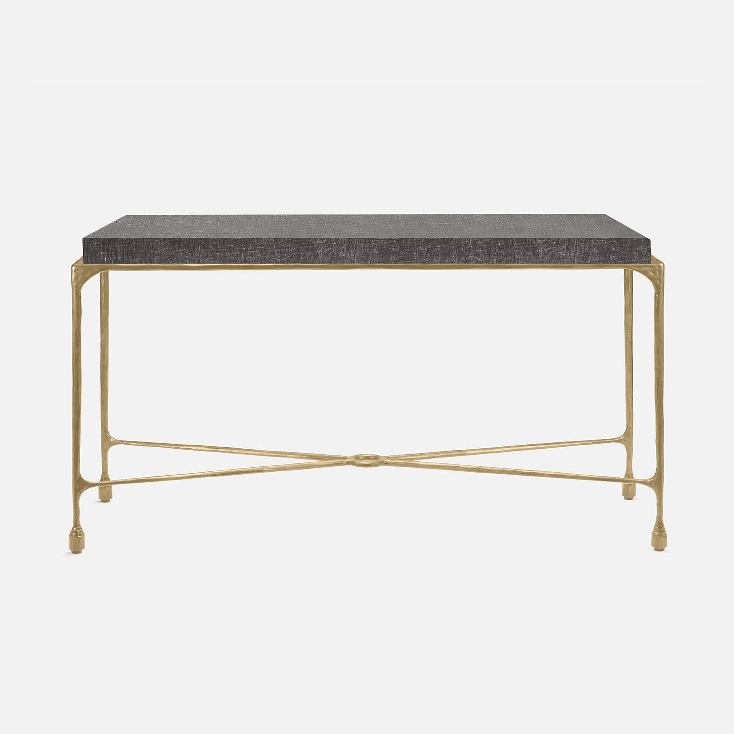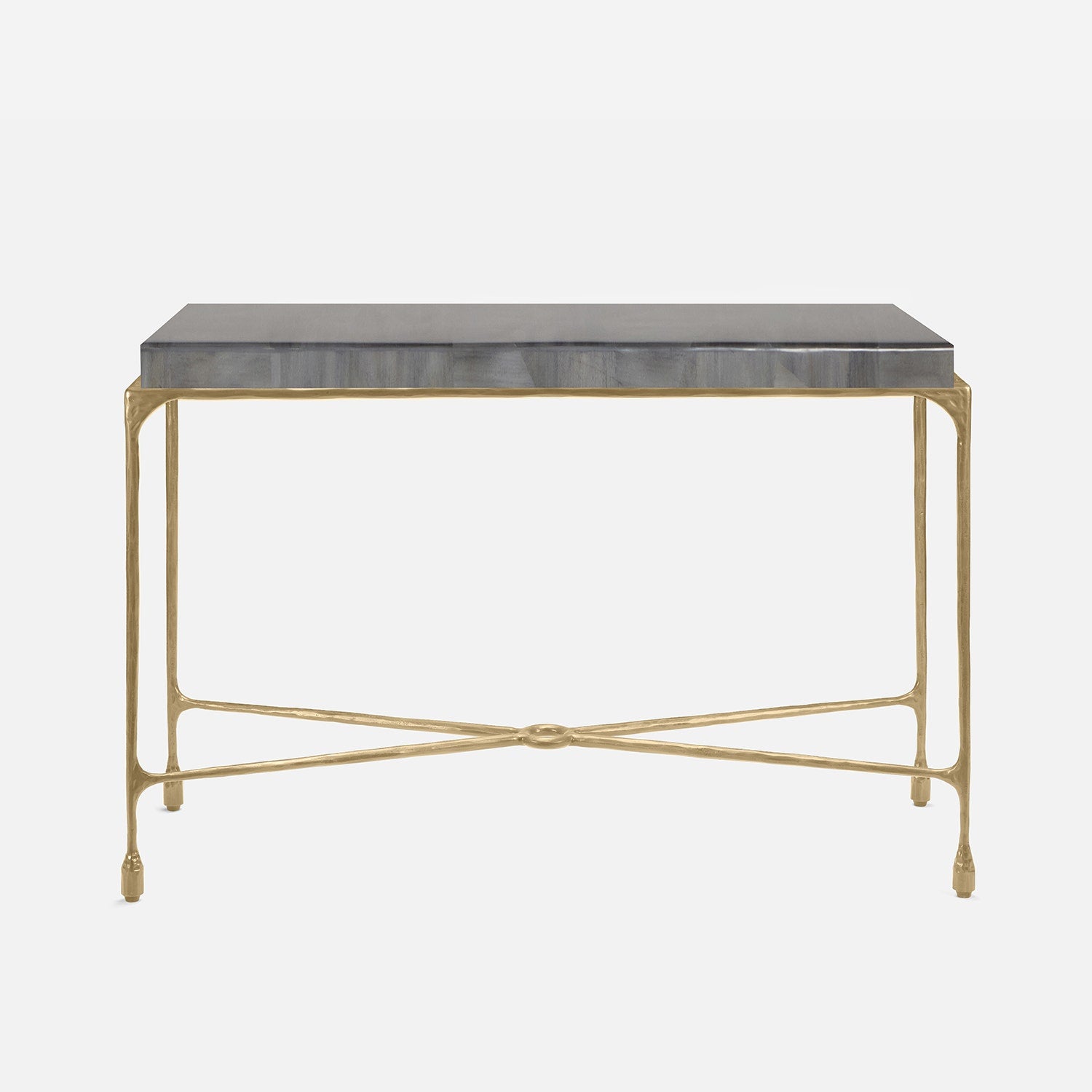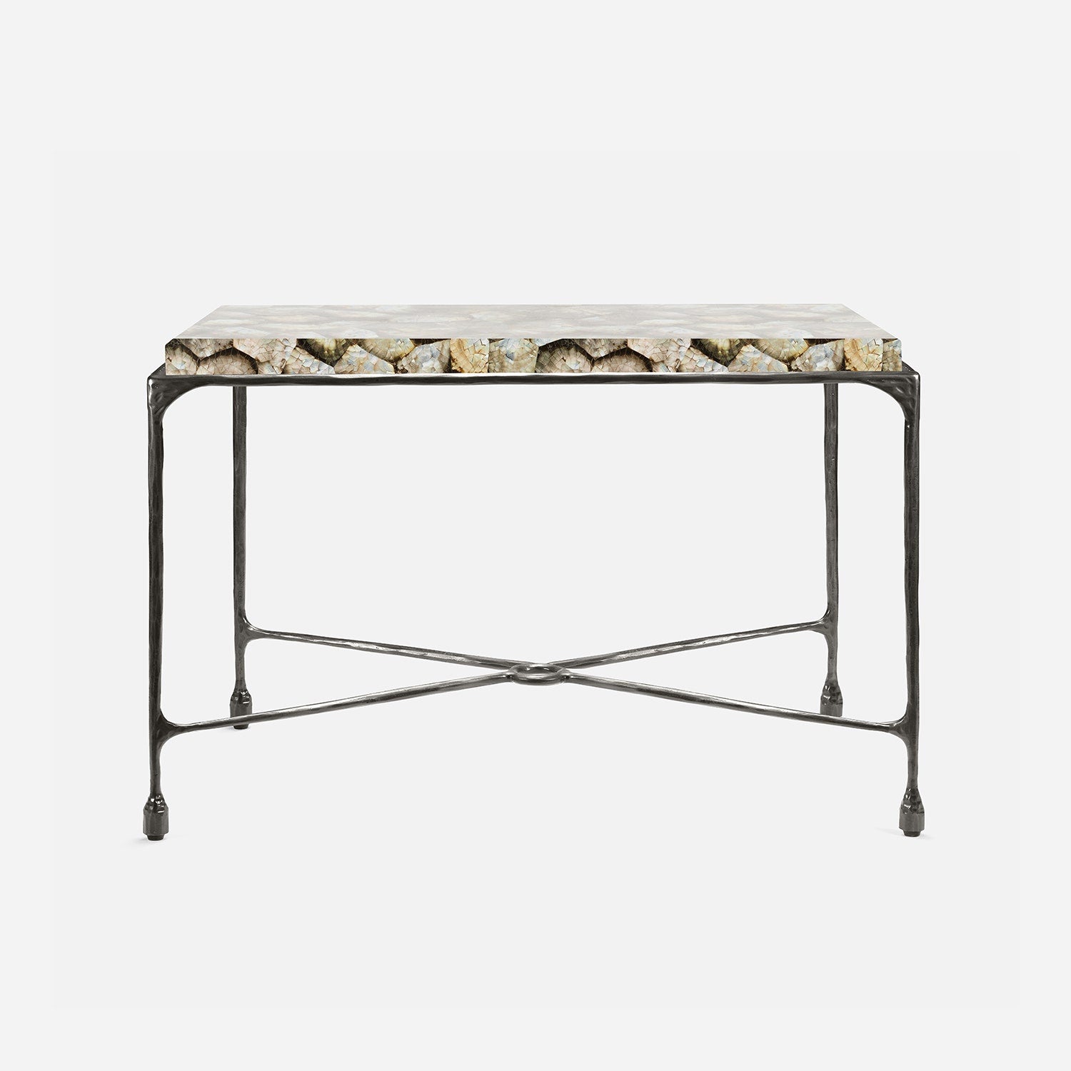 Chiseled from iron in a sleek sheen, the Owen console adds a subtle gleam to a room. An X-shaped structure and exposed ring support the adjacent legs adding an artistic touch. The consoles and tables are interchangeable, with a variety of top options available.
