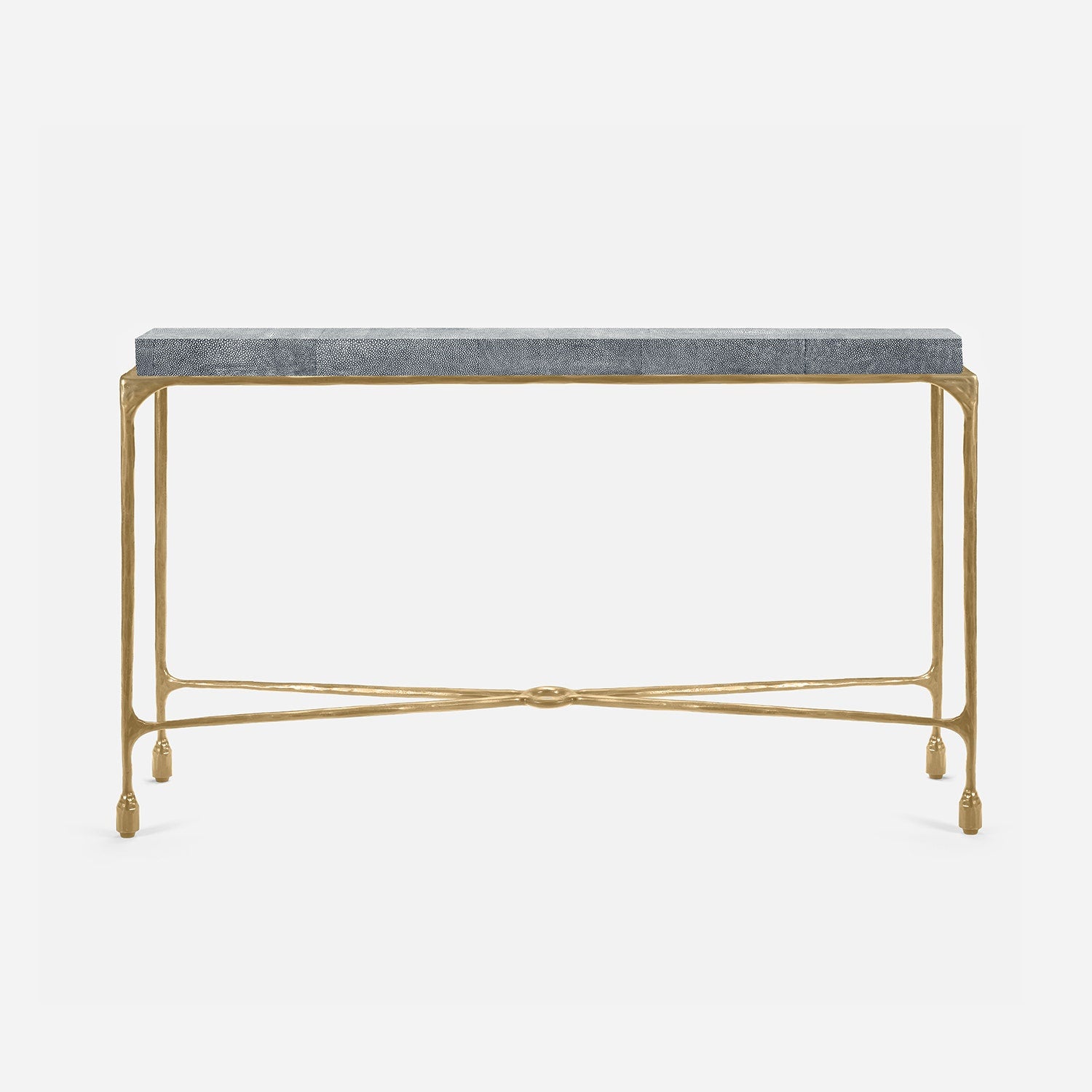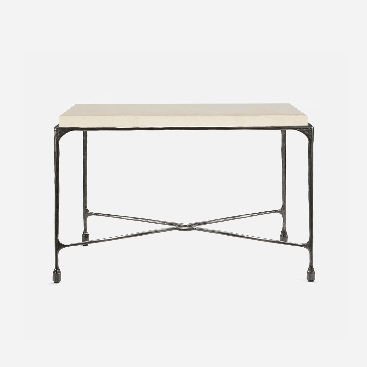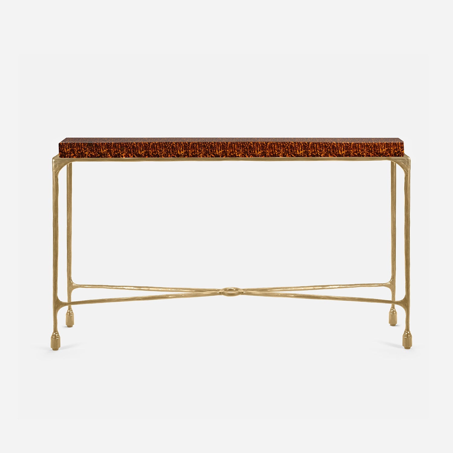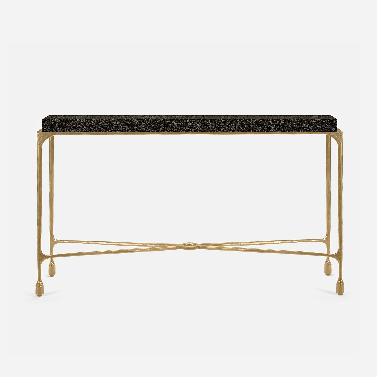 Chiseled from iron in a sleek sheen, the Owen console adds a subtle gleam to a room. An X-shaped structure and exposed ring support the adjacent legs adding an artistic touch. The consoles and tables are interchangeable, with a variety of top options available.
