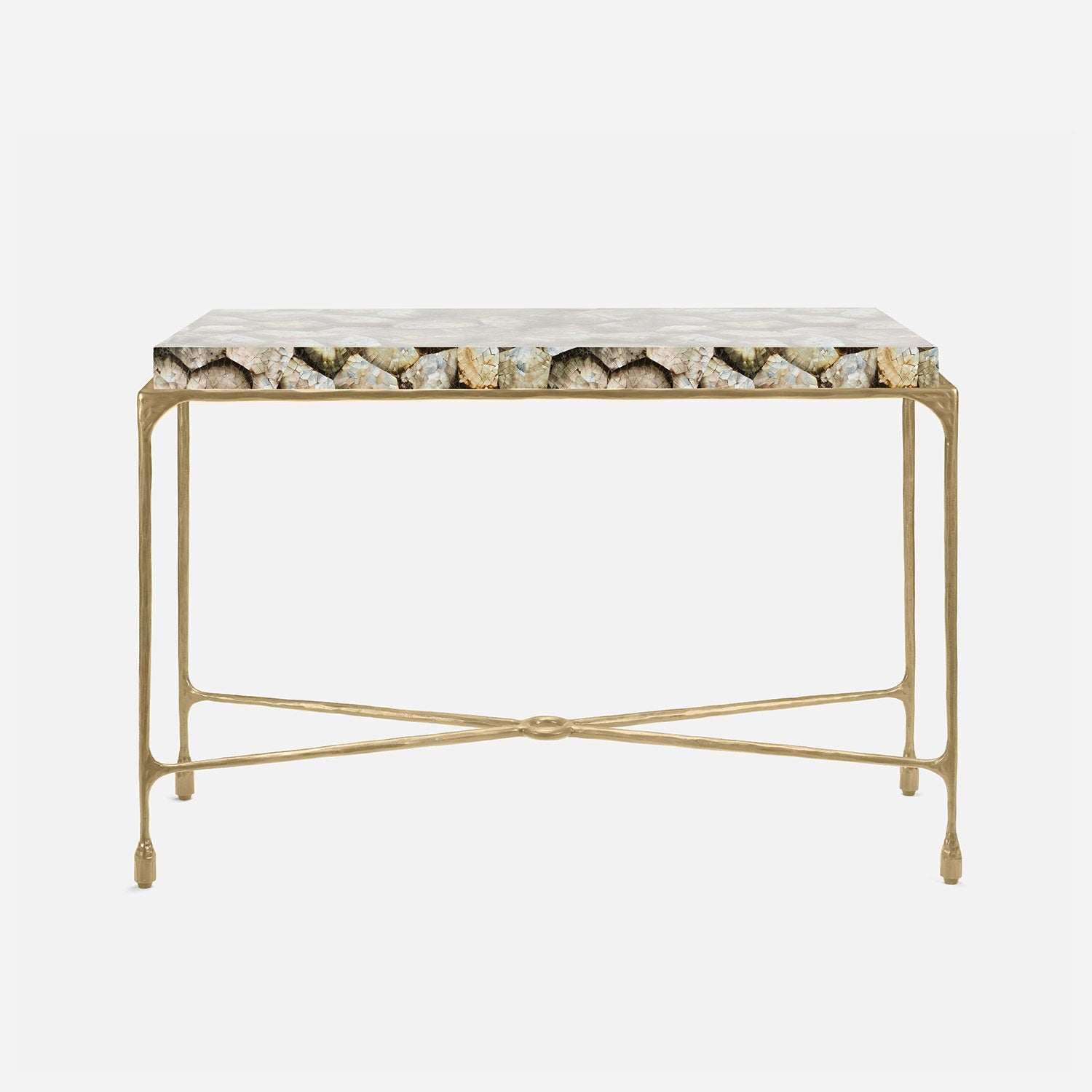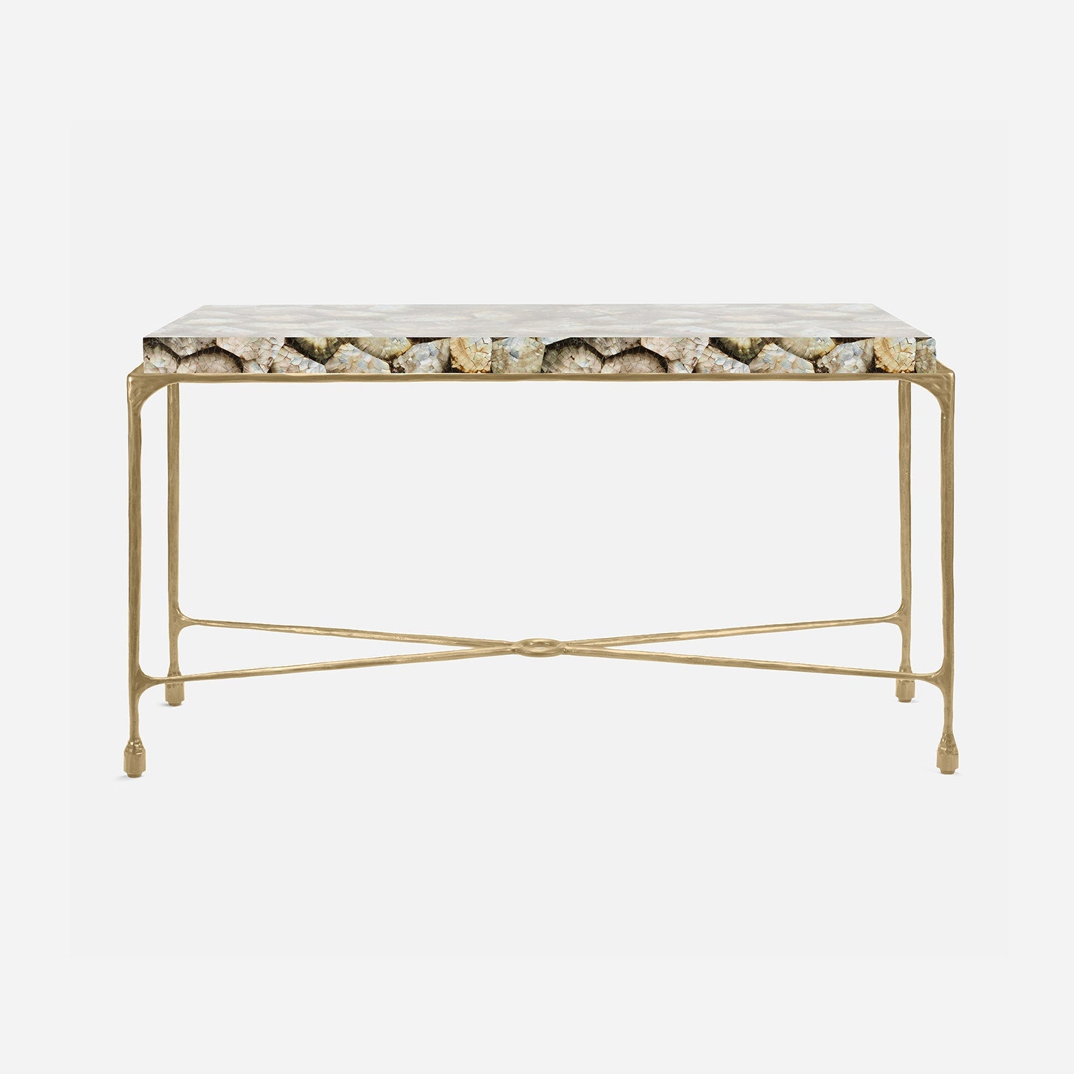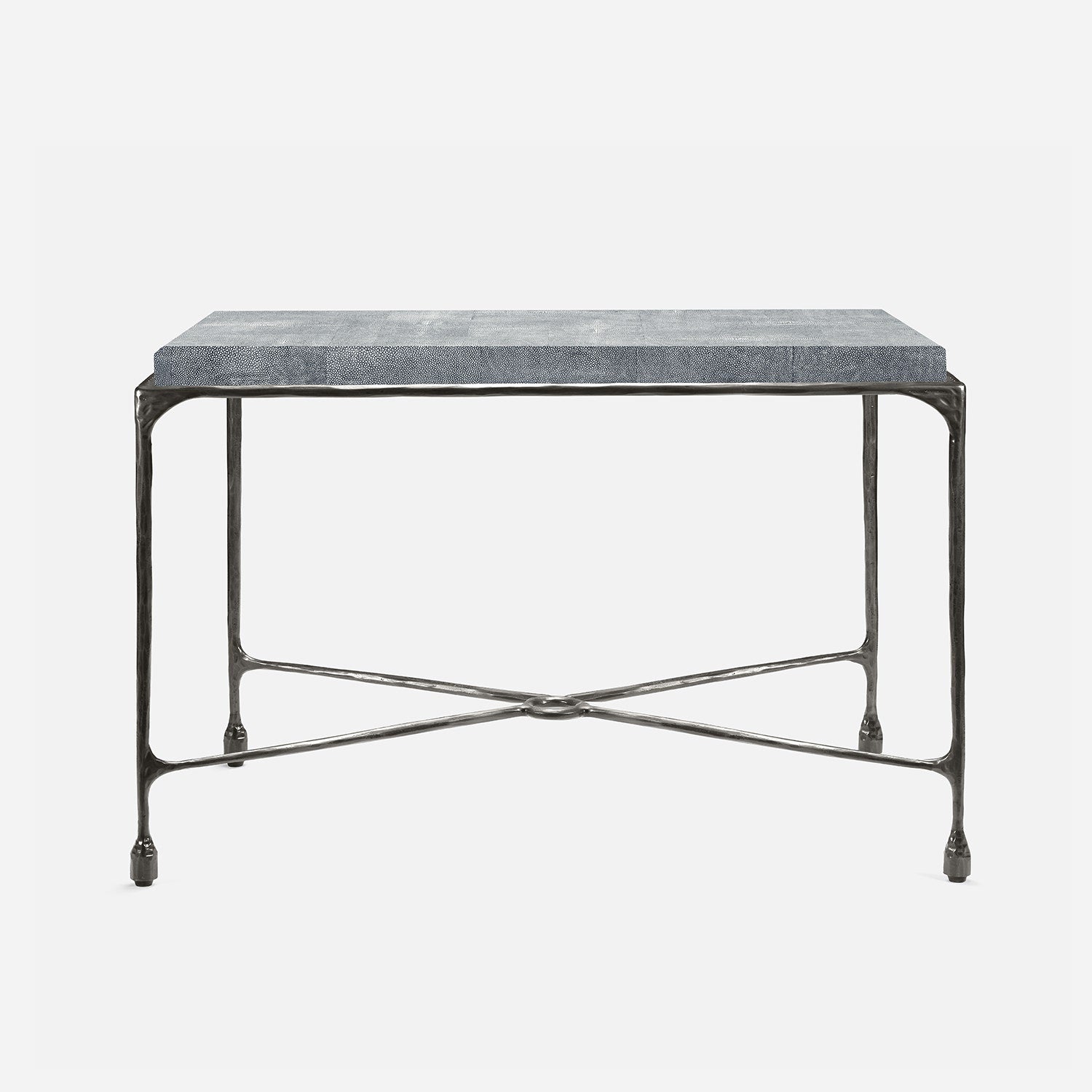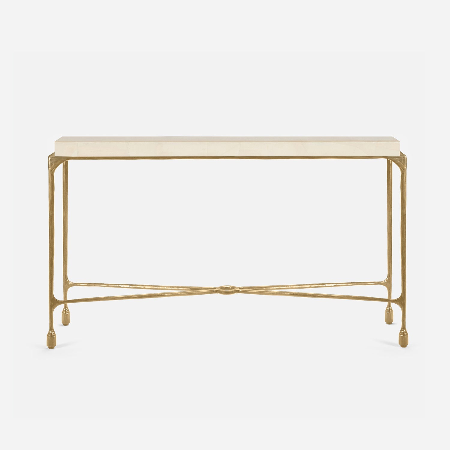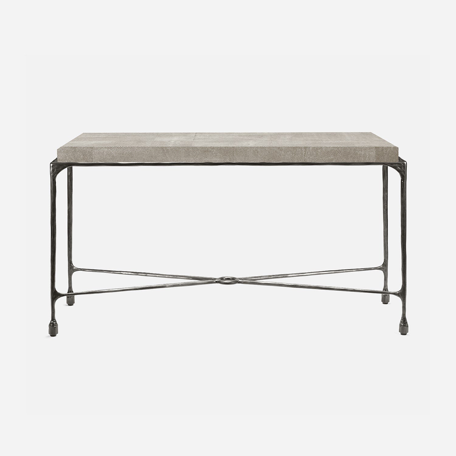 Chiseled from iron in a sleek sheen, the Owen console adds a subtle gleam to a room. An X-shaped structure and exposed ring support the adjacent legs adding an artistic touch. The consoles and tables are interchangeable, with a variety of top options available.