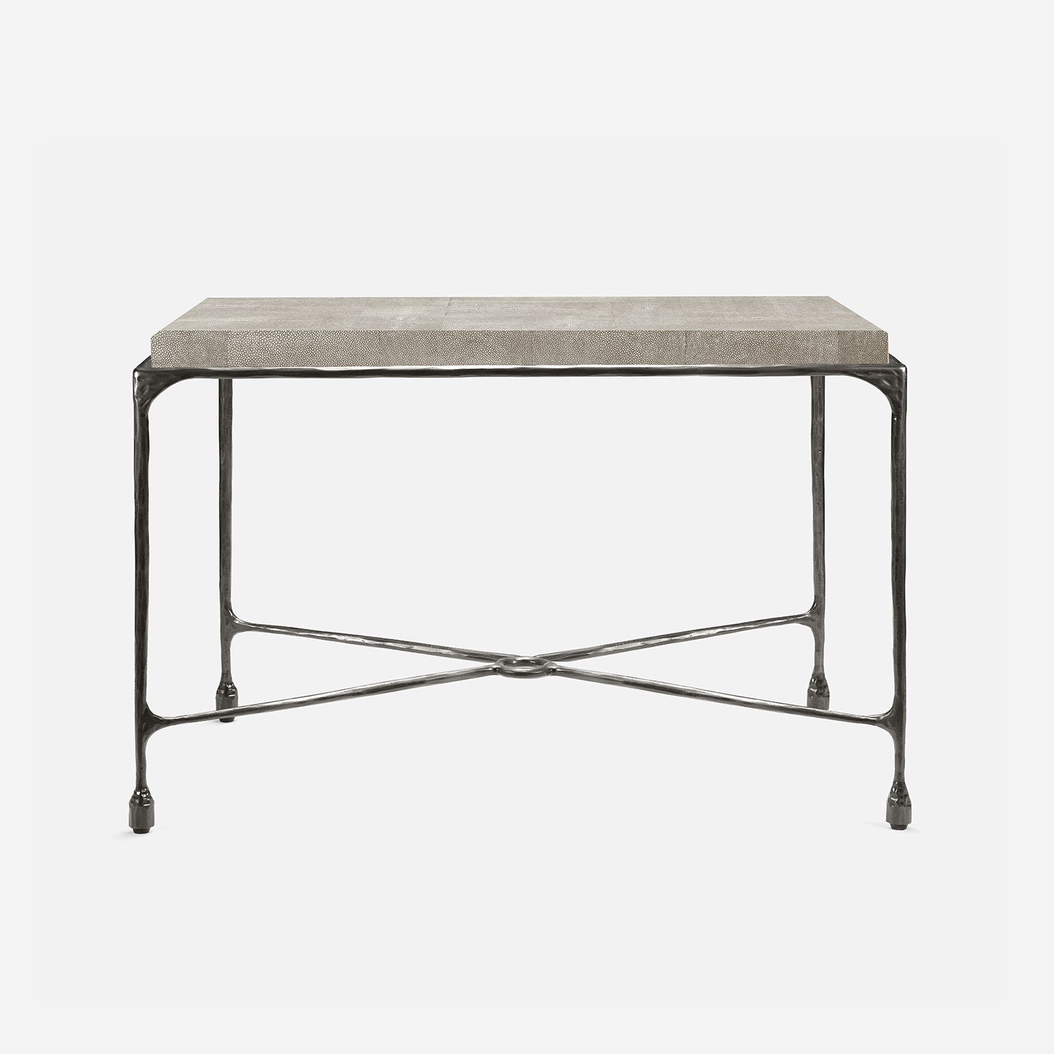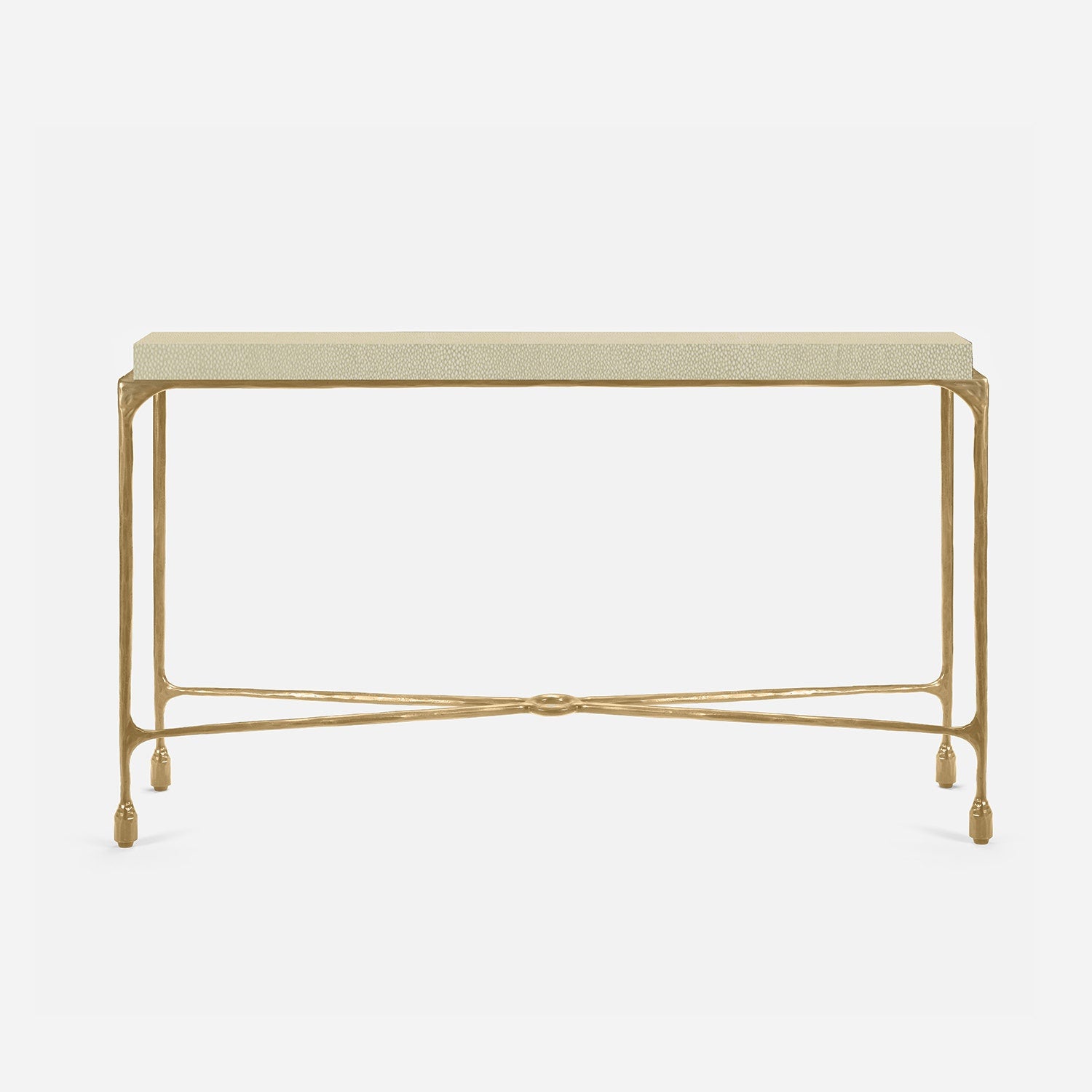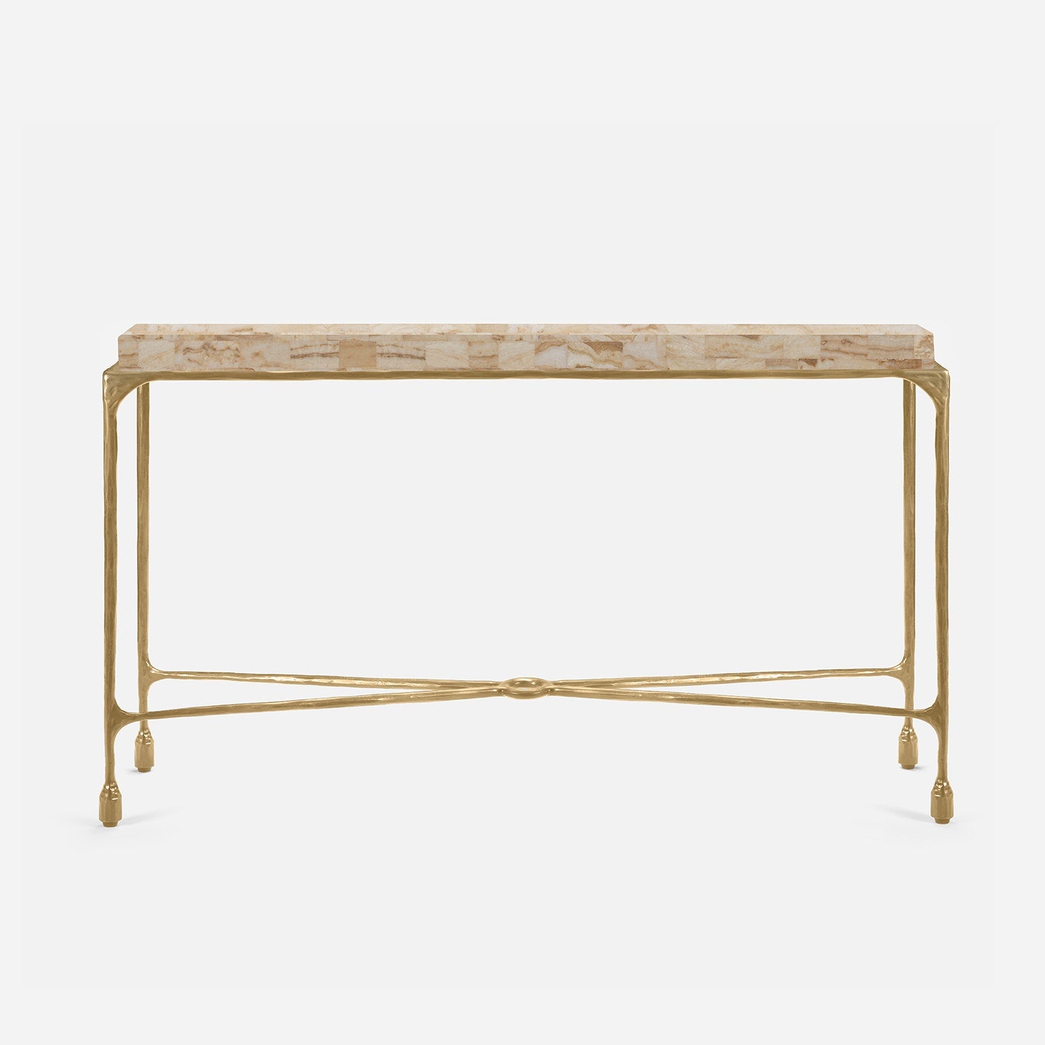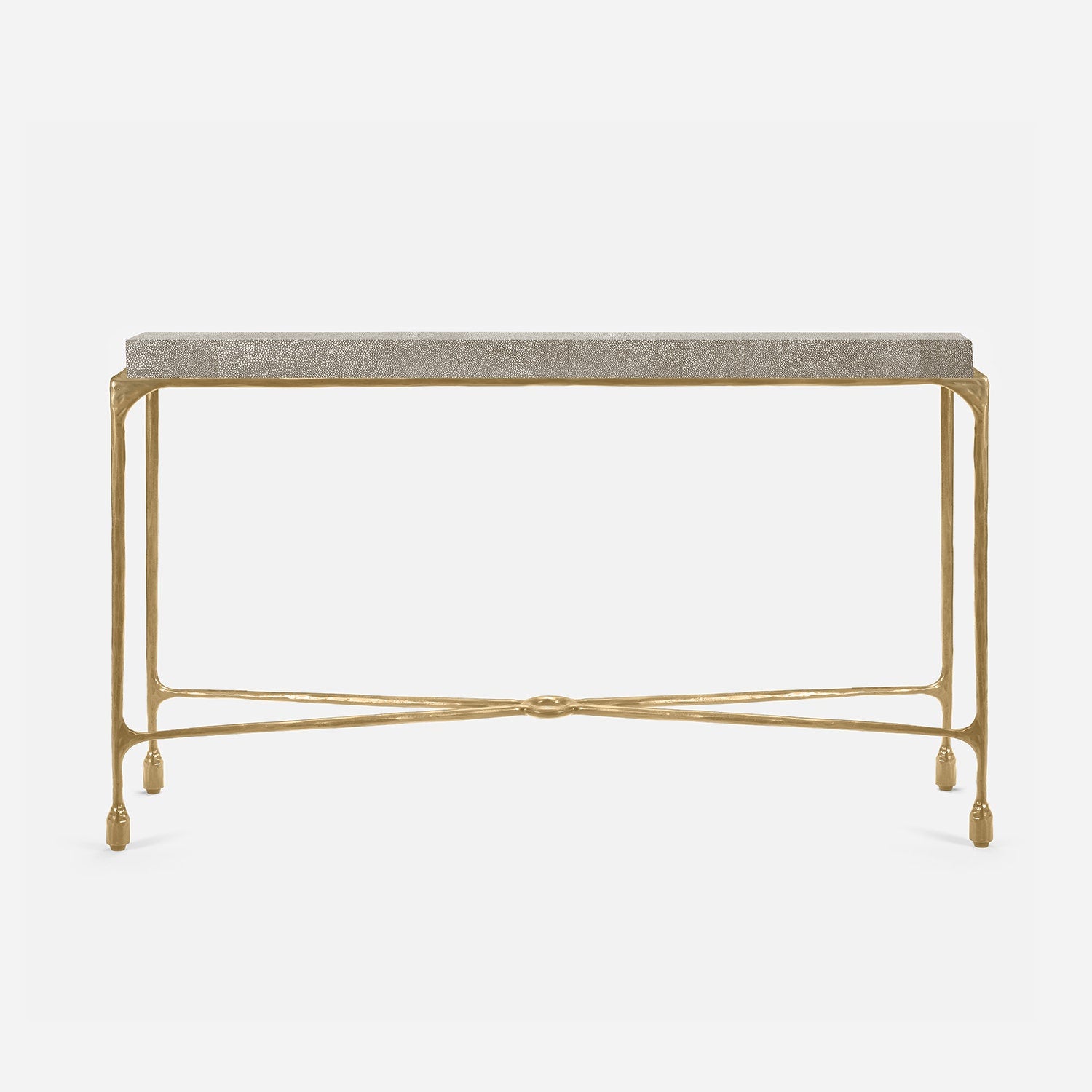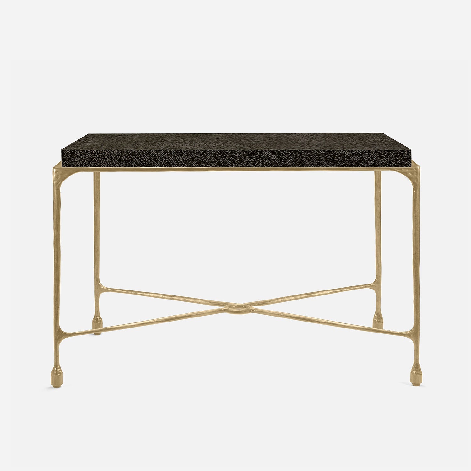 Chiseled from iron in a sleek sheen, the Owen console adds a subtle gleam to a room. An X-shaped structure and exposed ring support the adjacent legs adding an artistic touch. The consoles and tables are interchangeable, with a variety of top options available.
