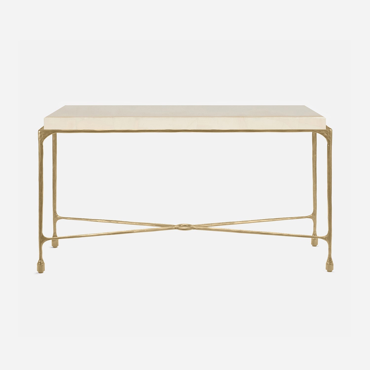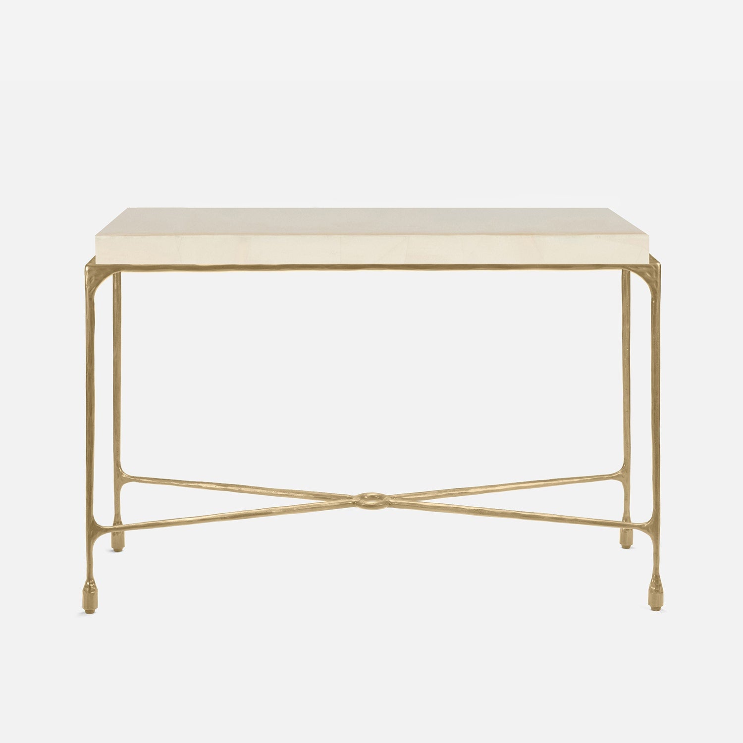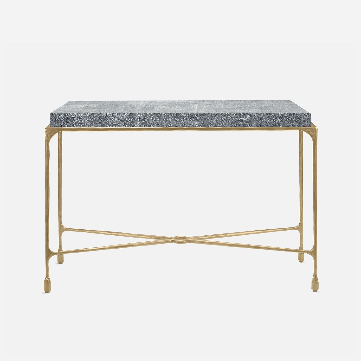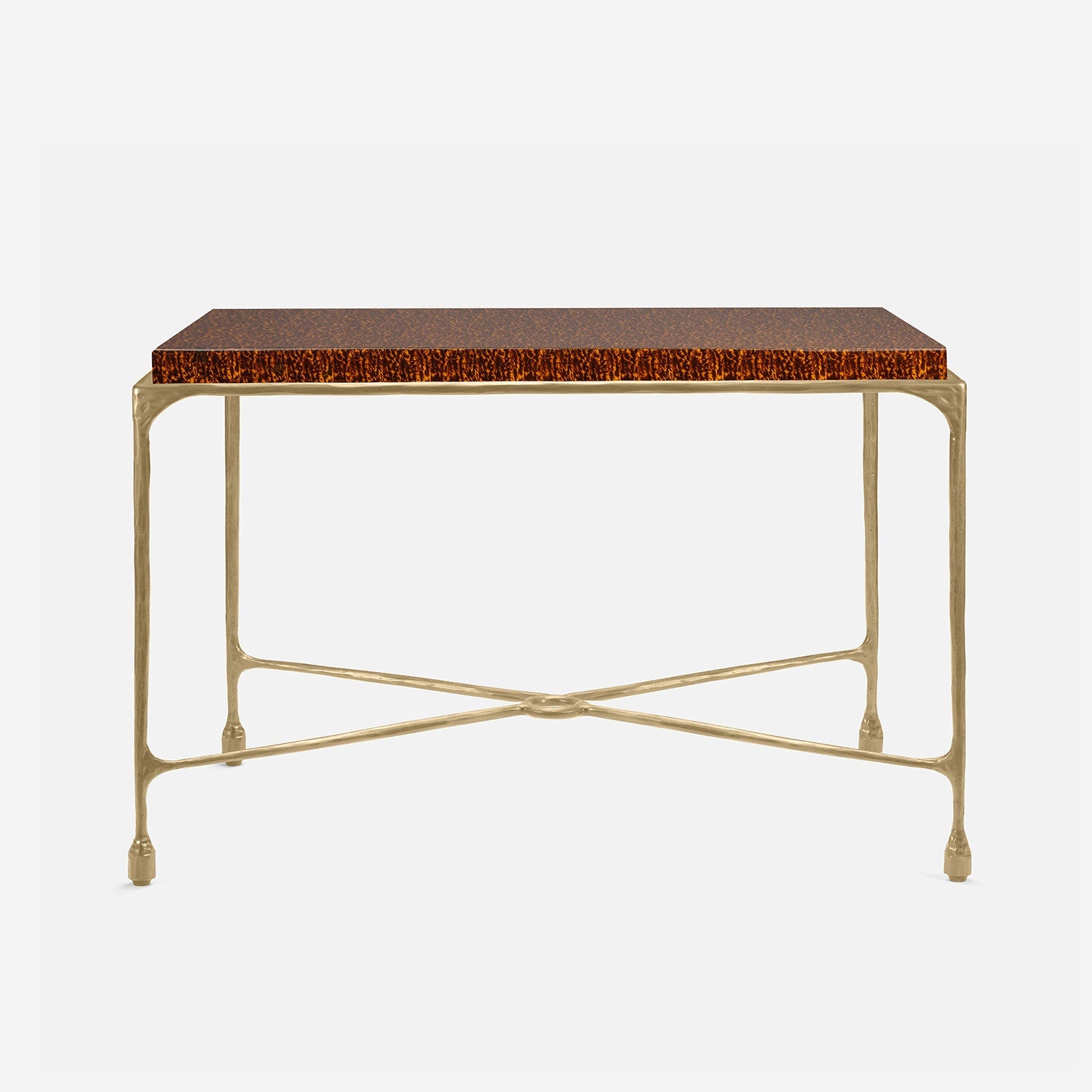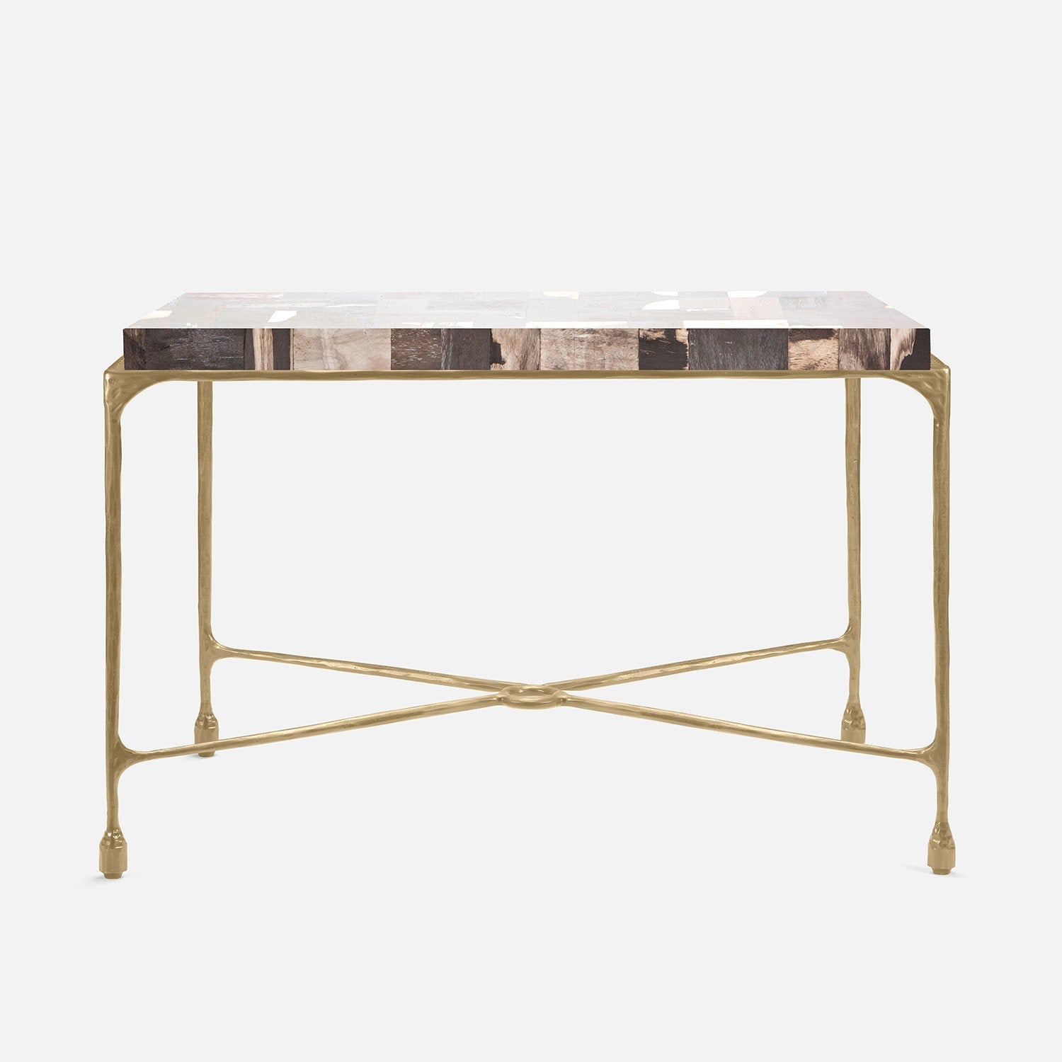 Chiseled from iron in a sleek sheen, the Owen console adds a subtle gleam to a room. An X-shaped structure and exposed ring support the adjacent legs adding an artistic touch. The consoles and tables are interchangeable, with a variety of top options available.