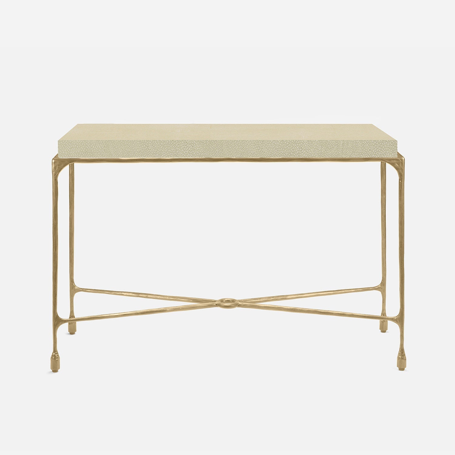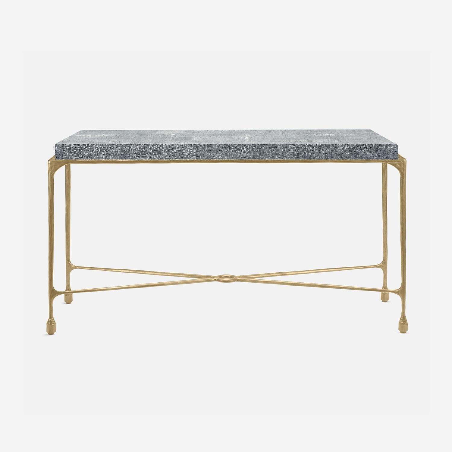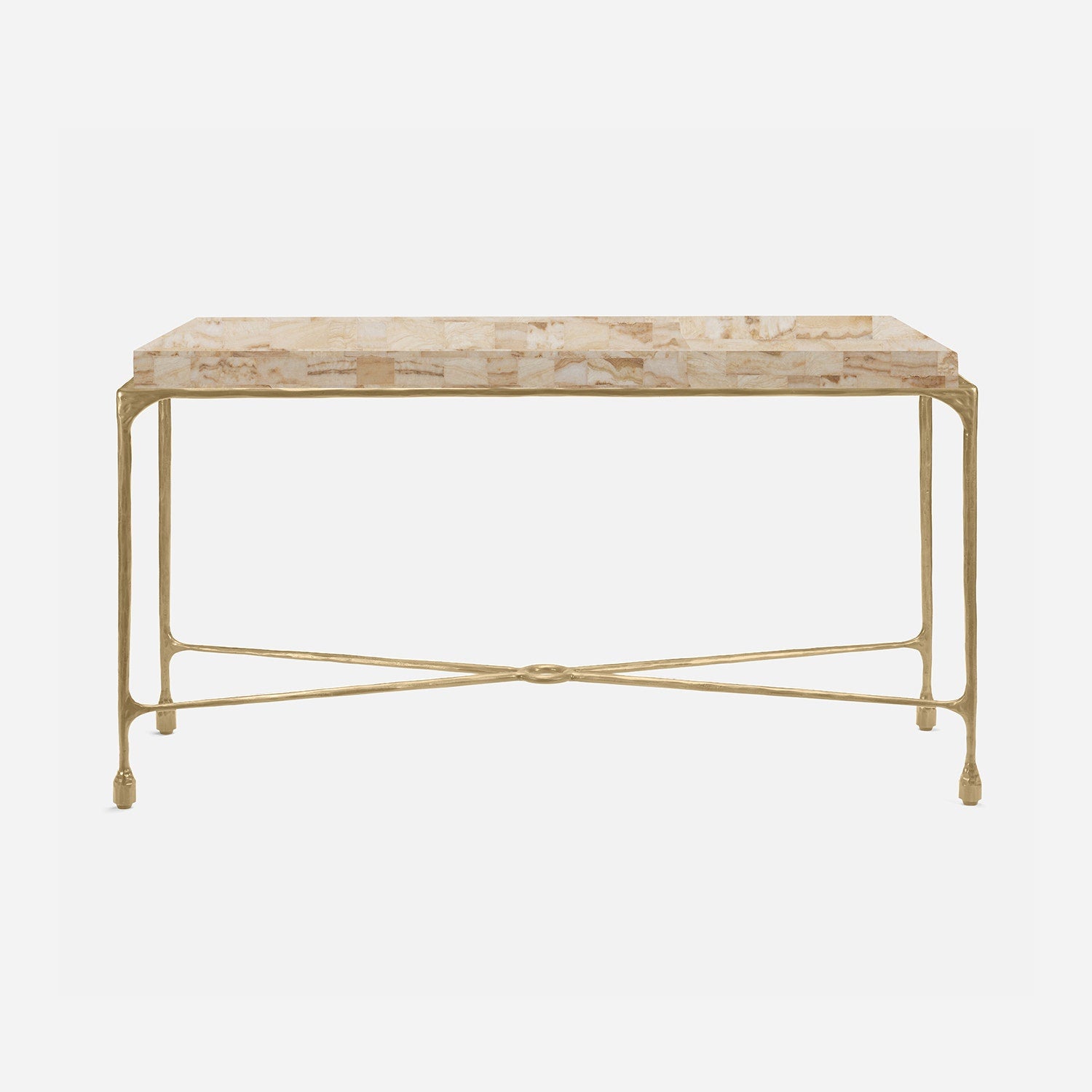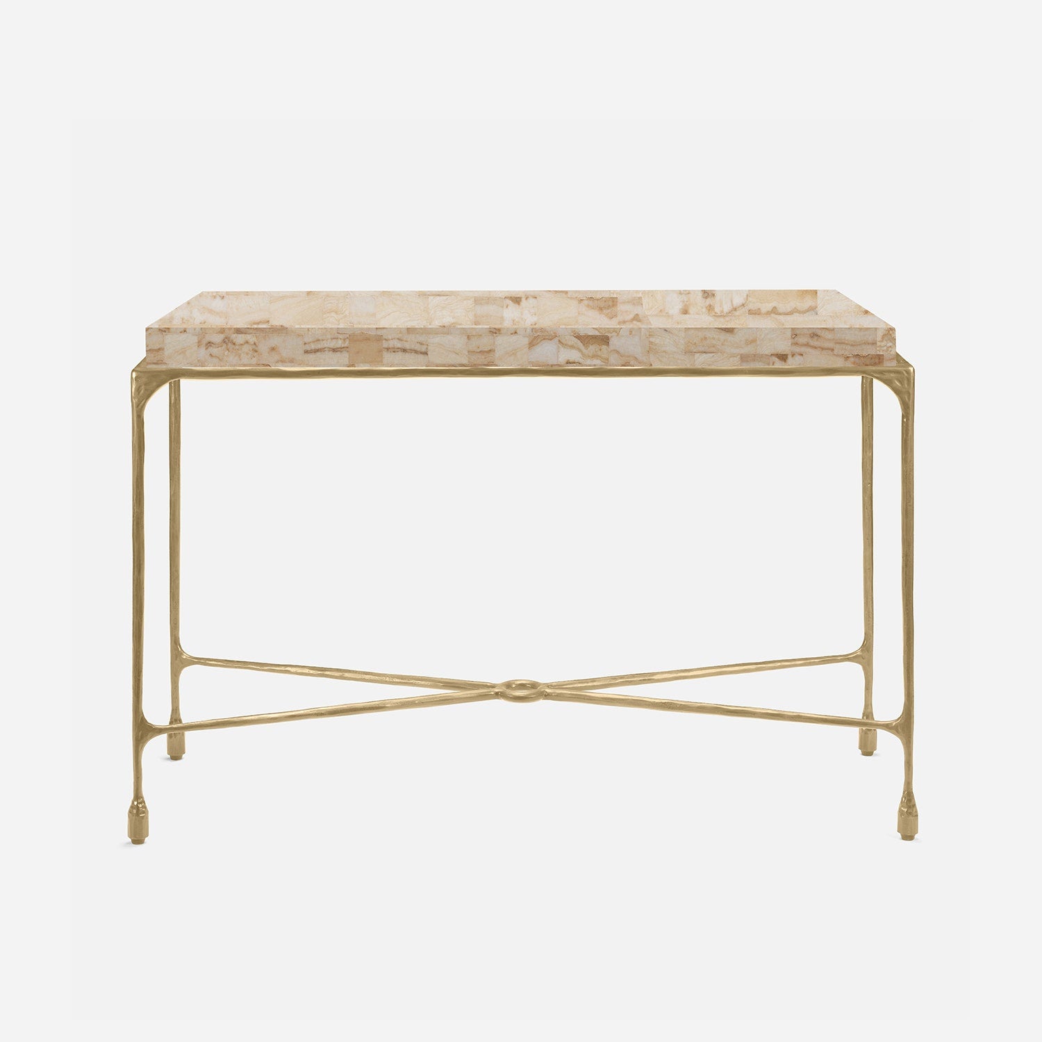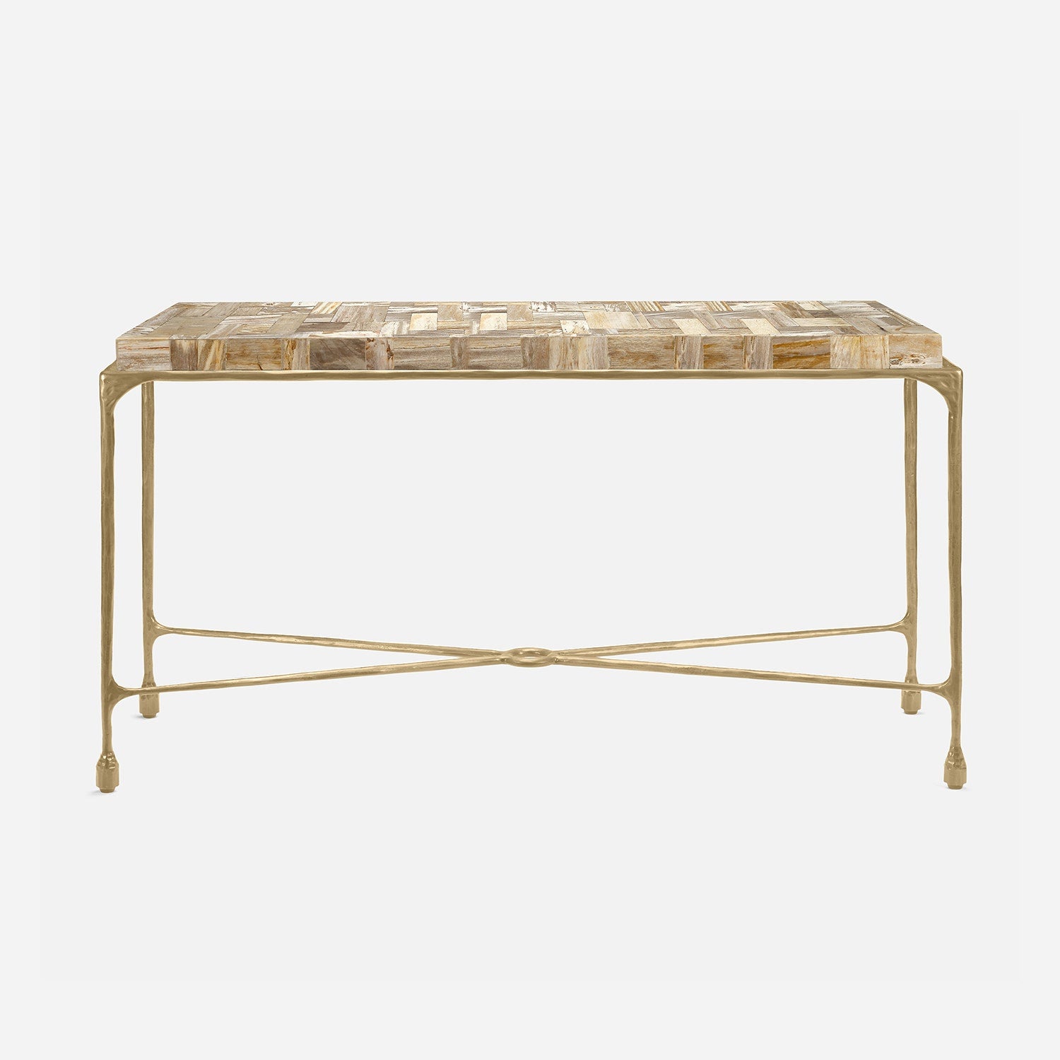 Chiseled from iron in a sleek sheen, the Owen console adds a subtle gleam to a room. An X-shaped structure and exposed ring support the adjacent legs adding an artistic touch. The consoles and tables are interchangeable, with a variety of top options available.