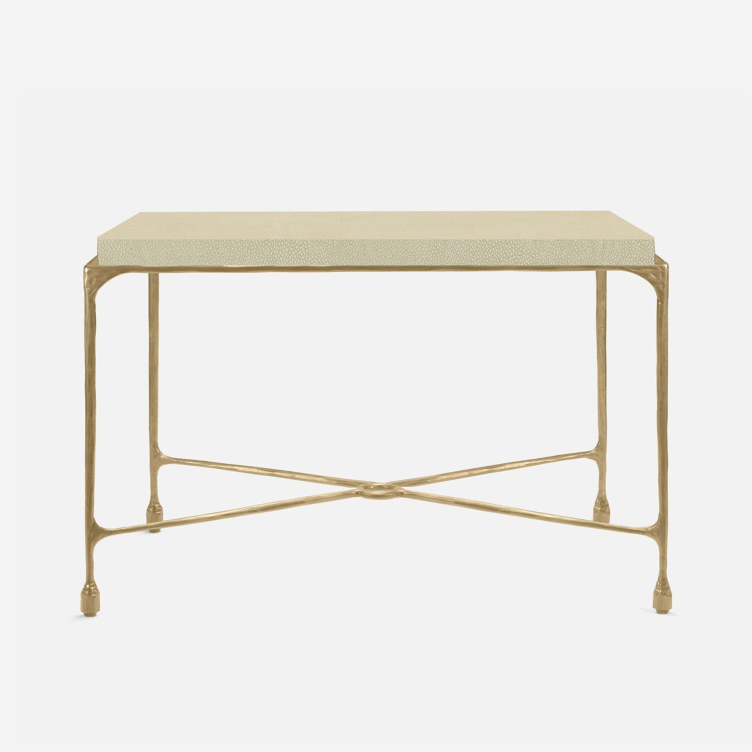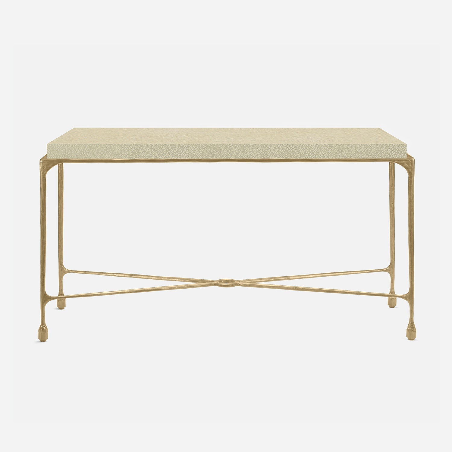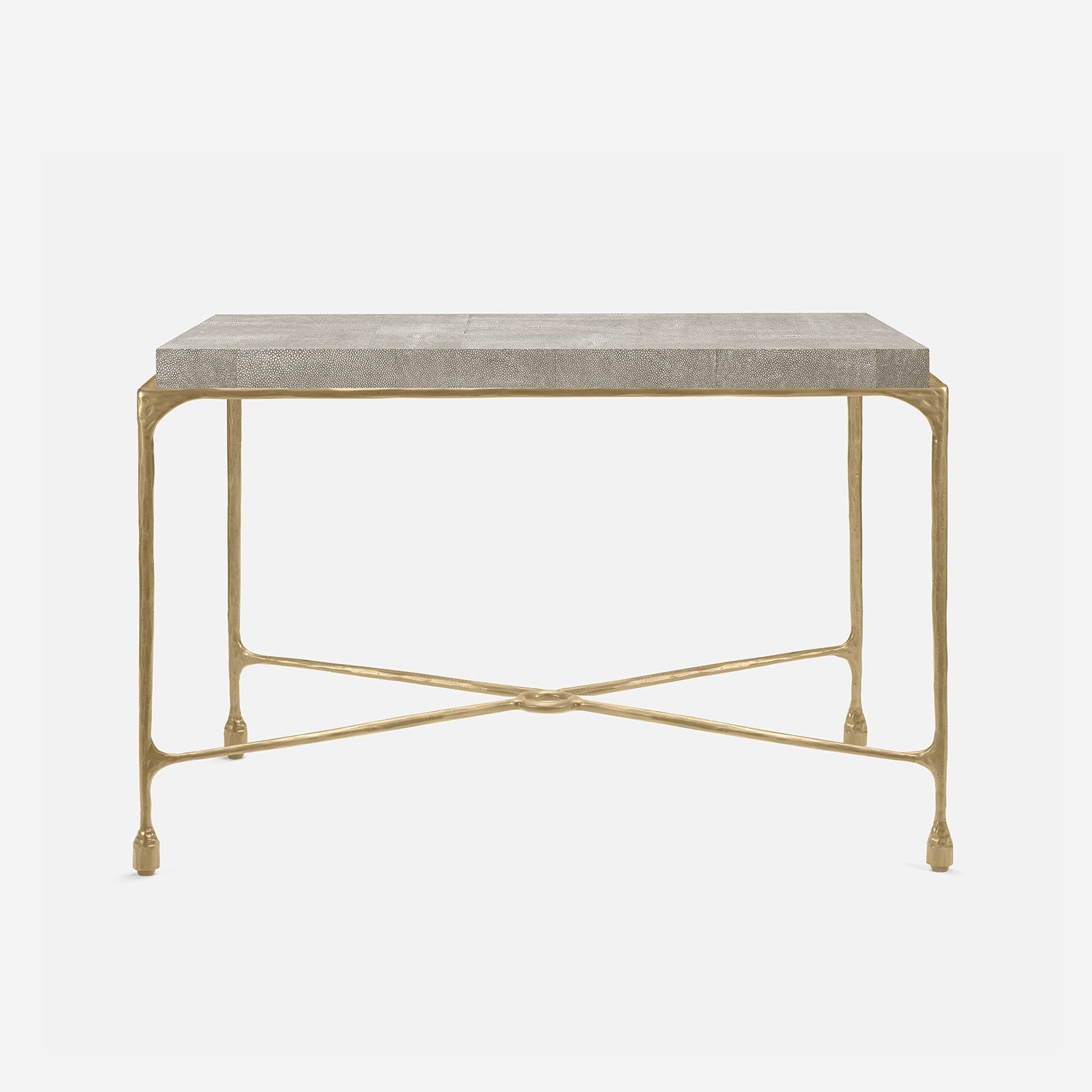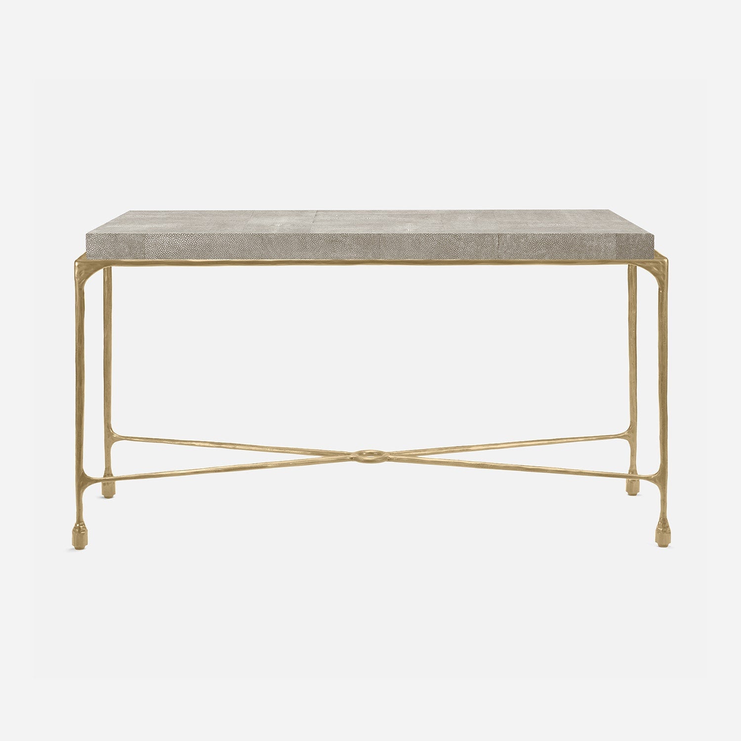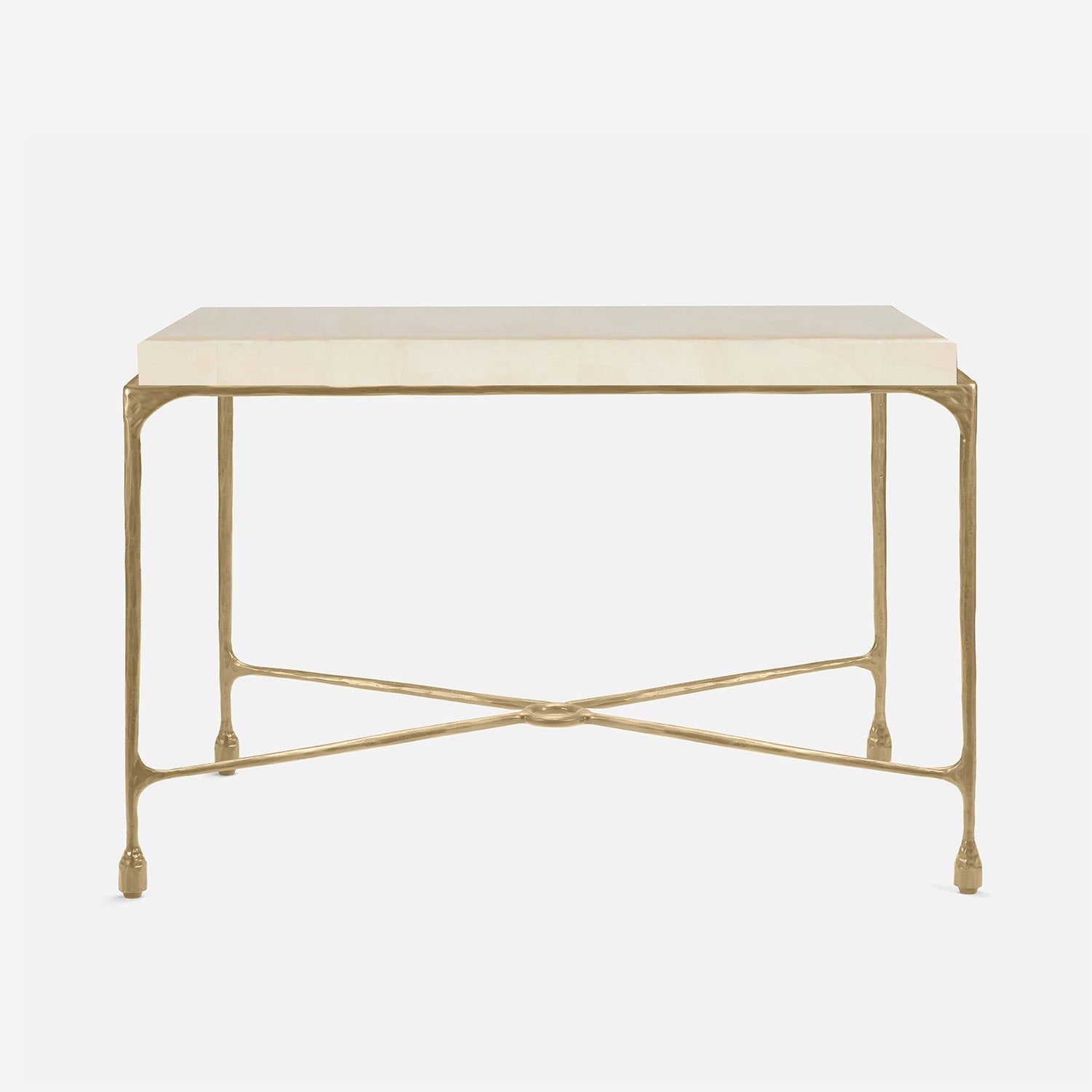 Chiseled from iron in a sleek sheen, the Owen console adds a subtle gleam to a room. An X-shaped structure and exposed ring support the adjacent legs adding an artistic touch. The consoles and tables are interchangeable, with a variety of top options available.