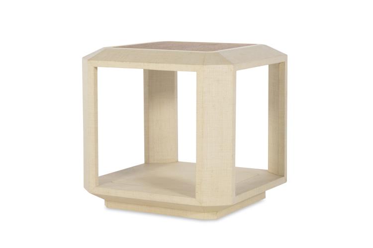 The Randolph End Table from Century’s Grand Tour collection is fully wrapped in cream raffia, with a natural-finish oak inset top. This elegant piece combines rich textures and materials, making it a stylish and versatile addition to any living space.