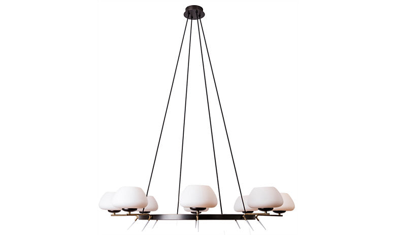 The scale of the Gualala Circular Chandelier at 48" in diameter, creates a dramatic centerpiece and is a study in material and repetition. Exclusively designed by Jonathan Browning for McGuire, the Gualala Circular Chandelier dons eight unglazed white bisque porcelain shades, reminiscent of weathered river rock, encasing each light and elegantly diffusing it to cast a golden glow. The Gualala designs are known for mixing two metal finishes - oil rubbed bronze and lite antique brass - as well as a striking white metal horn to embody that timeless 1970s cool. 6" dia plate finishes the design, as thoughtfully created as the rest of the components.