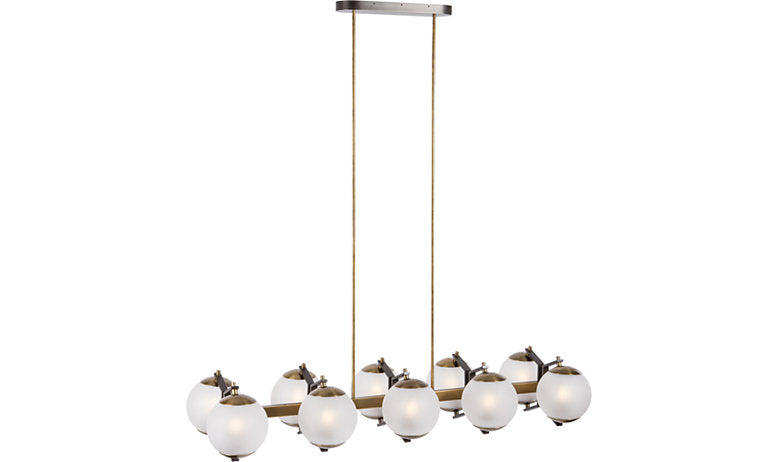 The Limantour Linear Chandelier, exclusively designed by Jonathan Browning for McGuire, has a powerful presence at 56" in length. Coupled with ten dramatic shades of 8.375" in diameter, the Limantour easily becomes the jewel in the room. The sand-blasted glass on the exterior of the shades is reminiscent of weathered sea glass found along the sandy beaches of Limantour, CA; the result glows with a quiet strength. Oil rubbed bronze finish on the rectangular ceiling plate and lite antique brass finish on the ten arms/shade covers combine effortlessly over the solid steel frame to complete this exclusive design.
